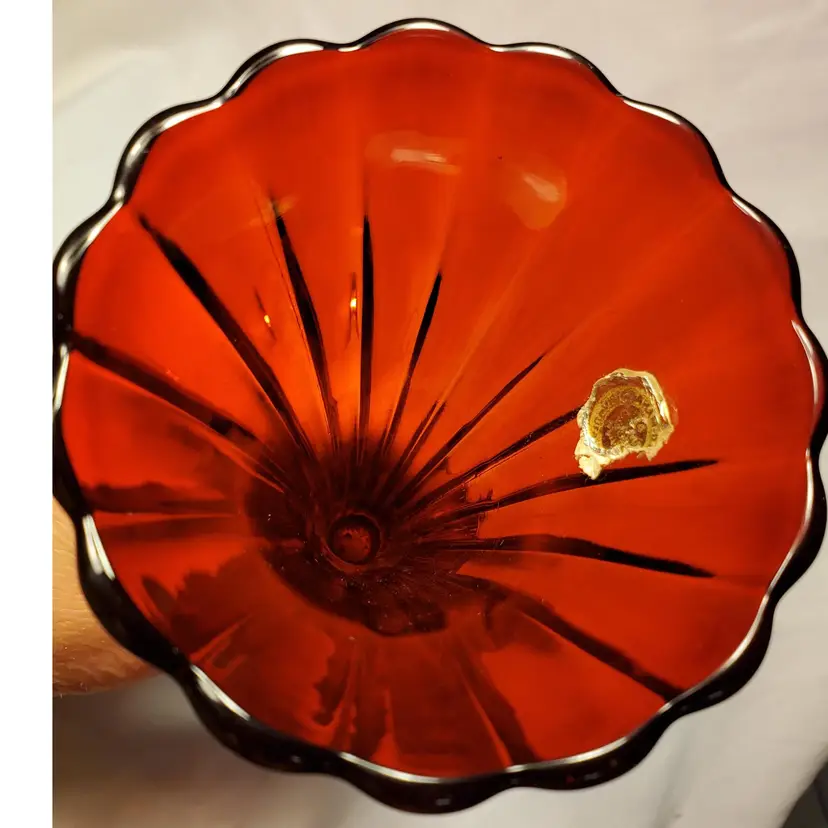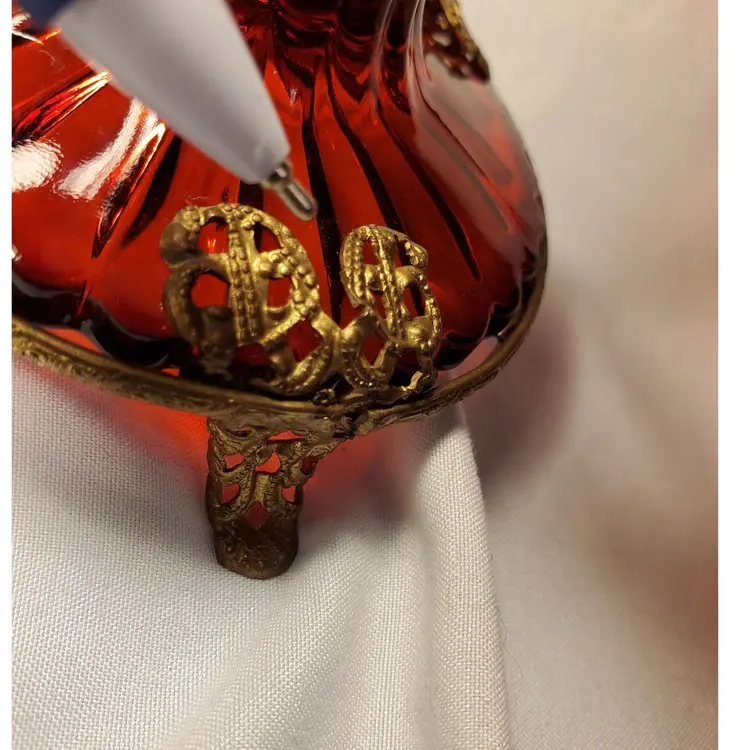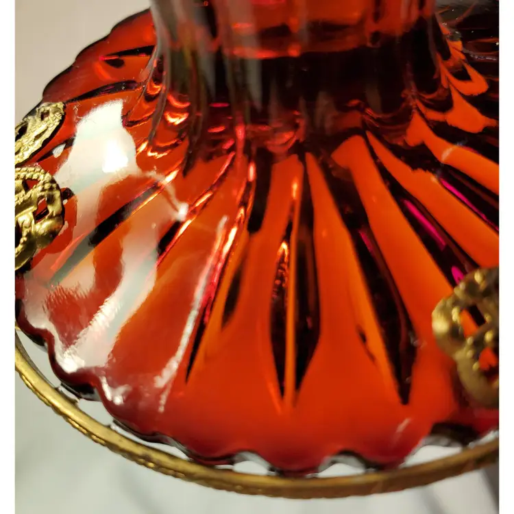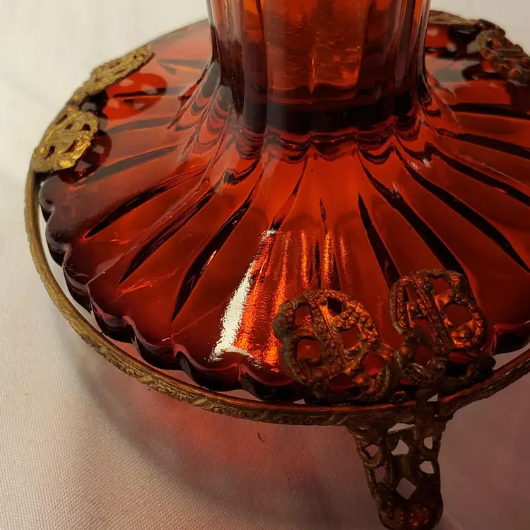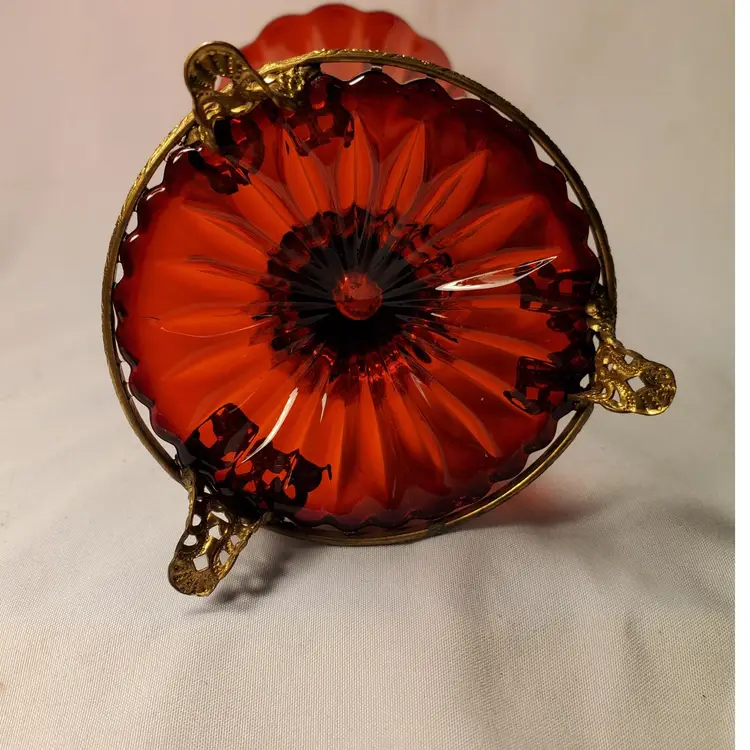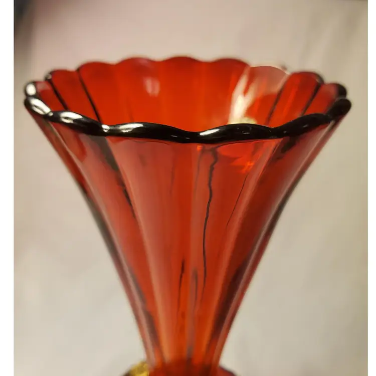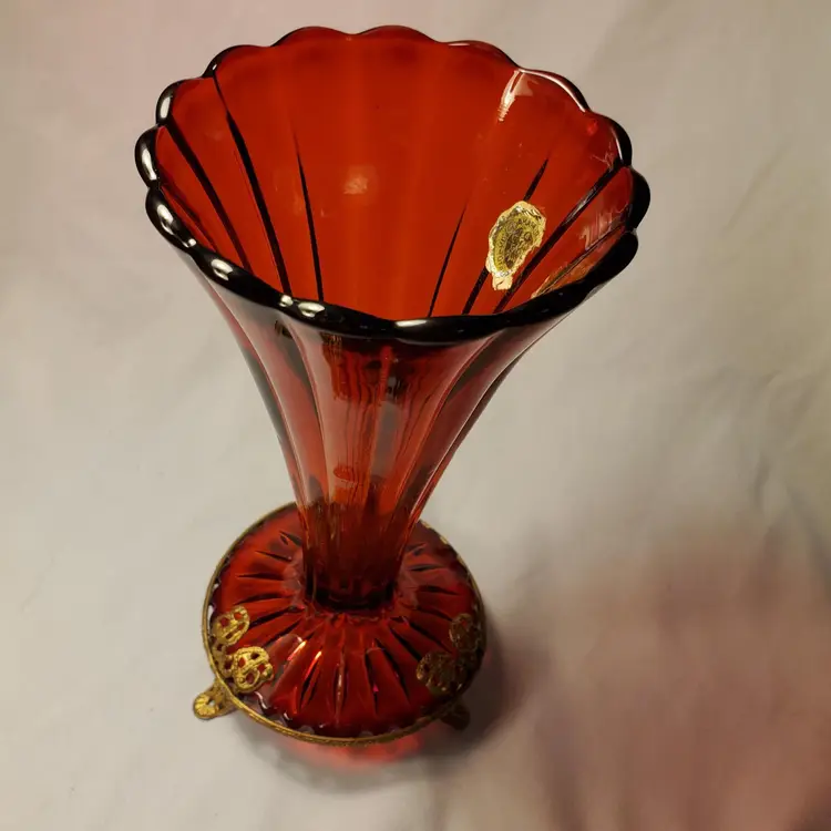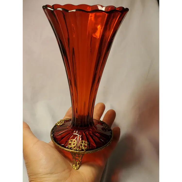 Early Art Noveau era beautiful rich red glass ribbed, flared, scalloped vase encased in a brass, three footed ornate stand. Early 1900s pc.( 3 piece mold) this is In beautiful condition. Measures 6.5 " tall. Opening measures 3.25" manufacred under the name Graham manufacturing (Graham 24). No chips or cracks. one of the brass base( top grip prong) is very slightly bent. Does not effect standing stands level. See picture. Free shipping no combined on this. It will go priority mail.