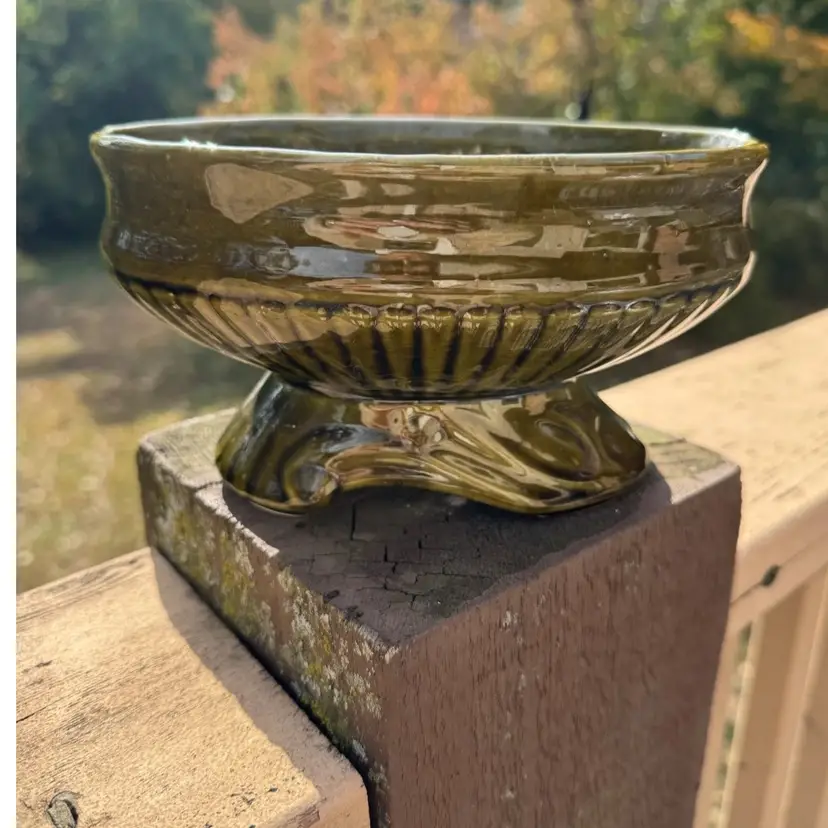 Awesome 1970s olive or moss green planter. Beautiful vintage condition. A few glaze skips while being made. Measures 4 inches tall and 7 1/2 inches wide by 5 inches.