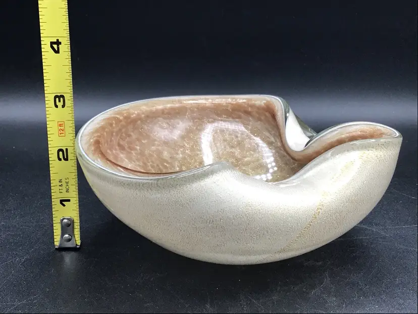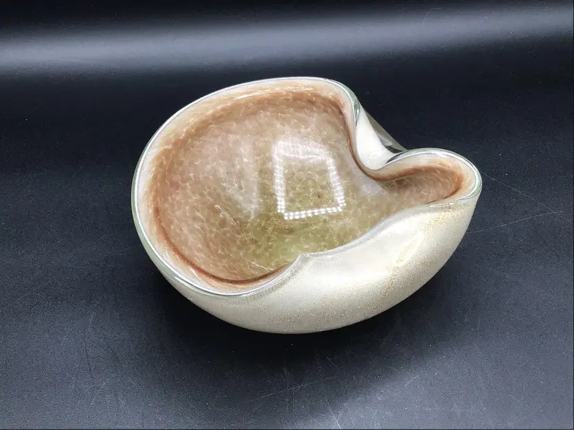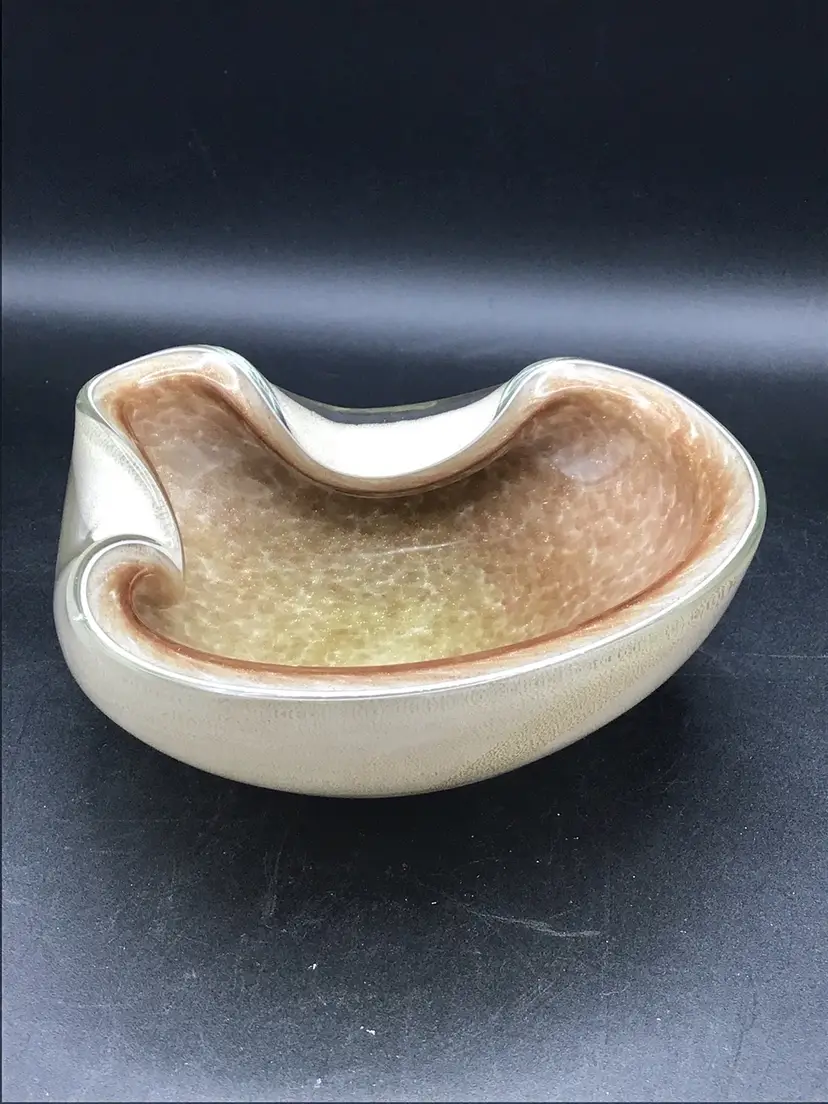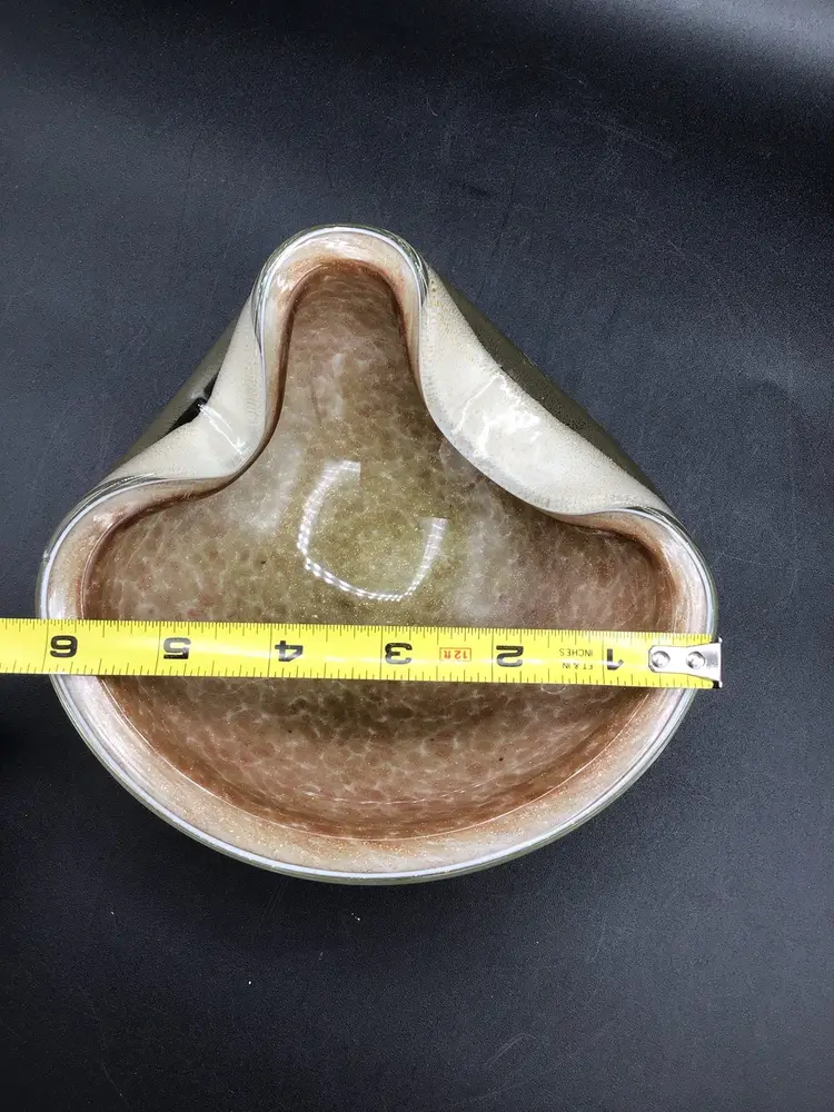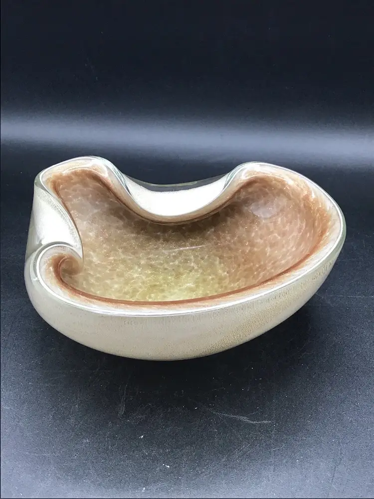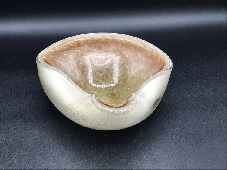 This stunning glass bowl was made in Italy and is attributed to Murano. There are no chips, cracks, or flea bites. This is in excellent condition. There is extensive gold flecks in the finish on the inside of the bowl. The bottom is smooth in polished. Please see pictures for complete description, measurements and condition.