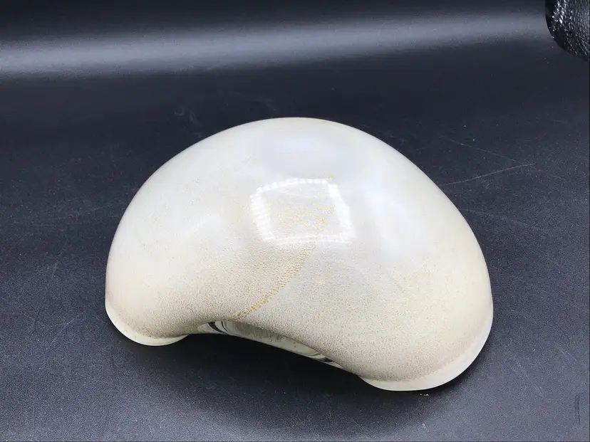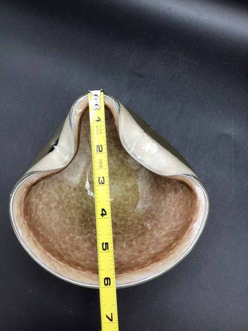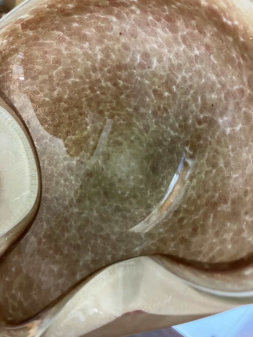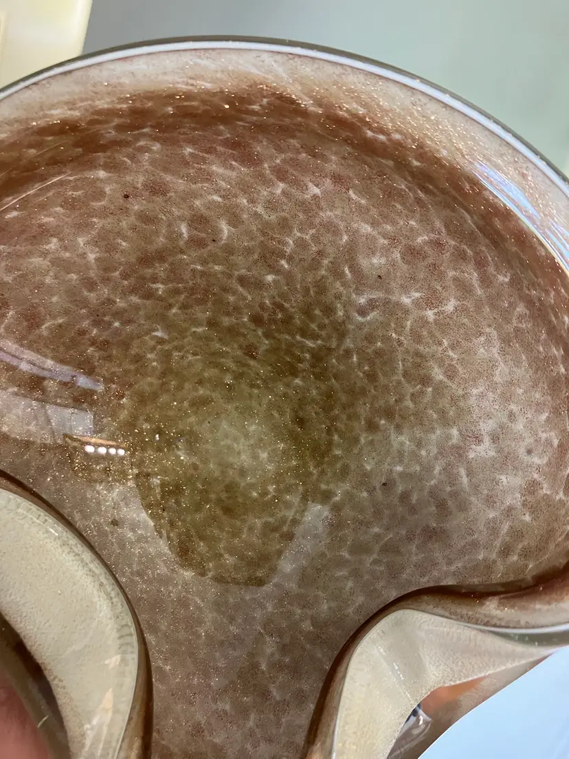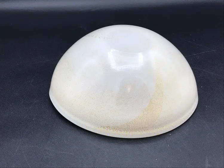 This stunning glass bowl was made in Italy and is attributed to Murano. There are no chips, cracks, or flea bites. This is in excellent condition. There is extensive gold flecks in the finish on the inside of the bowl. The bottom is smooth in polished. Please see pictures for complete description, measurements and condition.
