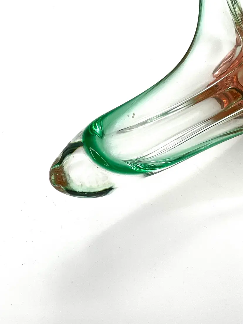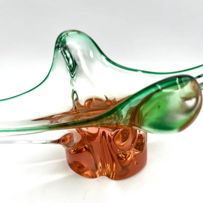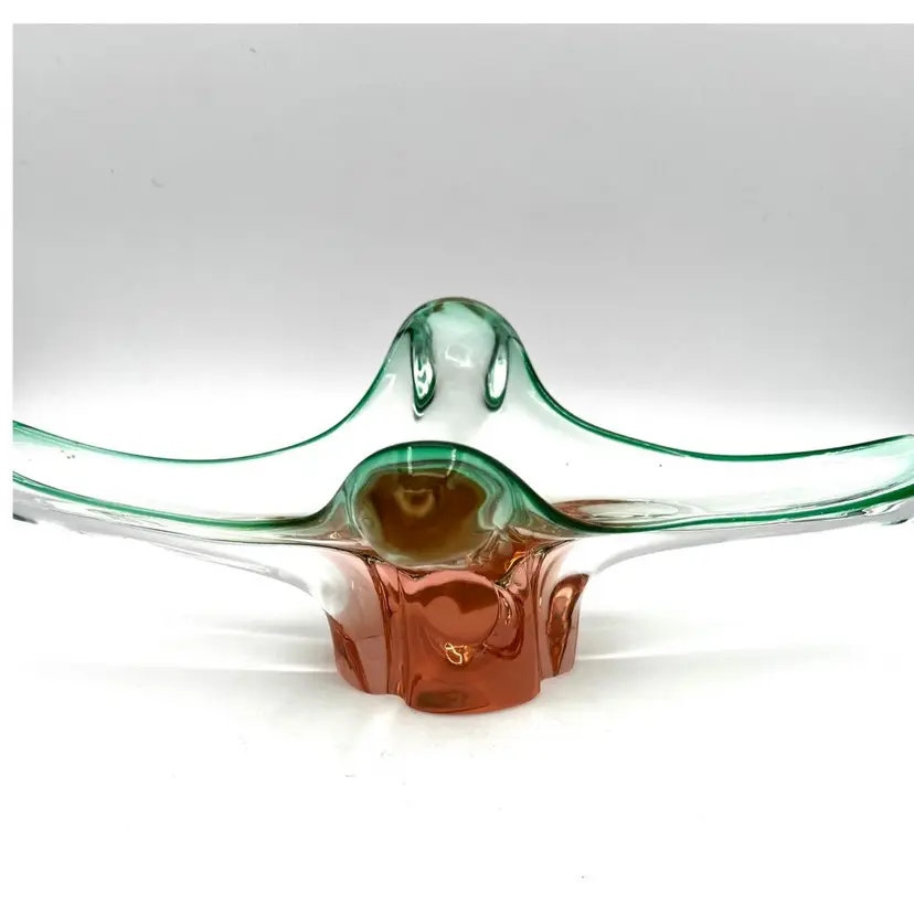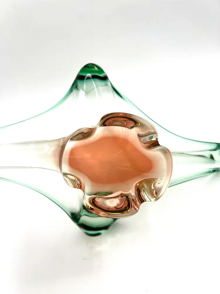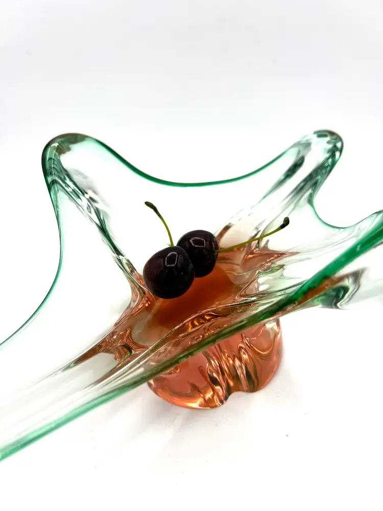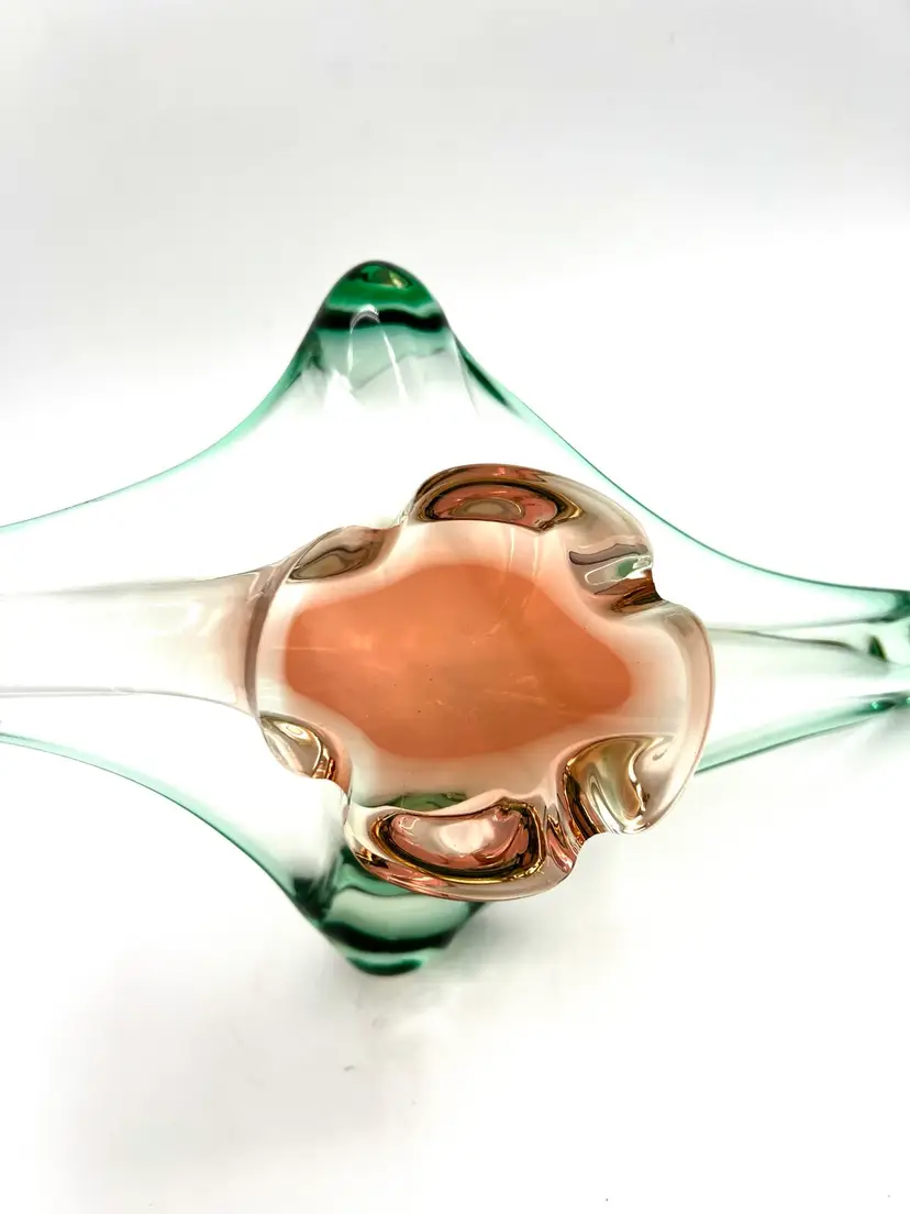 Stunning bowl by Czech designer Josef Hospodka. Made using two colored glasses in pink and green. It is a sturdy piece with thick glass in a beautiful organic shape. Measures 15.5” wide and 5” tall. In excellent condition! This is truly a magnificent piece.