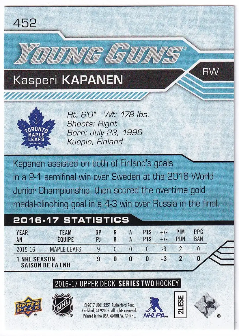 2016-17 Upper Deck #452 Kasperi Kapanen YG RC Toronto Maple Leafs