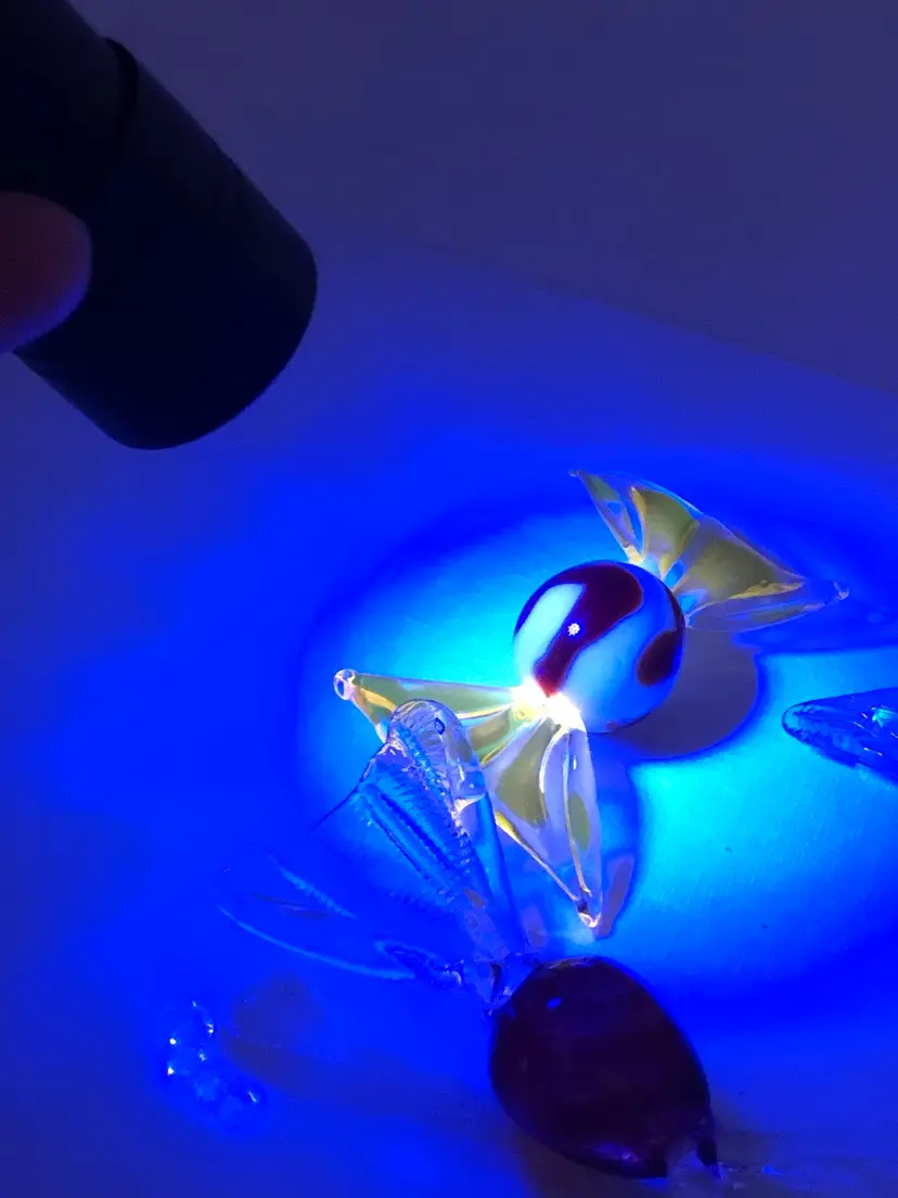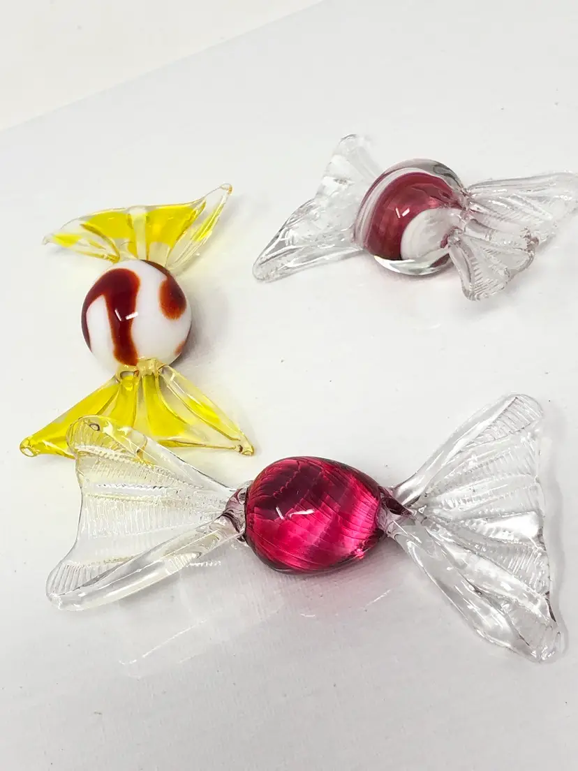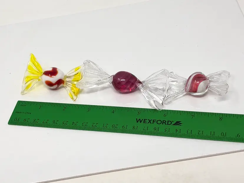 3 pieces of round glass candy, each about 2" long in pretty shades of purple and burgundy . No chips or cracks