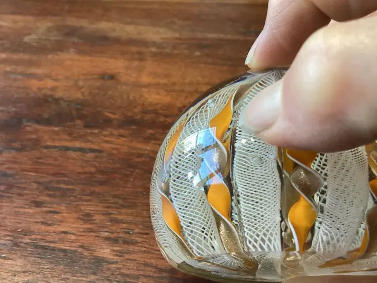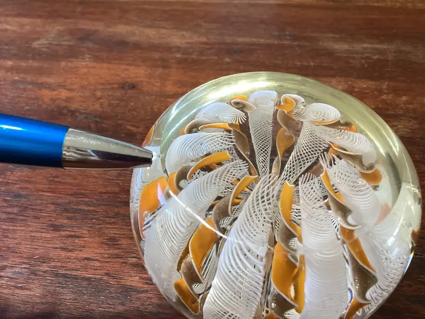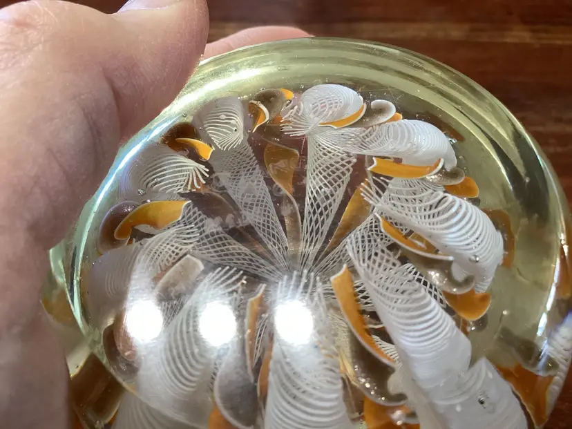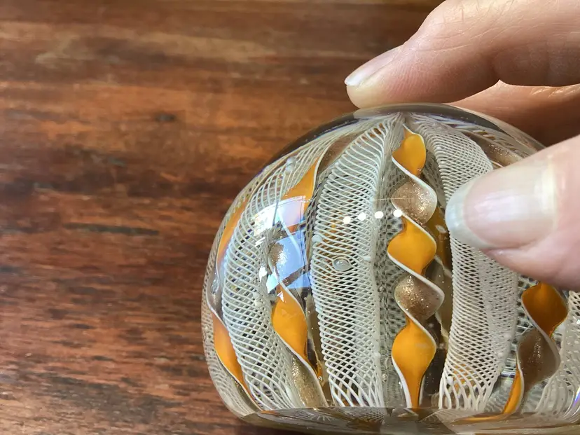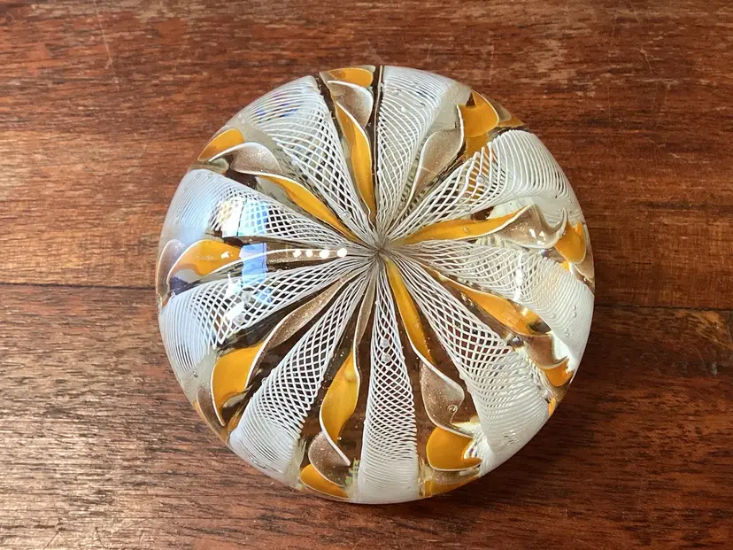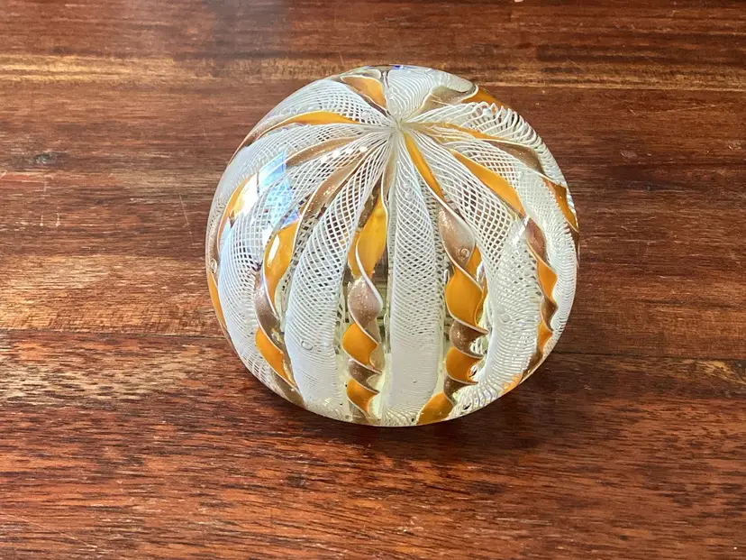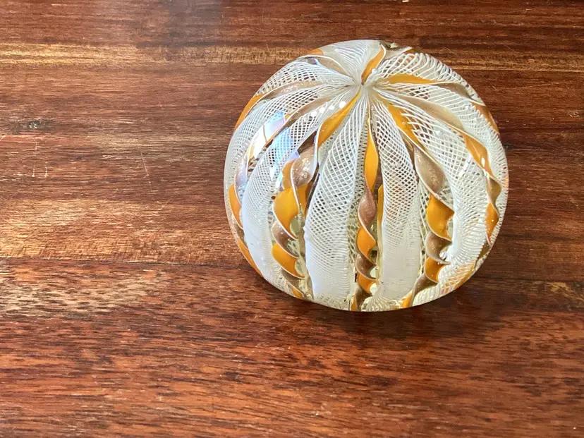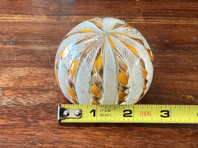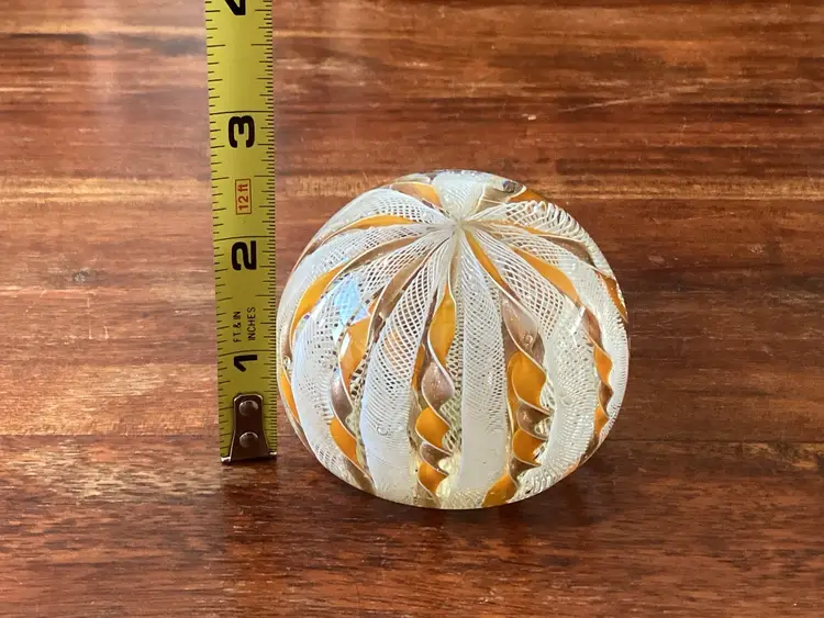 This is a Murano glass paperweight featuring a Zanfirico and Latticino ribbon pattern in yellow and white with copper aventurine. Stands approx 2.5 in tall and 2.75 in diameter. There are 2 very tiny scratches on the side if they paperweight and a tiny flea bite on the base. These are shown in the pictures.