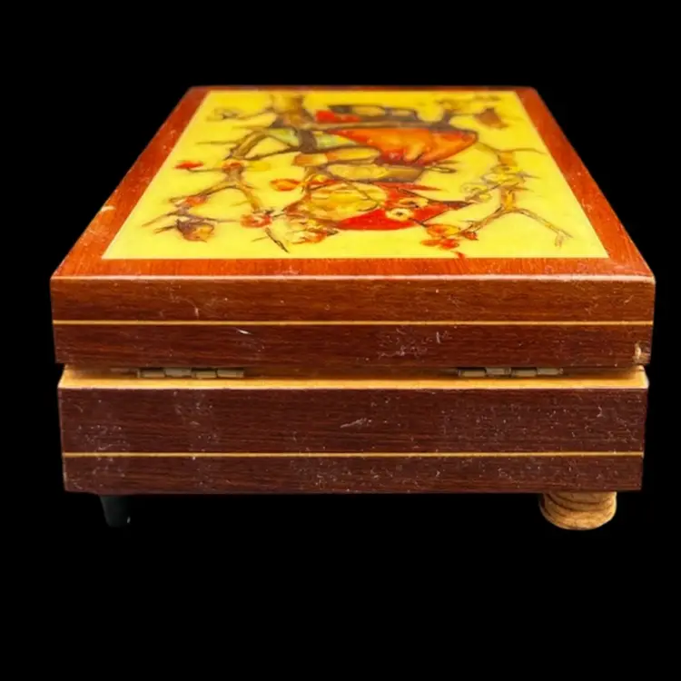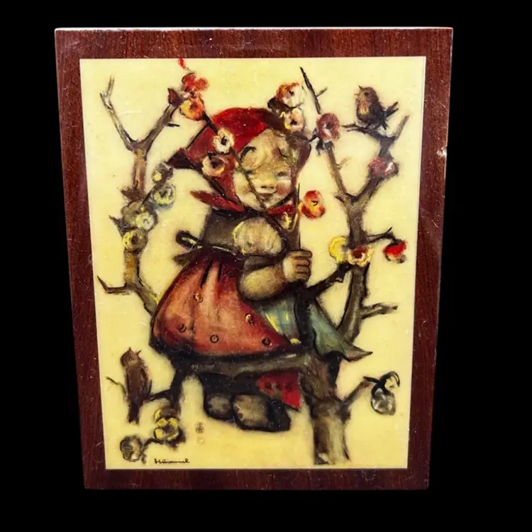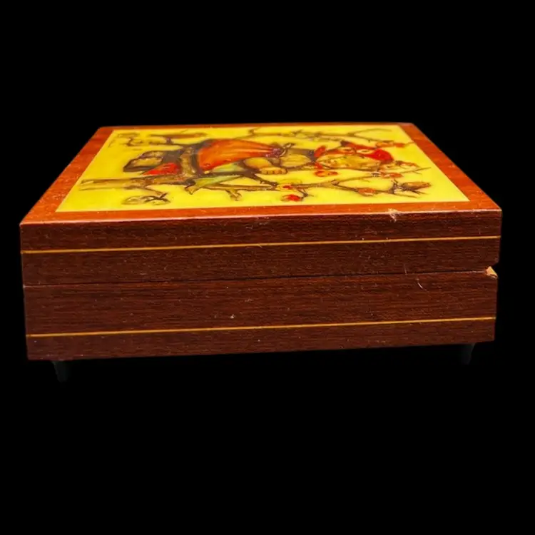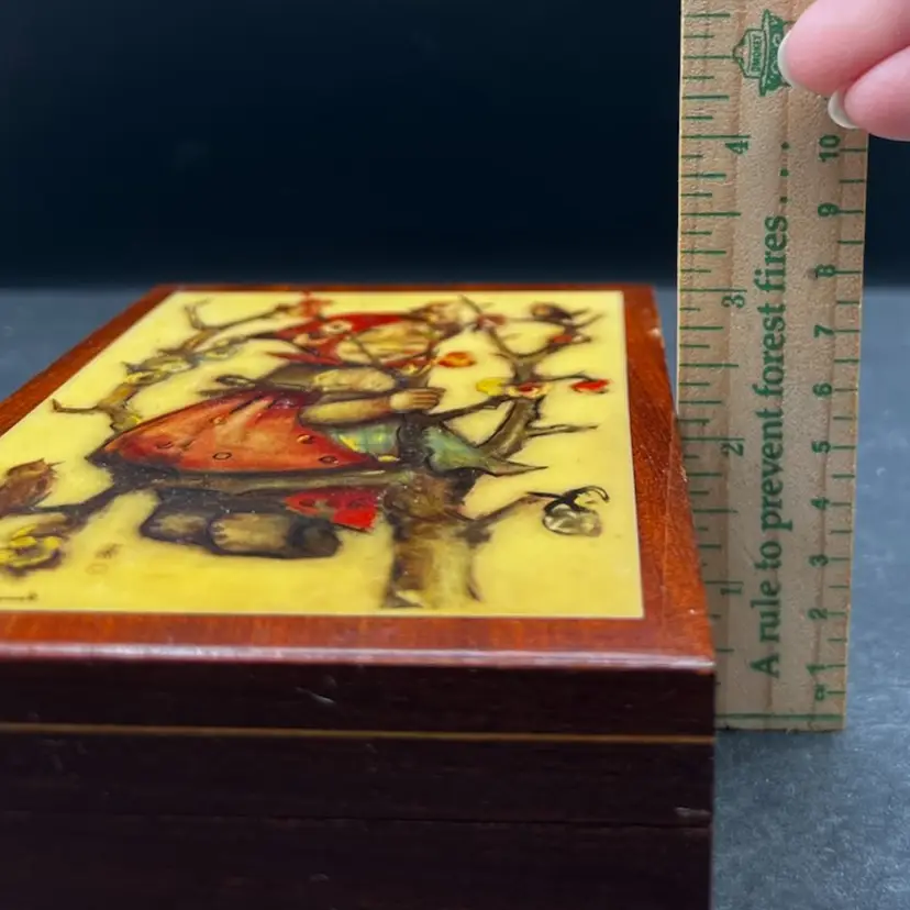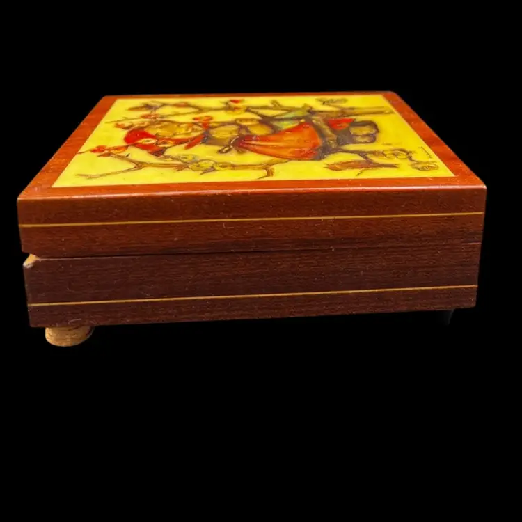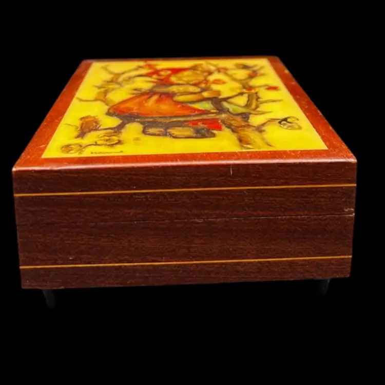 Vintage Original Dietrich Musical Box Made In West Germany With Swiss Musical Movement. Features The Hummel Picture On Top ‘Girl in Blossom Tree’ Plays Greensleeves Folk Art Wood Keepsake/Trinket Box MCM One leg has been replaced and there is a ding on one edge of the old - see pictures Measures 2 1/2” tall x 6” x 4 1-2”