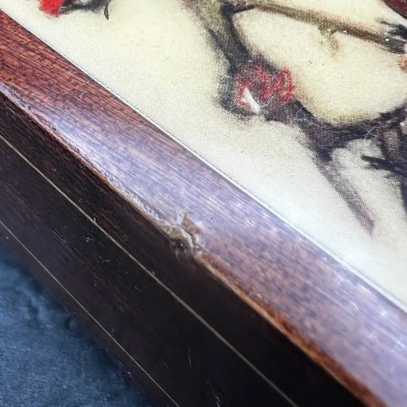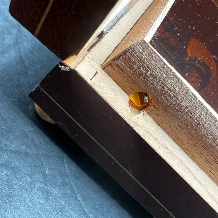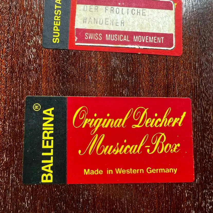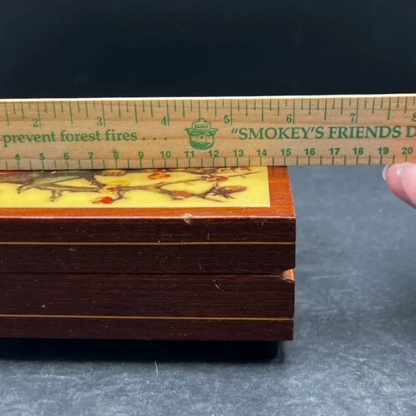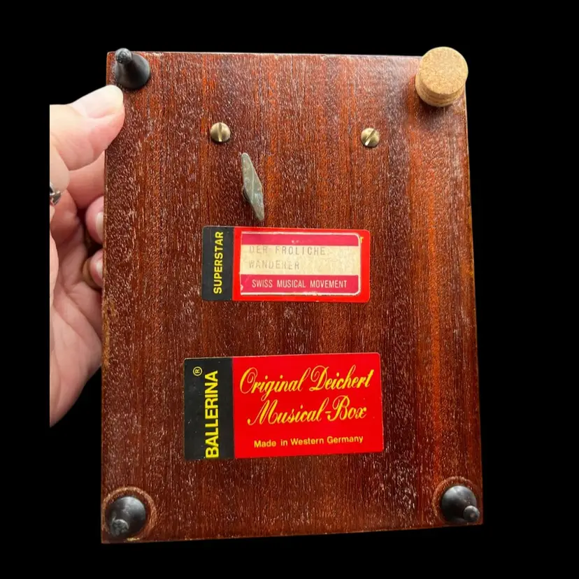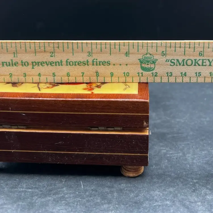 Vintage Original Dietrich Musical Box Made In West Germany With Swiss Musical Movement. Features The Hummel Picture On Top ‘Girl in Blossom Tree’ Plays Greensleeves Folk Art Wood Keepsake/Trinket Box MCM One leg has been replaced and there is a ding on one edge of the old - see pictures Measures 2 1/2” tall x 6” x 4 1-2”