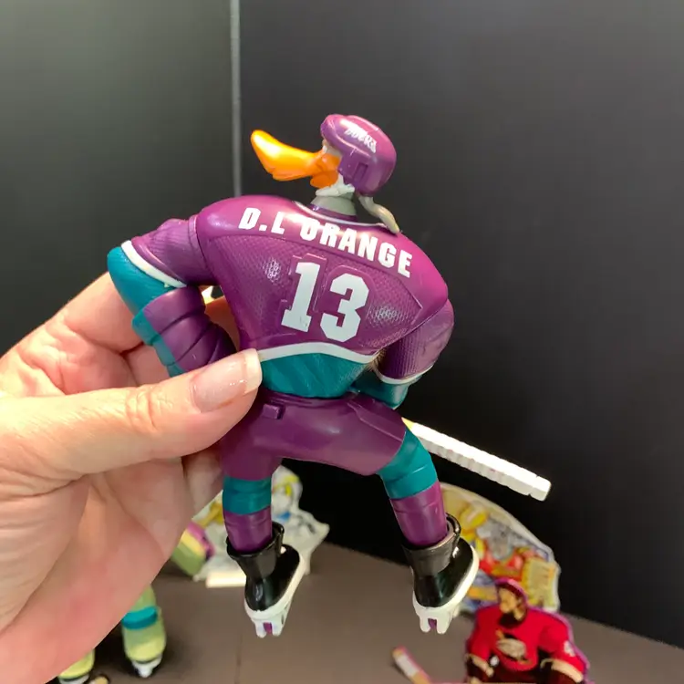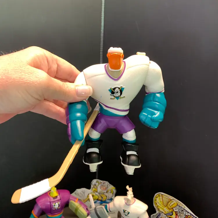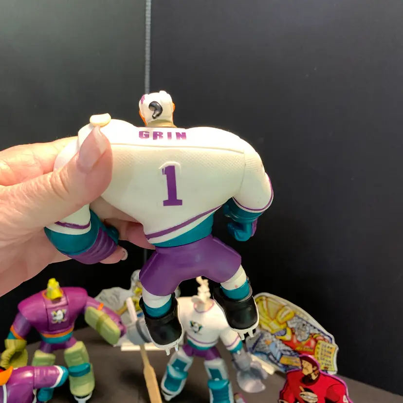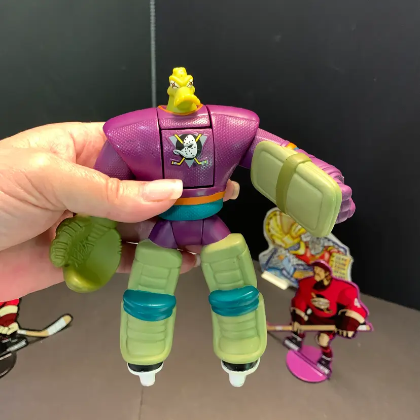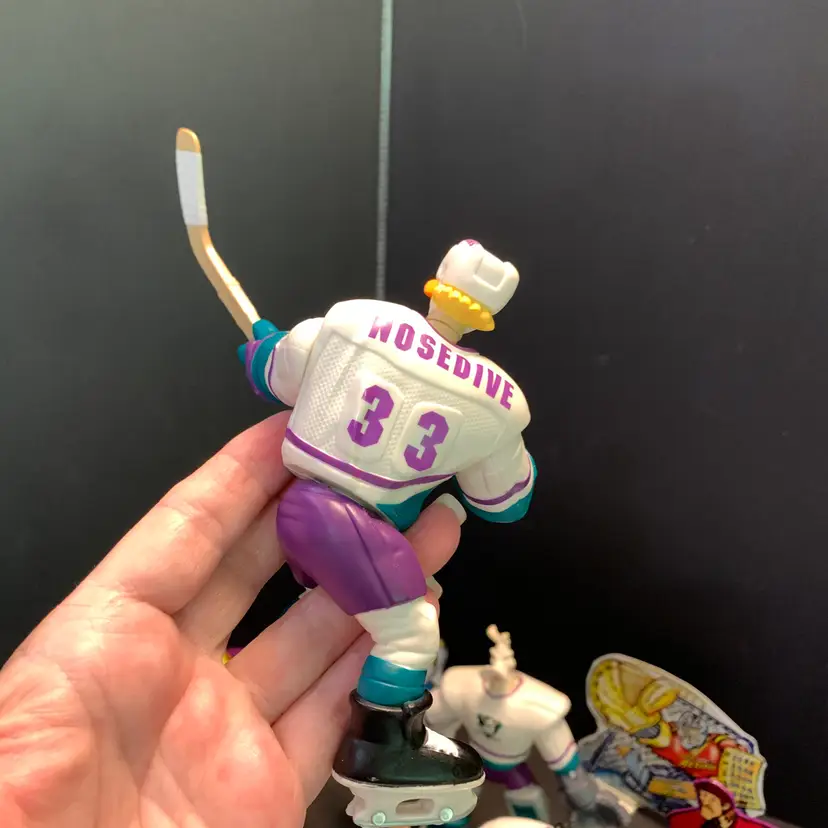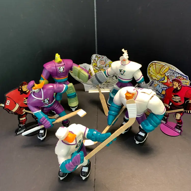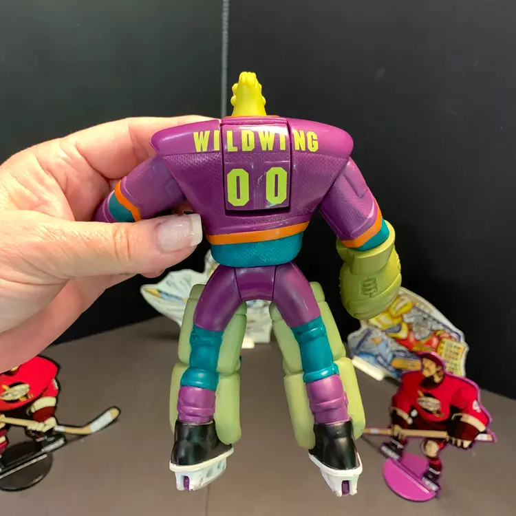 These were my oldest son's toy and they show some wear because he did play with them. One of the goalies is missing a stick. White Wildwing measures 6 1/2 inches wide and 7 inches tall. Purple Wildwing measures 5 1/2 inches wide and 6 1/2 inches tall. Grin measures 4 1/2 inches wide and 6 inches tall. D. L'Orange measures 4 inches wide and 6 1/2 inches tall. Nosedive measures 4 inches wide and 5 3/4 inches tall. Please see all photos for condition. Weighs 47 ounces. If the actual postage ends up being less than what you paid, you will be refunded for anything over one dollar.