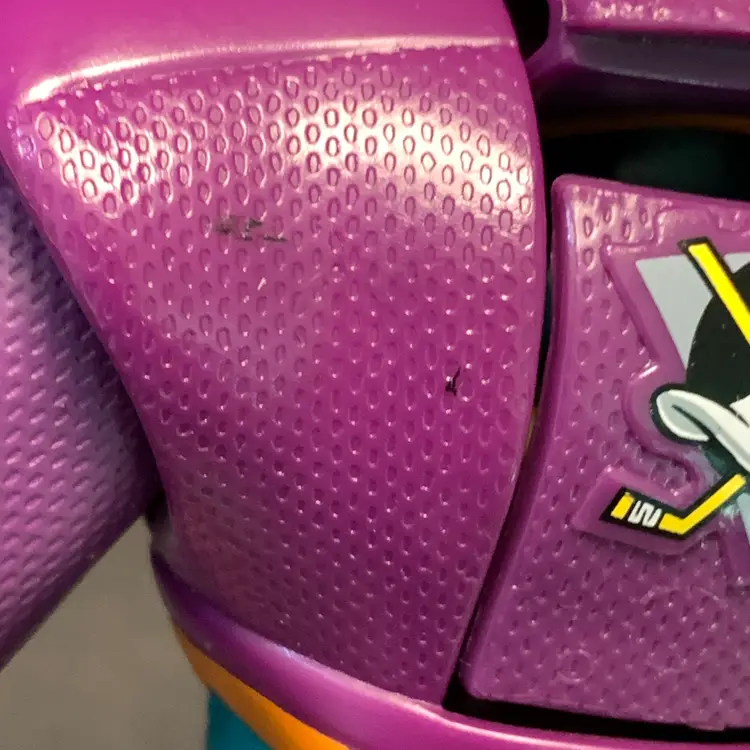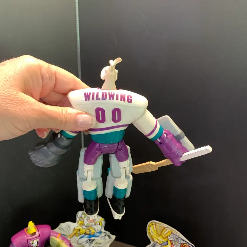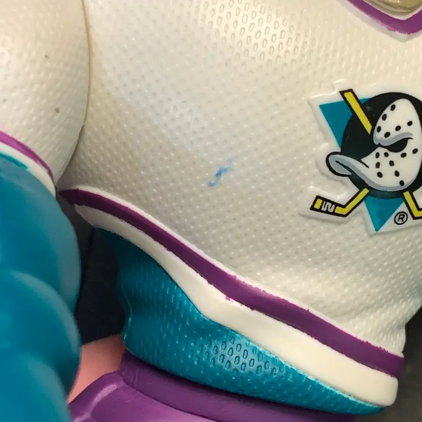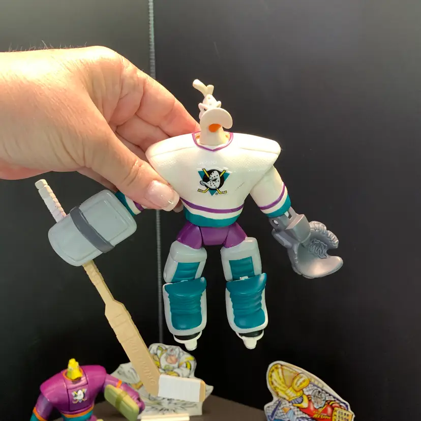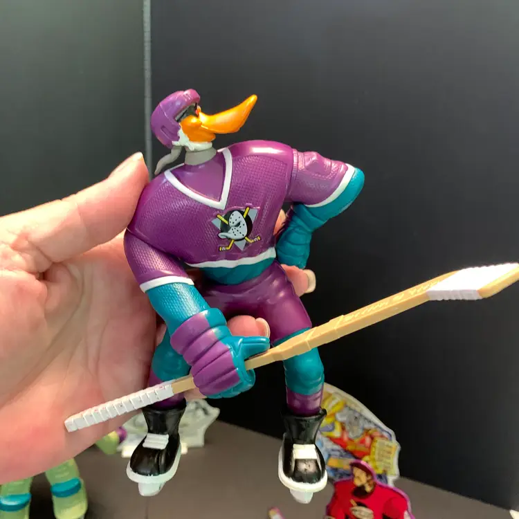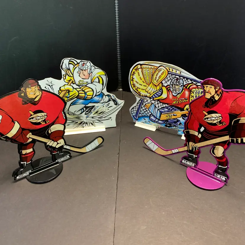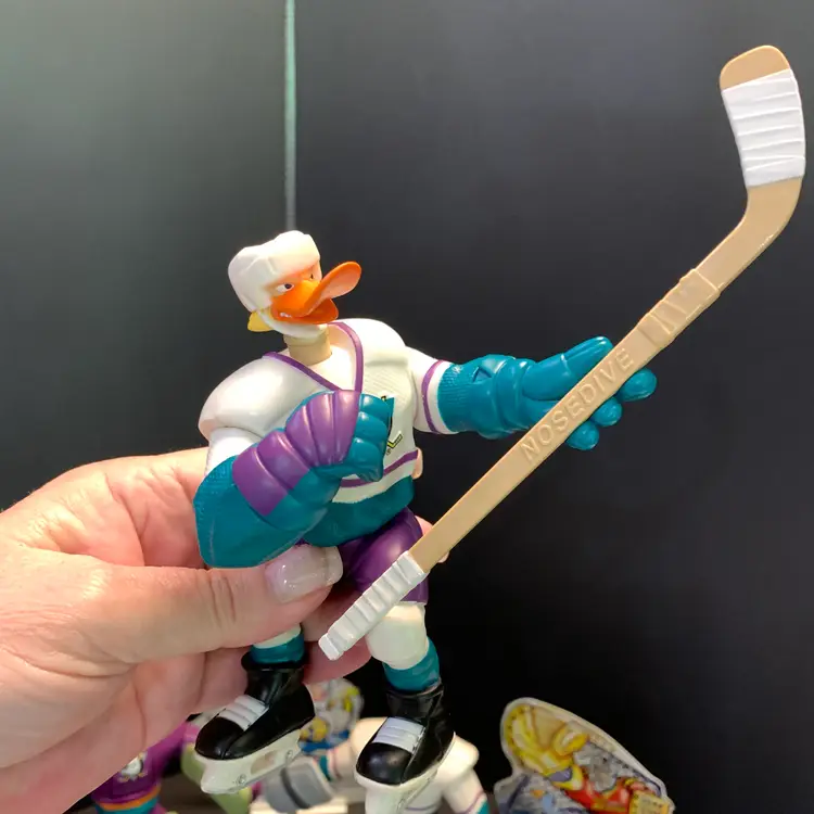 These were my oldest son's toy and they show some wear because he did play with them. One of the goalies is missing a stick. White Wildwing measures 6 1/2 inches wide and 7 inches tall. Purple Wildwing measures 5 1/2 inches wide and 6 1/2 inches tall. Grin measures 4 1/2 inches wide and 6 inches tall. D. L'Orange measures 4 inches wide and 6 1/2 inches tall. Nosedive measures 4 inches wide and 5 3/4 inches tall. Please see all photos for condition. Weighs 47 ounces. If the actual postage ends up being less than what you paid, you will be refunded for anything over one dollar.