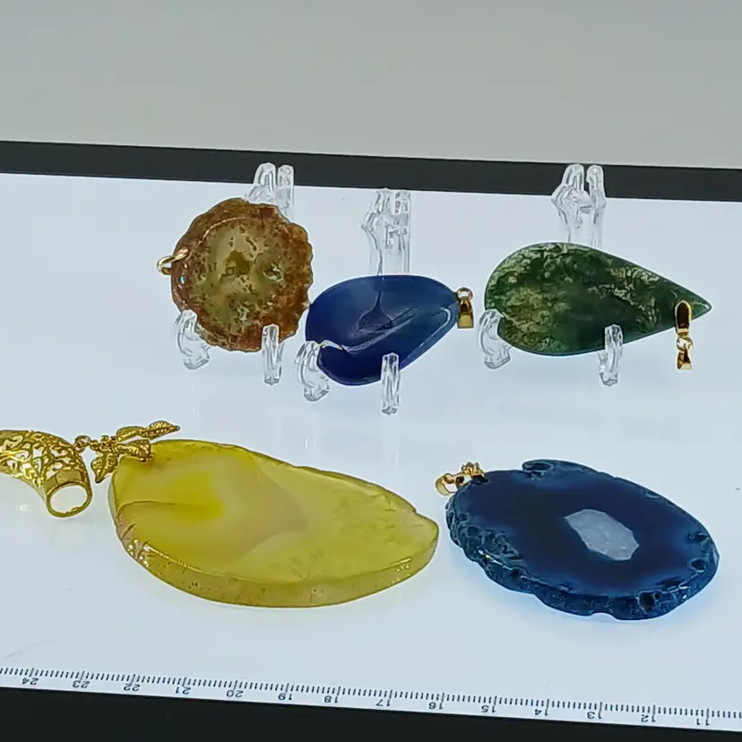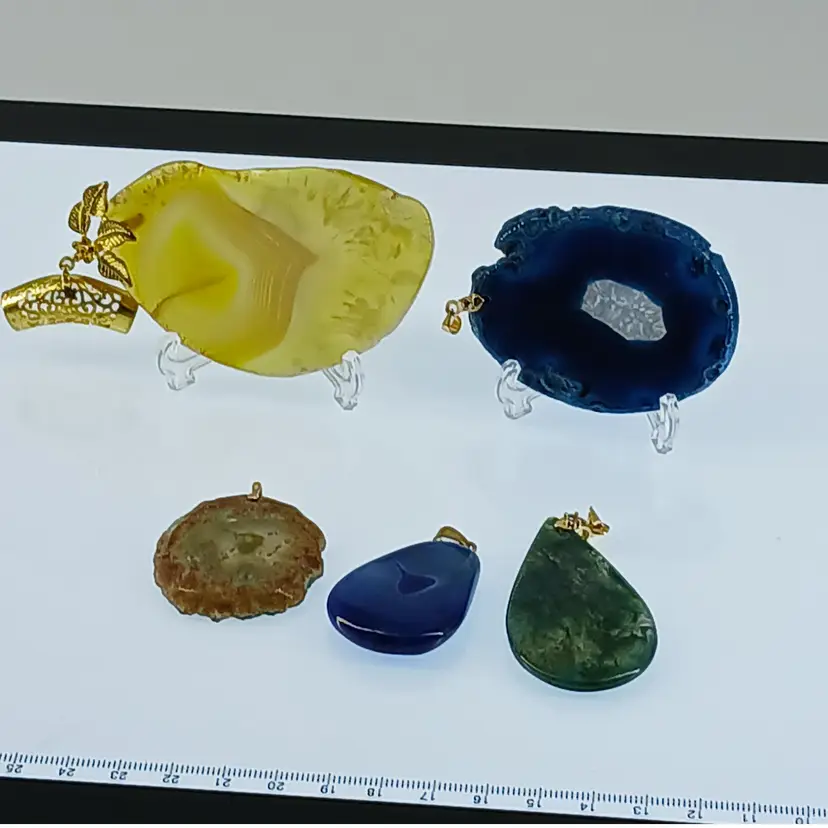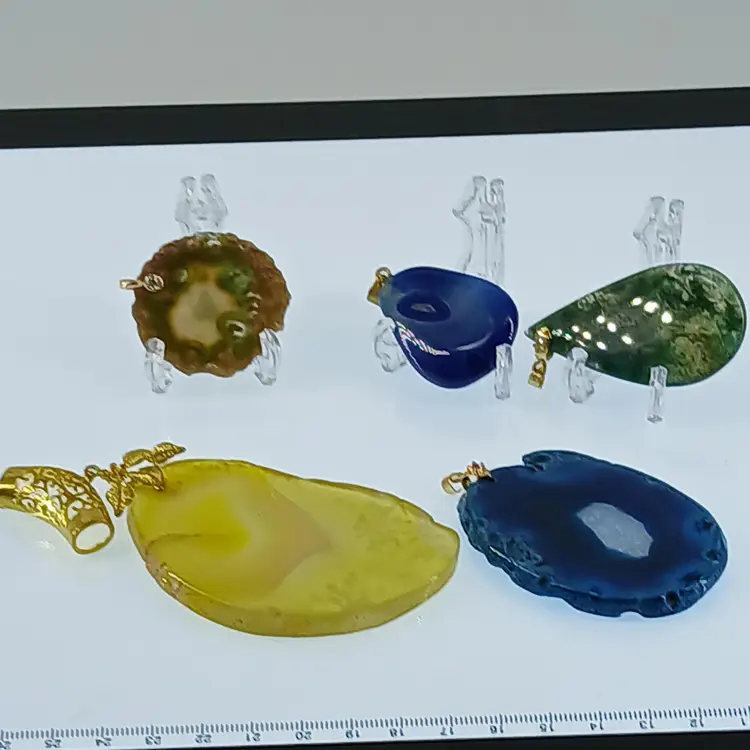 GSL-09– Qty 5 Mixed Free Form Polished Gemstone Pendants. Holes have been drilled and a bail has been attached to each one. Just add chain to complete each item. All stones are natural, and vary in coloring, shapes and transparency. Measurements are approx.