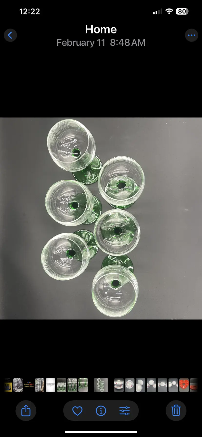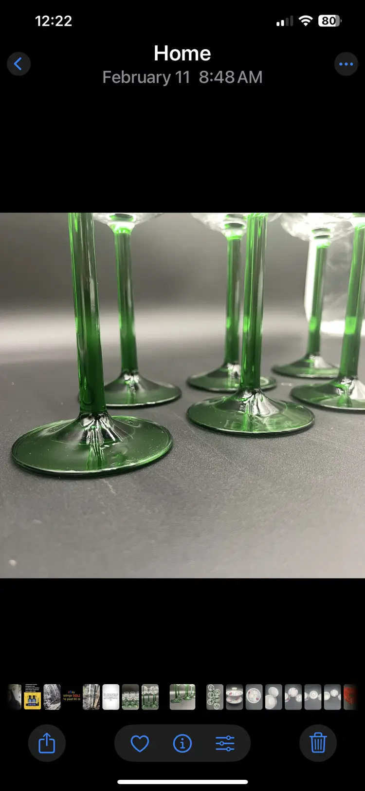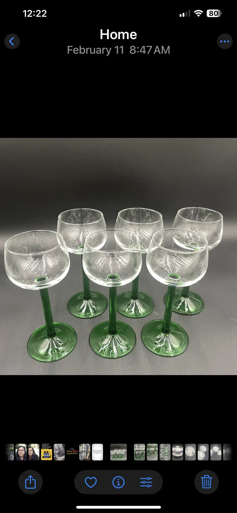 Six vintage Luminarc wine glasses crafted in France. Featuring a classic green stem design. Each glass has a capacity of 4 ounces and stands 6.25“ tall, making them the perfect size for wines, cordials, or ports. These glasses are a great addition to your bar or dining room set. No chips no cracks no flea bites. Please look at all photos as they also serve as the items description.