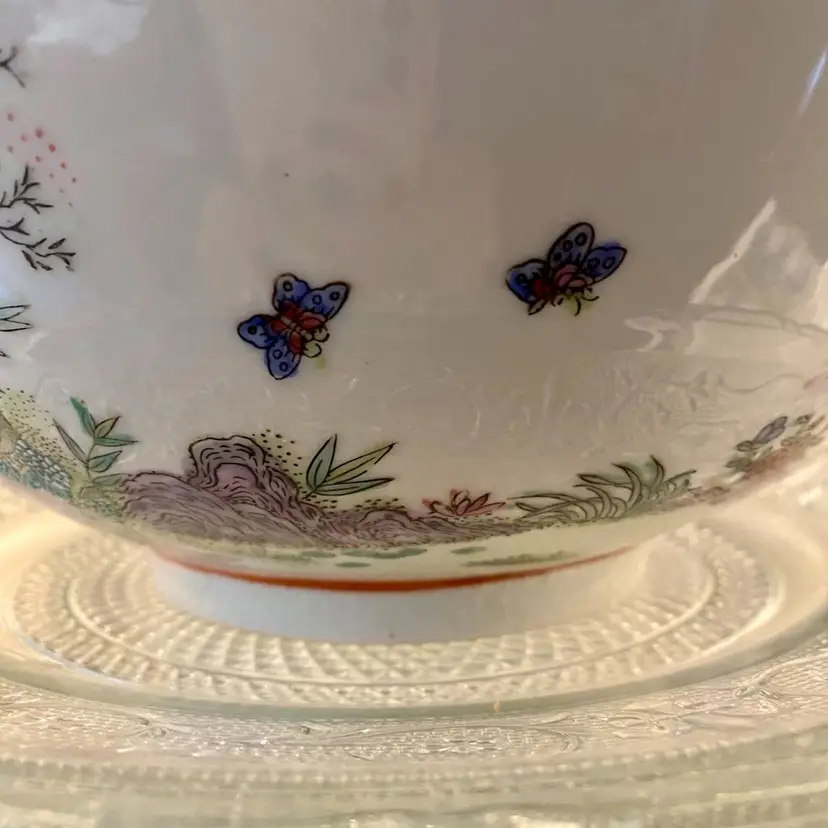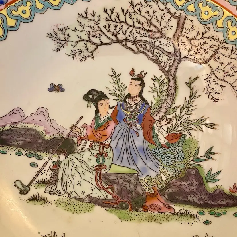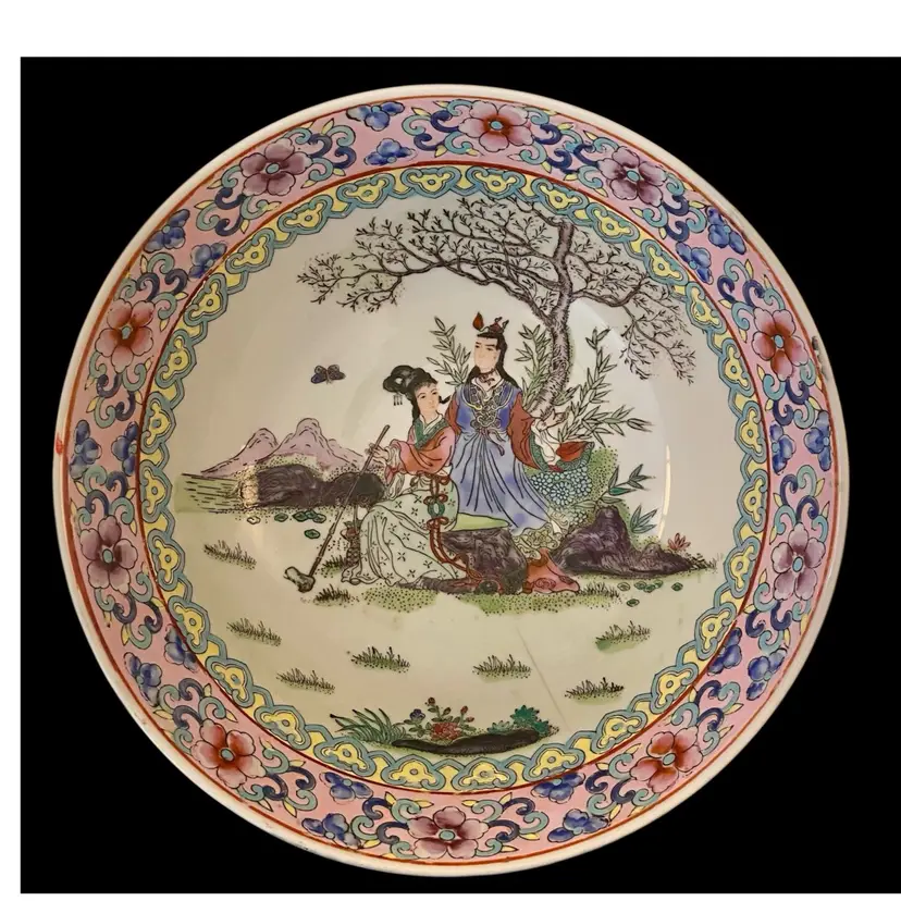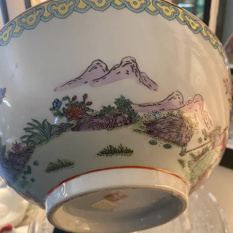 Stunning Large Chinese Famille Rose Bowl featuring the Rose Medallion pattern . This spectacular bowl is handpainted depicting a colorful vibrant scene of a courting couple, landscape with florals and butterflies. It is in very good condition considering it’s age. It is marked with 4 characters known as the Reign mark. This mark indicates a specific imperial period during which it was crafted.