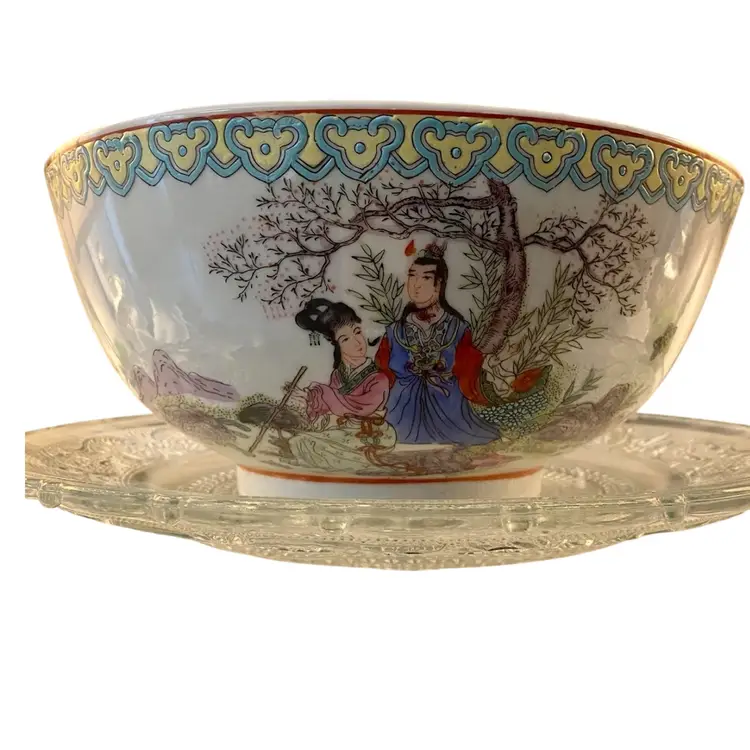 802. Large Vintage Chinese Famille Rose Hand Painted MACAU marked Porcelain Bowl Garden Courtship Figural Scene Marked with 4 Characters