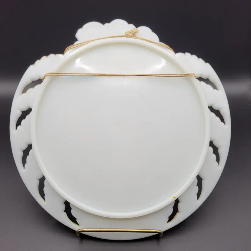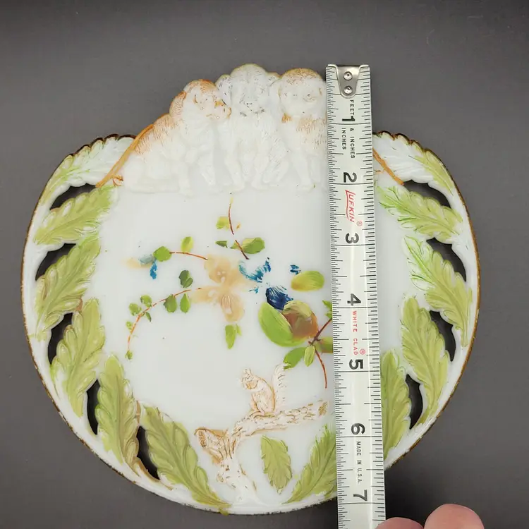 This 7 inch plate from the late 1800s features 3 puppies with open leaf border and a squirrel near the bottom of the plate. There is quite a bit of wear on paint to be expected due to age and only one small chip on the back as shown in the pictures.