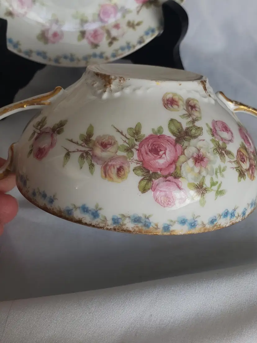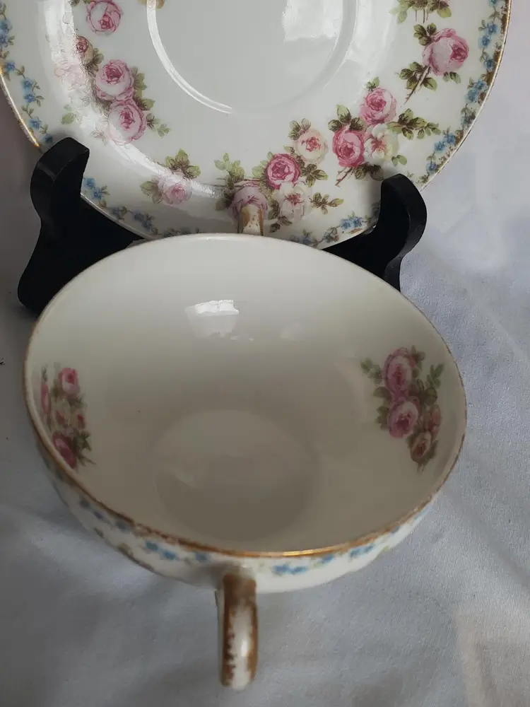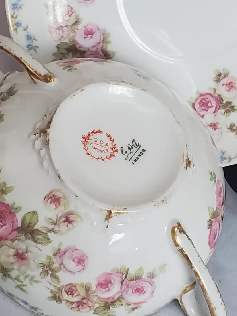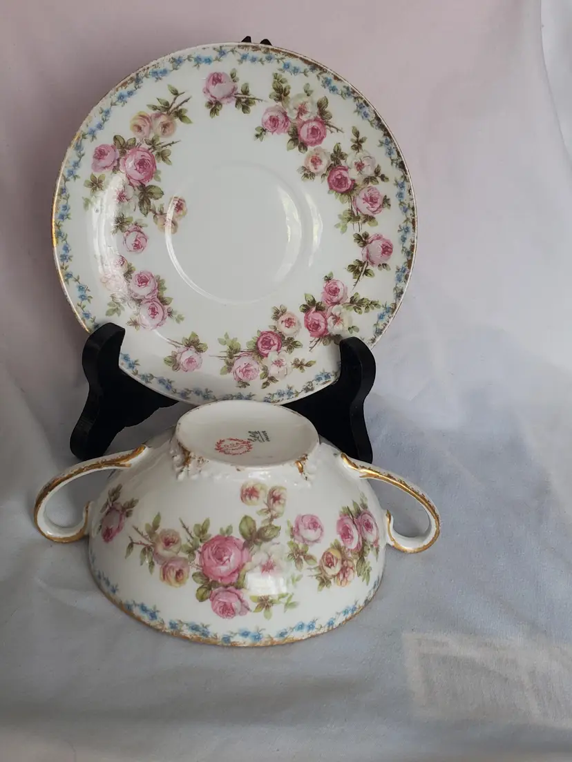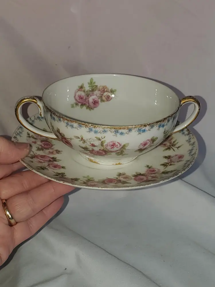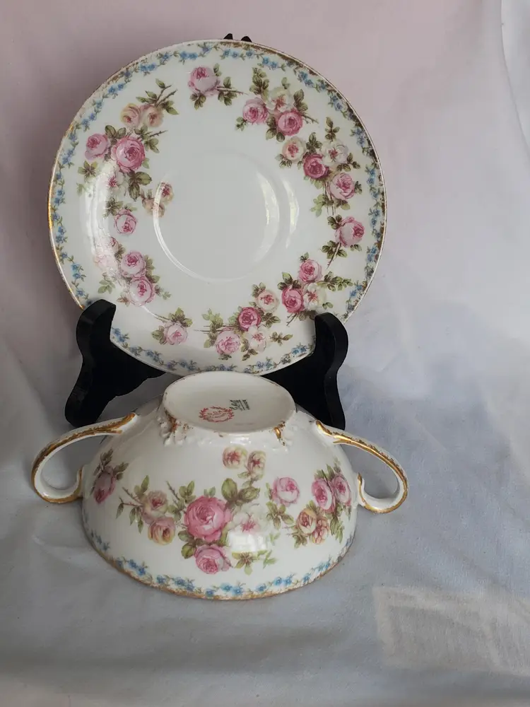 Limoges very old porcelain double handled cream soup cup by GDA signed. Beautifully detailed cabbage roses and delicate blue flowers around the rims. Gold gild brushwork on cups handle and edges as well as saucers edge. This piece is around 1900 to possibly 1943 In very good condition with no chips or cracks or crazing. See detailed pictures of this beautiful cup. Measures: saucer 5 5/ cup 4" height 1 3/4. Display stand not included.