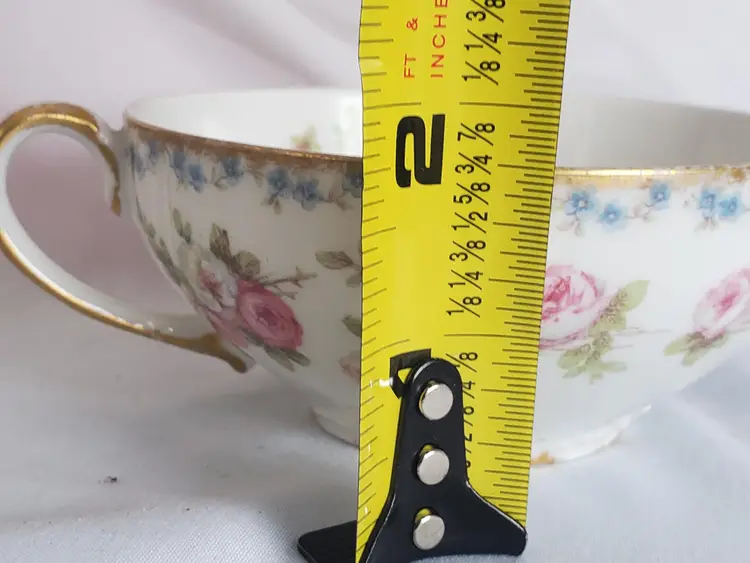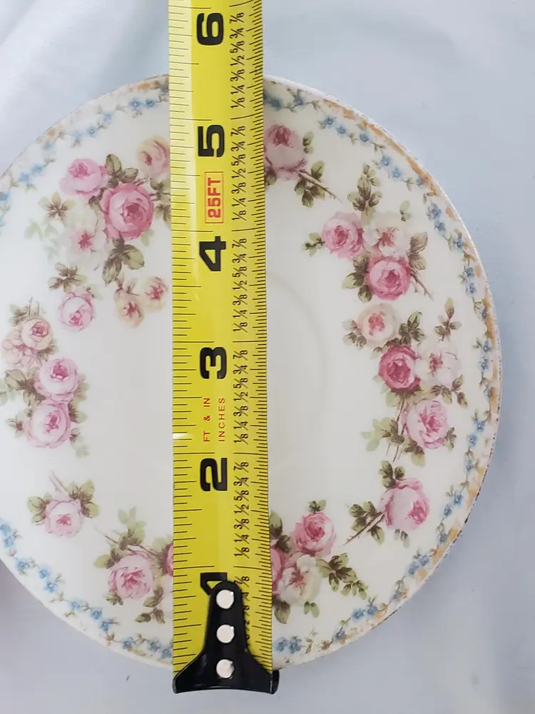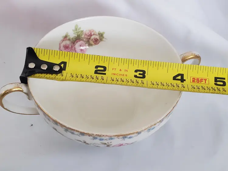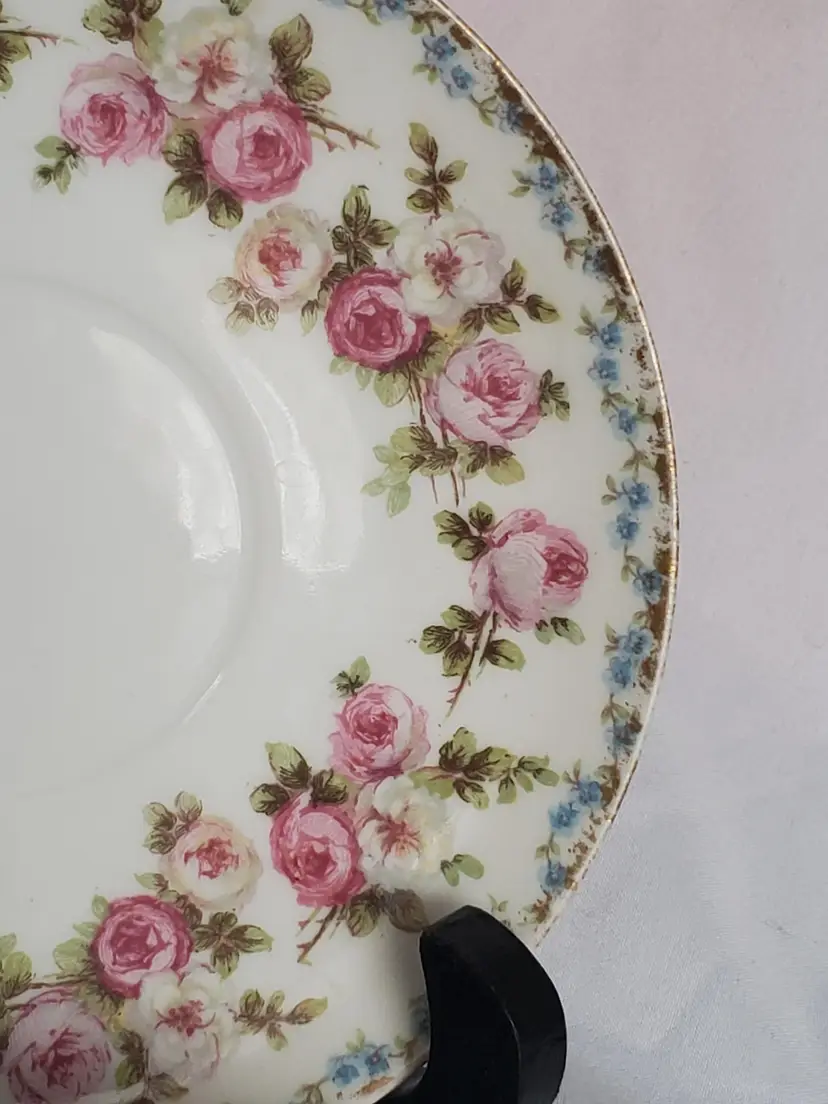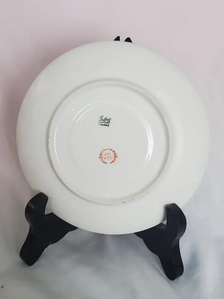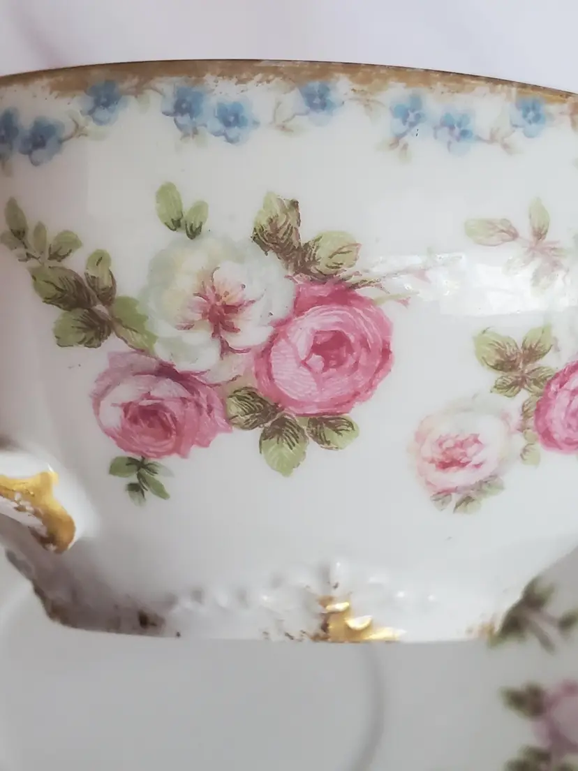 Limoges very old porcelain double handled cream soup cup by GDA signed. Beautifully detailed cabbage roses and delicate blue flowers around the rims. Gold gild brushwork on cups handle and edges as well as saucers edge. This piece is around 1900 to possibly 1943 In very good condition with no chips or cracks or crazing. See detailed pictures of this beautiful cup. Measures: saucer 5 5/ cup 4" height 1 3/4. Display stand not included.
