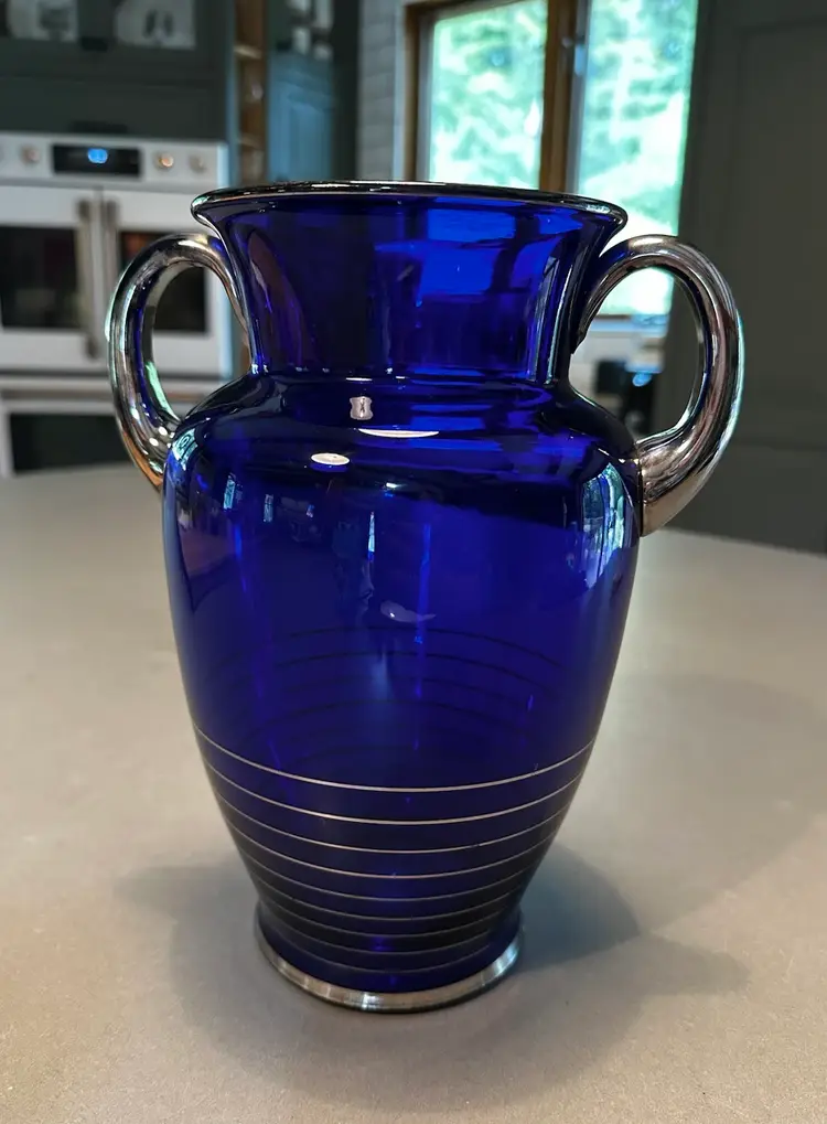 Beautiful art deco 1930-40’s Louis Glass vase. It is cobalt blue with silver accent trim. It stands 9.5” tall. Very very minor wear to the silver trim. No chips or cracks. Overall very good condition.