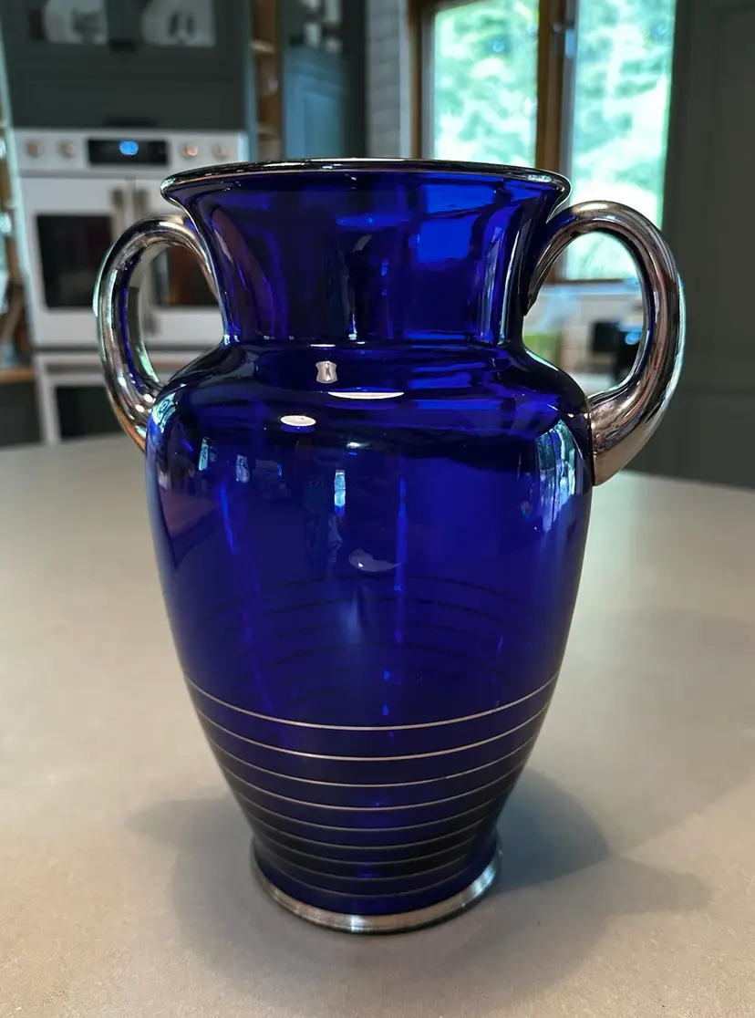 Art Deco Louis Glass Cobalt Blue w Silver Trim 9.5” Vase Handles
