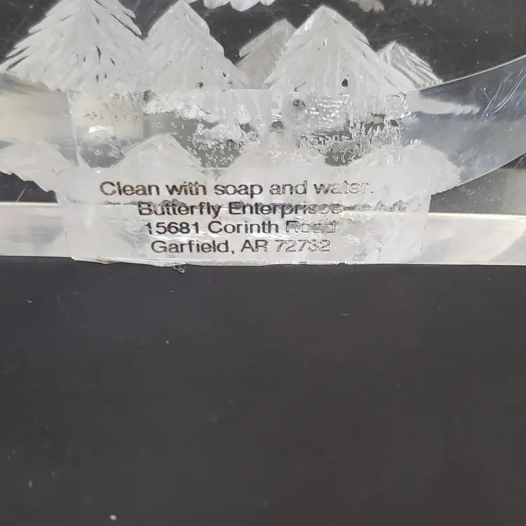 Signed Sue B, this large lucite display is back etched with an eagle with wings spread over confier trees. From the tiny town of Garfield AR. Very good condition, so chips or cracks, very few scratches on the bottom of the attached base. Would look cool bottom lit.