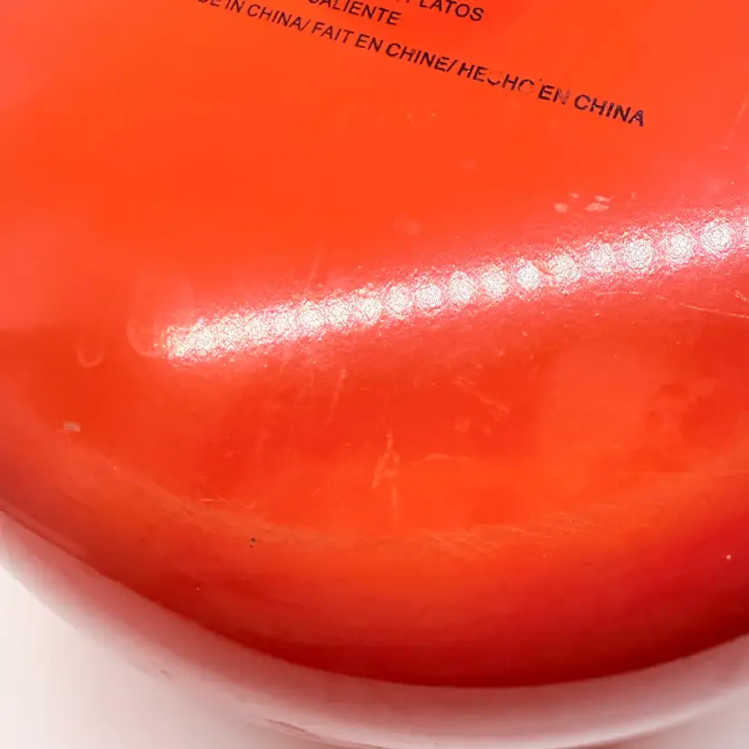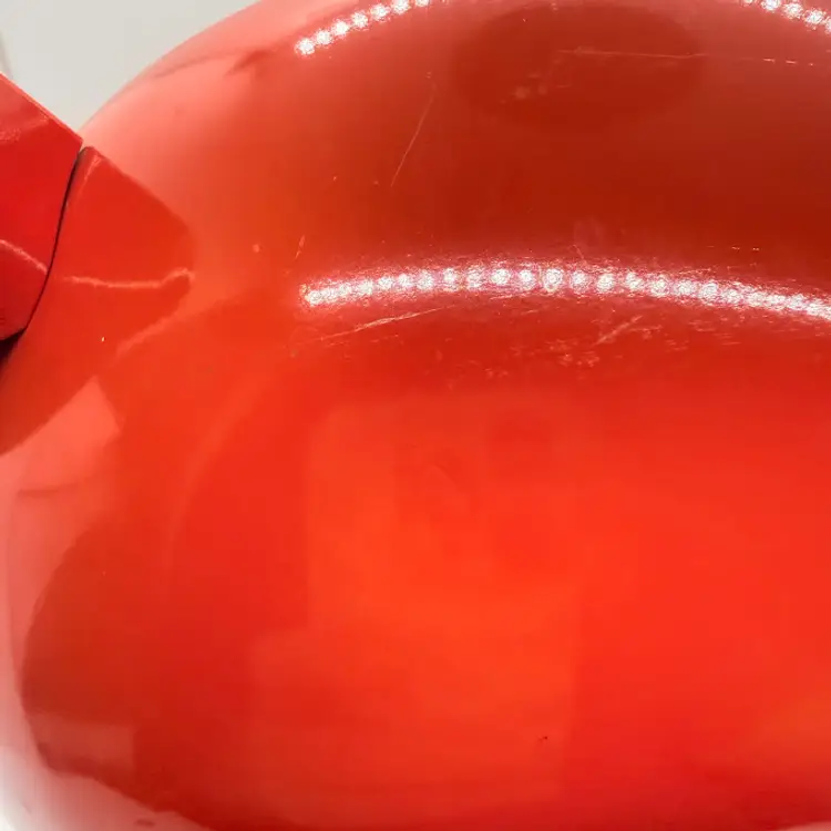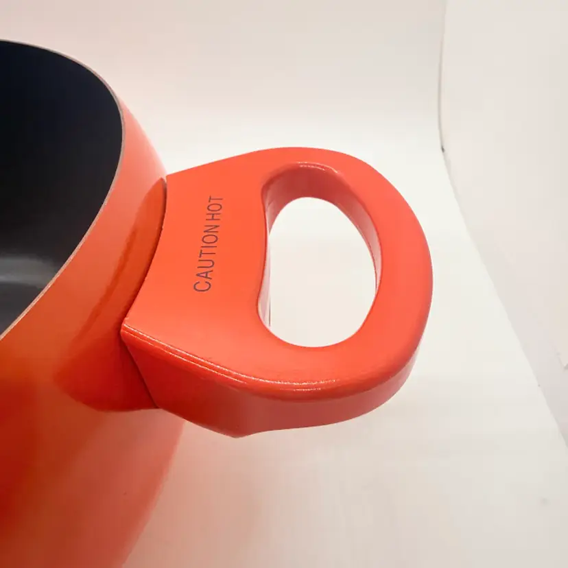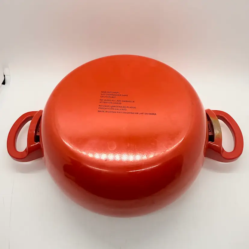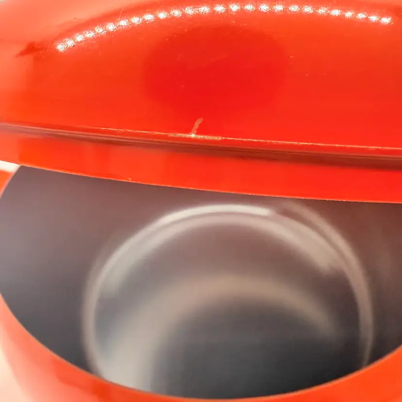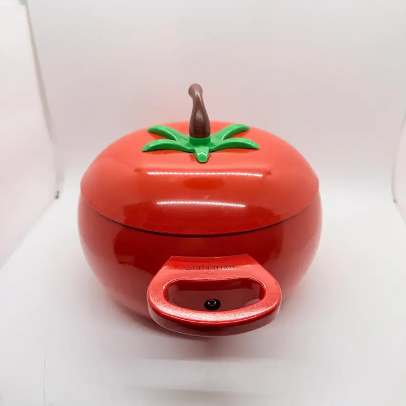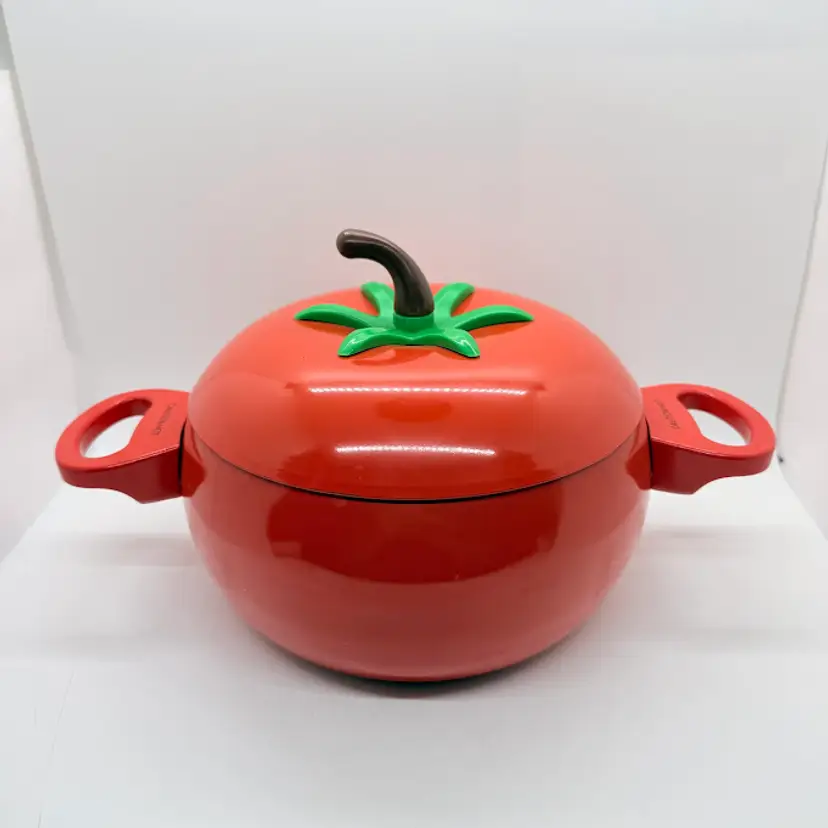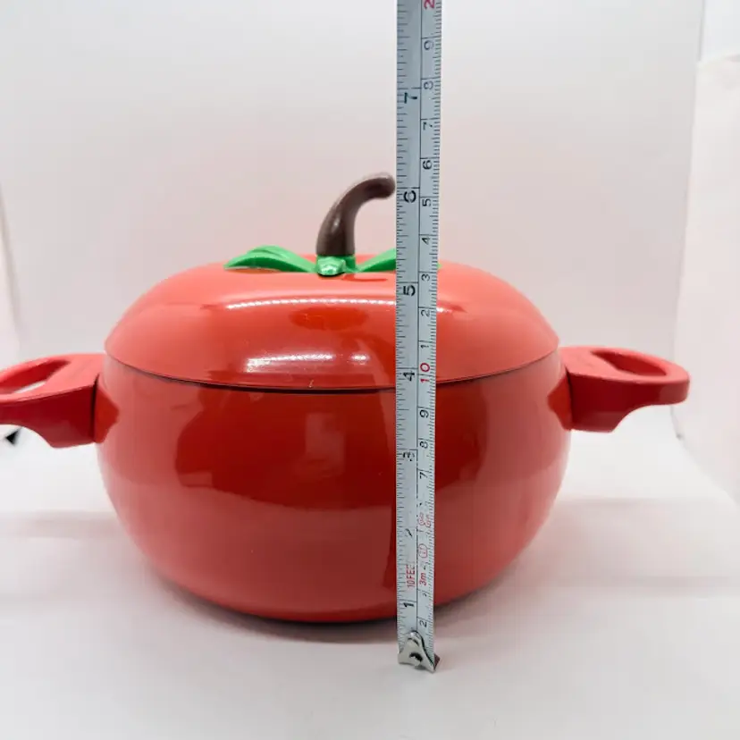 Cute Avon Vegetable Red Tomato Shaped Non Stick Enamel Cooking Pot/ Pan. Signs of wear and use. Some scratching and scuffing to the red along the bottom, some around the body, and on the edge of the lid. Some scratching on the stem handle. One handle is discolored on the bottom. Please see pictures. Sold as is.