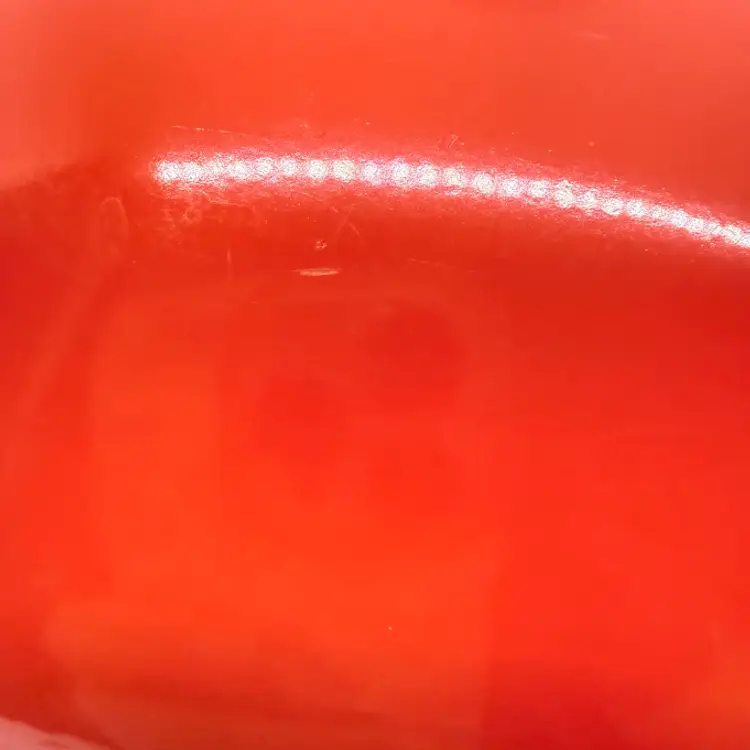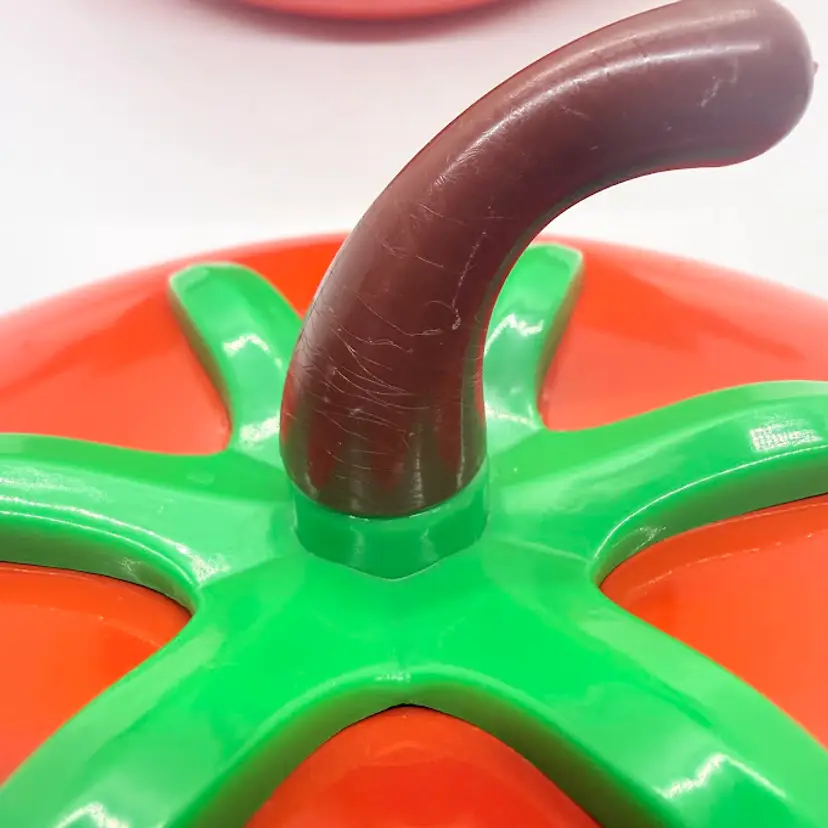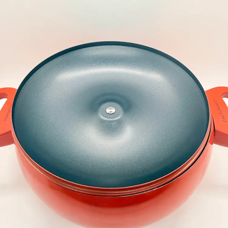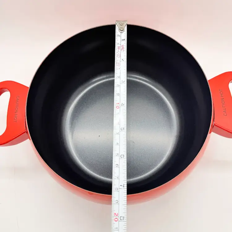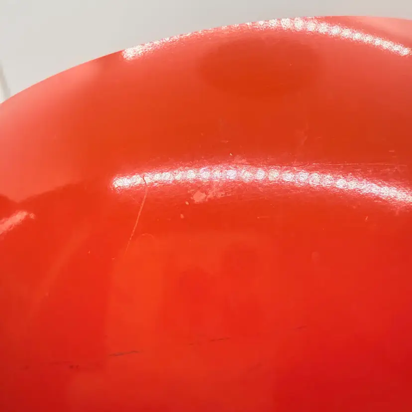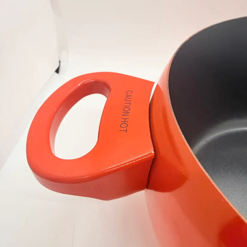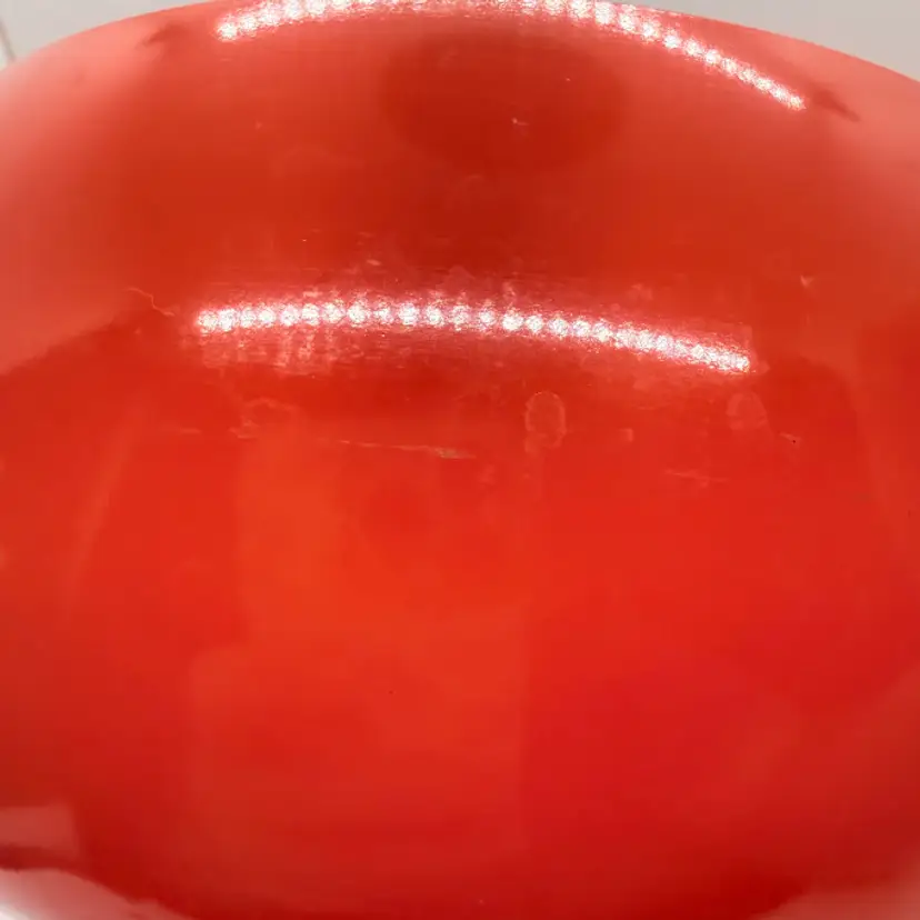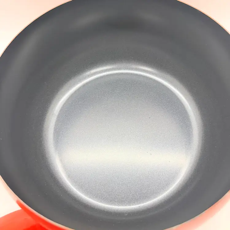 Cute Avon Vegetable Red Tomato Shaped Non Stick Enamel Cooking Pot/ Pan. Signs of wear and use. Some scratching and scuffing to the red along the bottom, some around the body, and on the edge of the lid. Some scratching on the stem handle. One handle is discolored on the bottom. Please see pictures. Sold as is.
