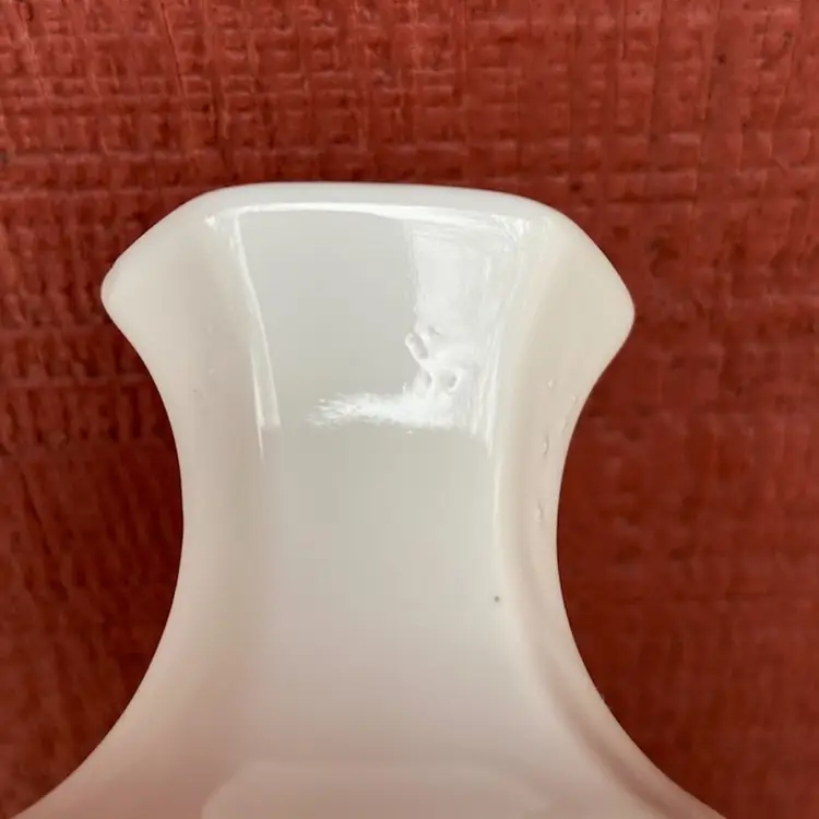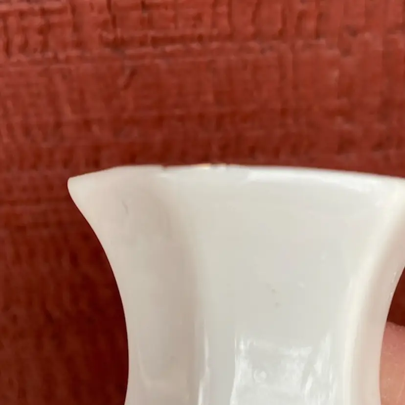 Approx 2”w x 3.5”h. Opening is about .75”. Pre-owned condition. No chips or cracks. See pictures as part of description. Some bumpy areas under the glaze below lip. Flat surface along the rim - does not appear to be a chip.