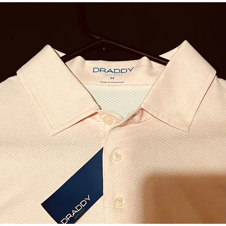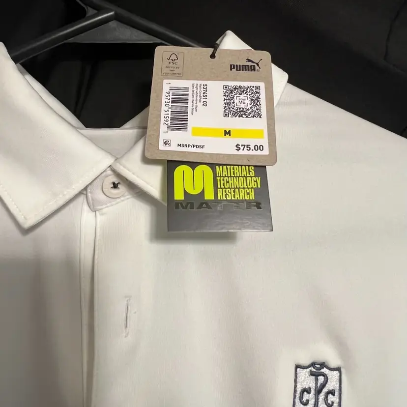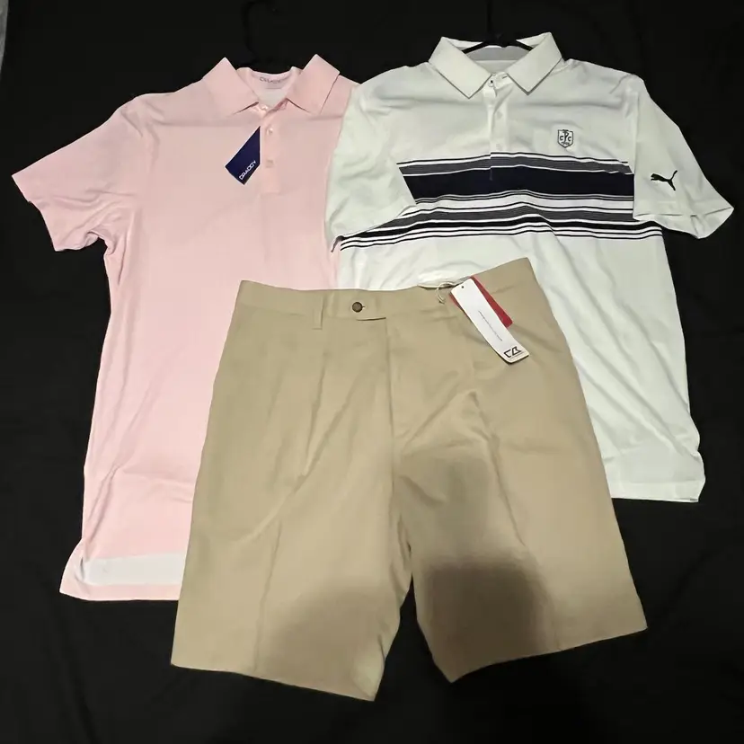 B Draddy Cool Glaser Polo, Color Tickled, Size Medium, Brand New With Tags; Puma Mattr Grind Polo Golf Shirt, Bright White-Navy, Medium, Moisture Wicking, New With Tags; Cutter & Buck Twill Microfiber Pleated Short, Color Khaki, Size 34, New With Tags