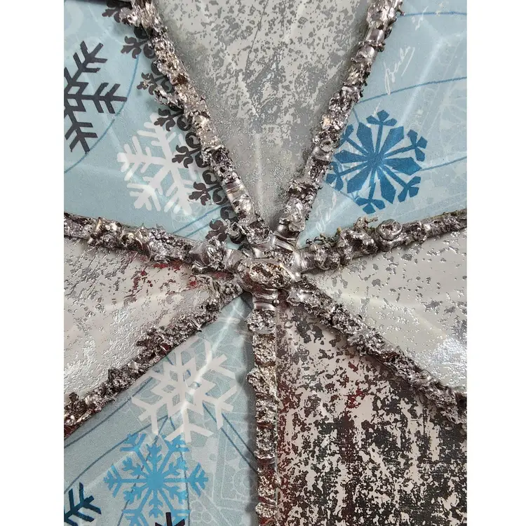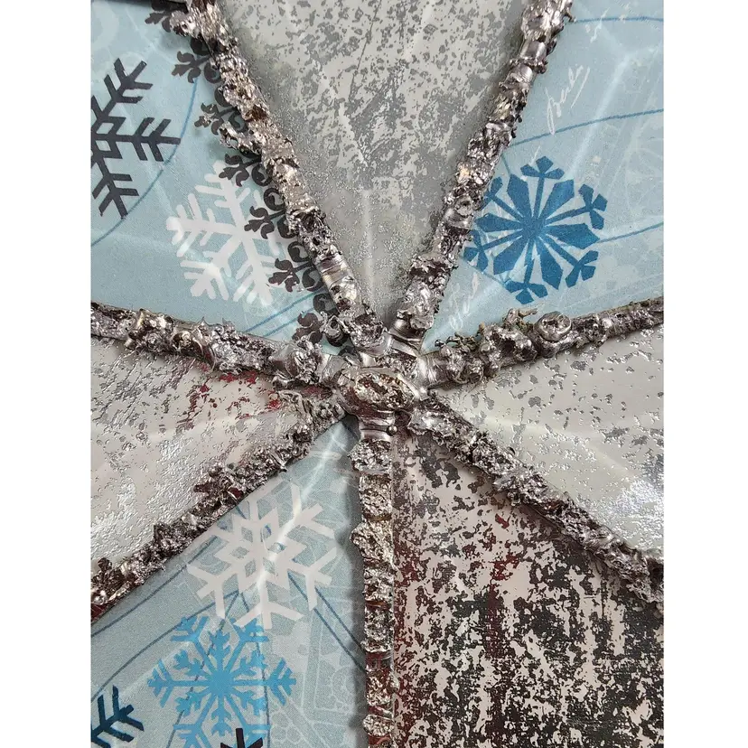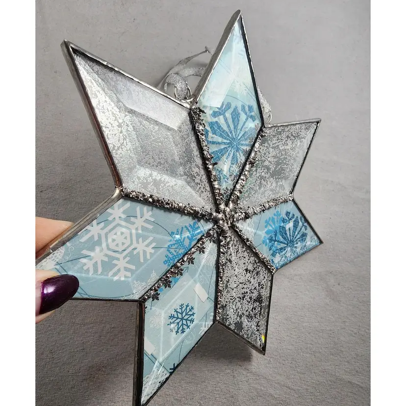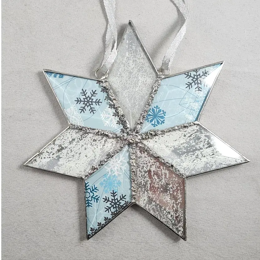 Mixed media 7-point double-sided snowflake hanging decoration. Made of clear glass bevels, paper, and decorative solder. This is a heavy piece and would need a solid hook to hang.