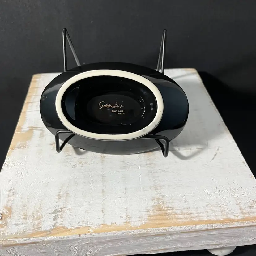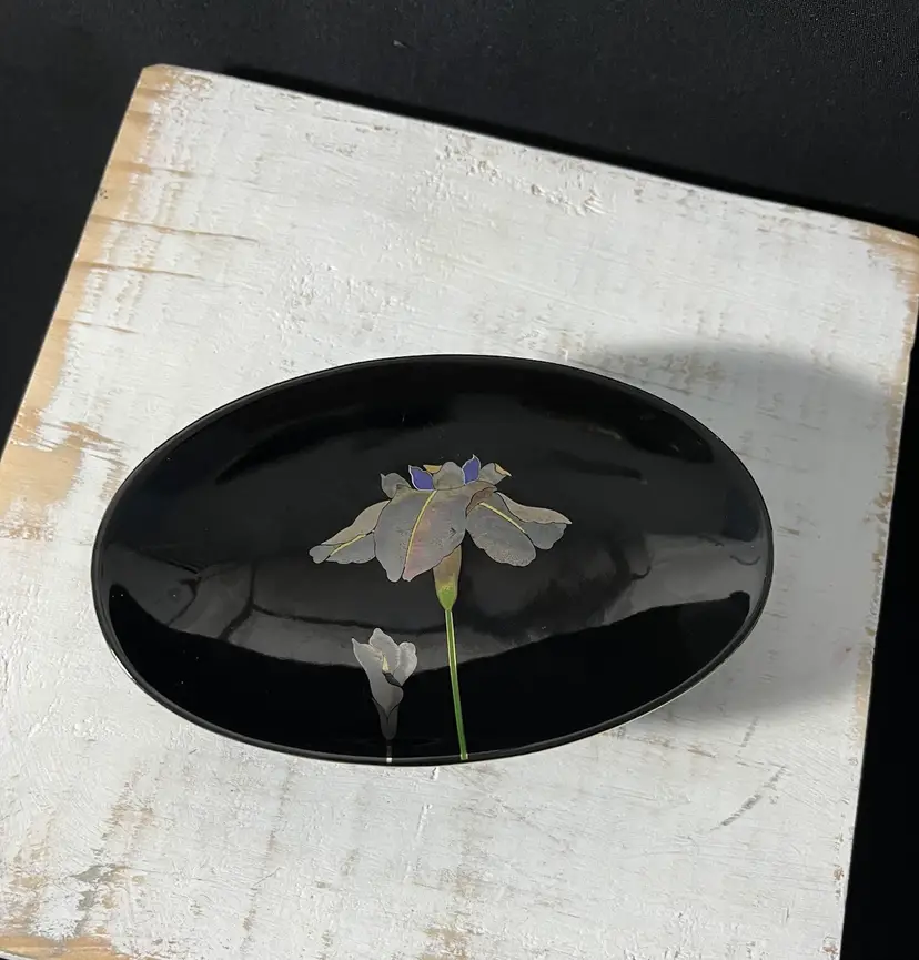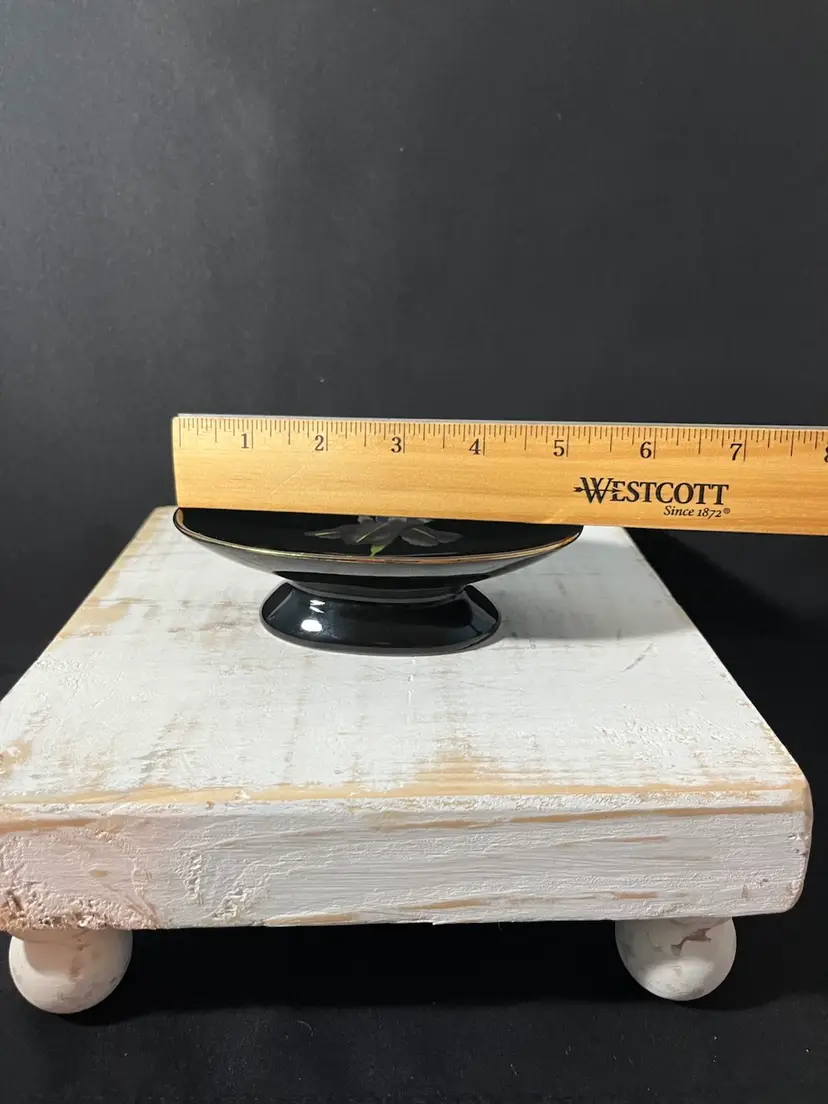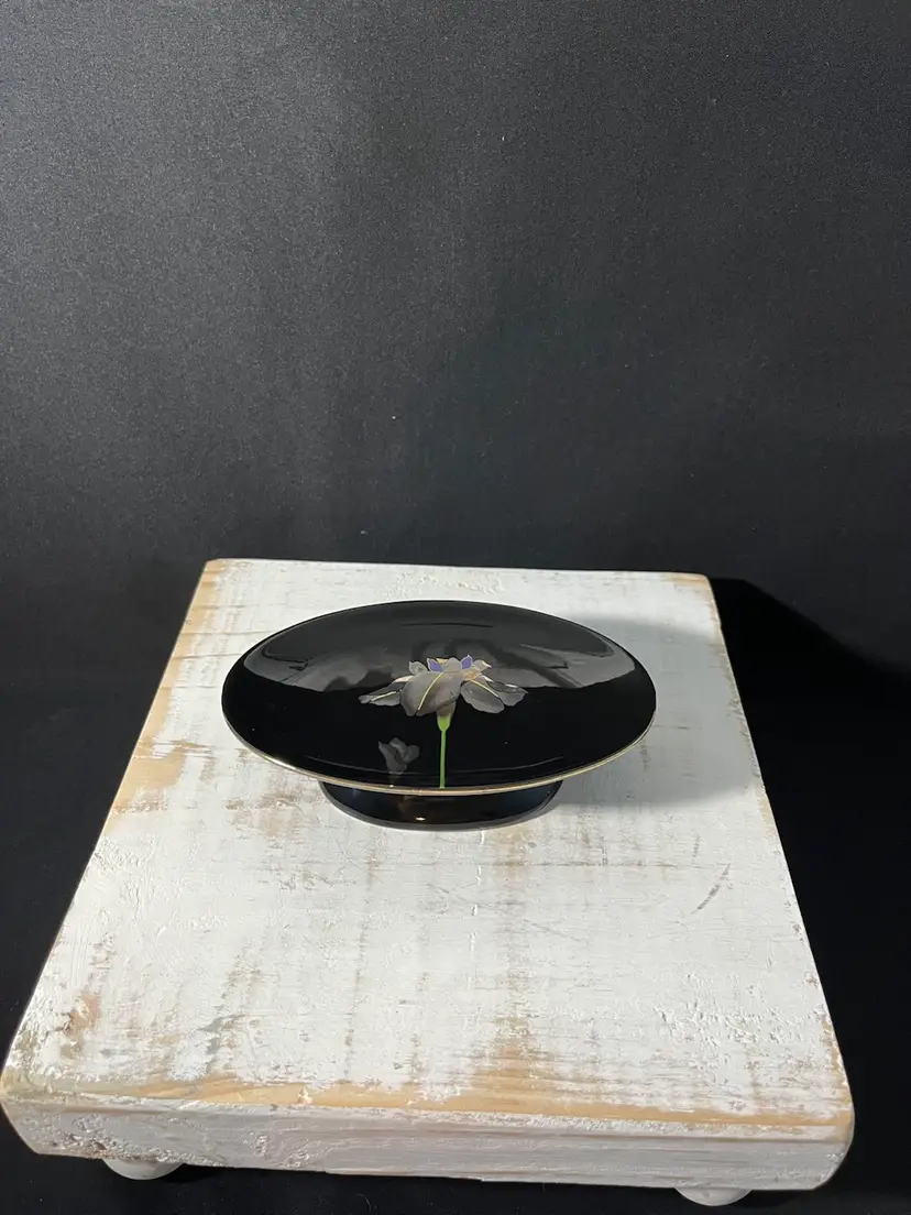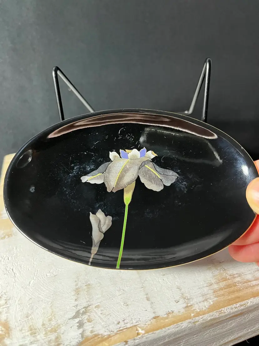 #1025 Black Otagiri Japan with inlay of Golden Iris Soap/Trinket Dish. Measures 1.5” x 5.25”. IT DOES HAVE SOME SCRATCHES AS SEEN IN LAST PHOTO.