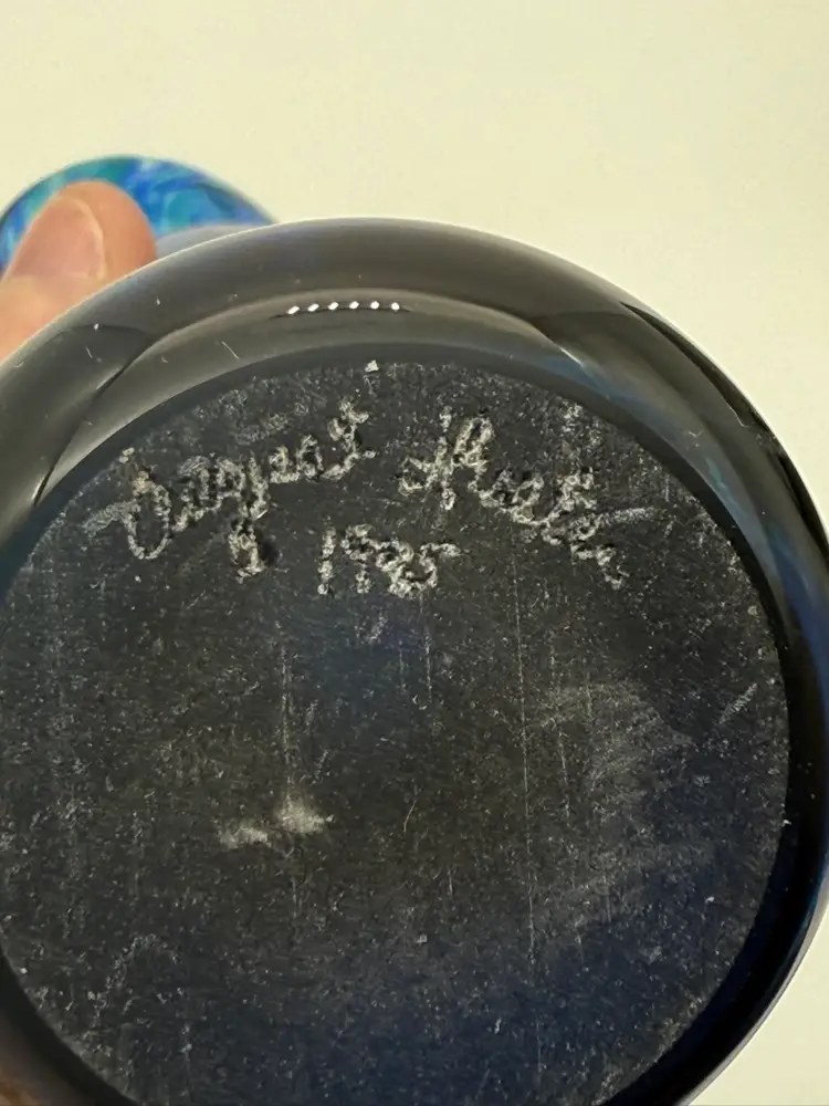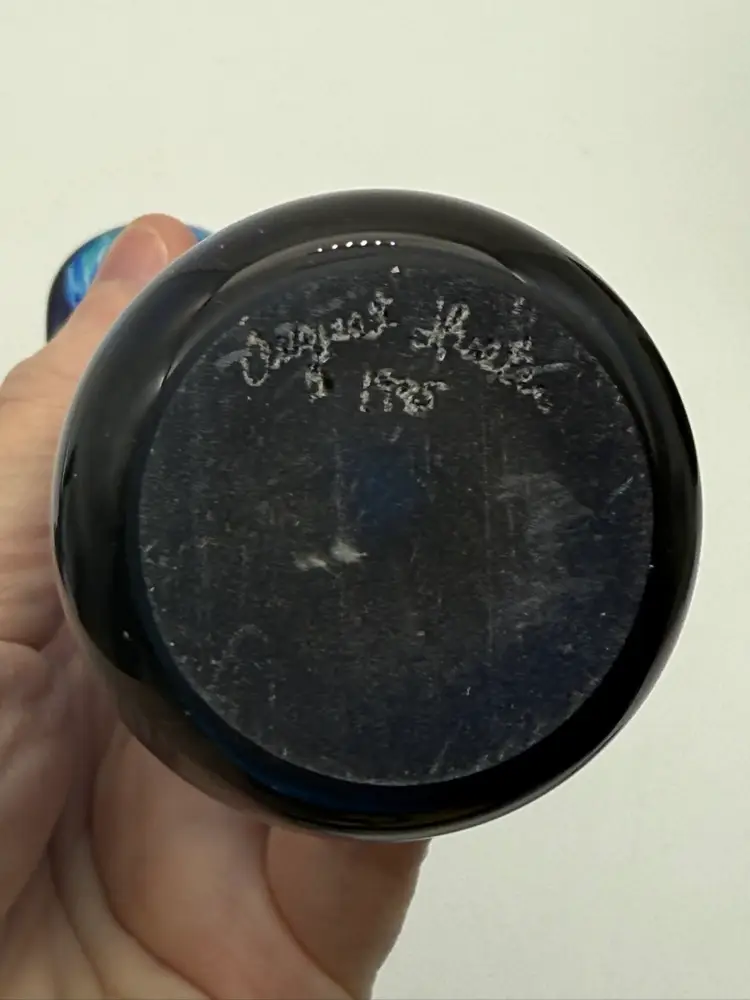 Measures 10.5” tall, 2.5” wide No chips or cracks Signed August Heuter 1995