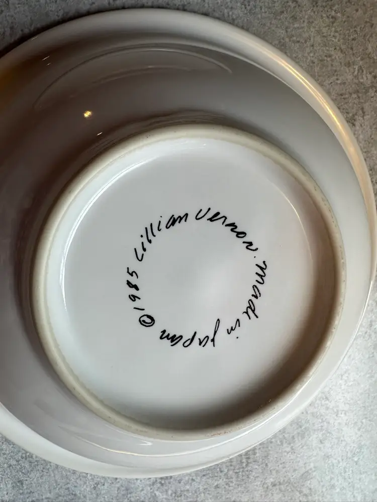 This children's dinnerware set was produced by Lillian Vernon, a popular mail-order catalog company, in 1985. The set features whimsical teddy bear illustrations, with one bear riding a tricycle on the plate and another on roller skates on the bowl. Cute set.