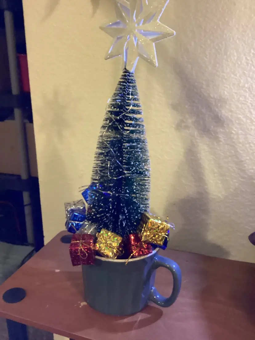 Lighted Christmas tree, with presents tumbling down a coffee cup.