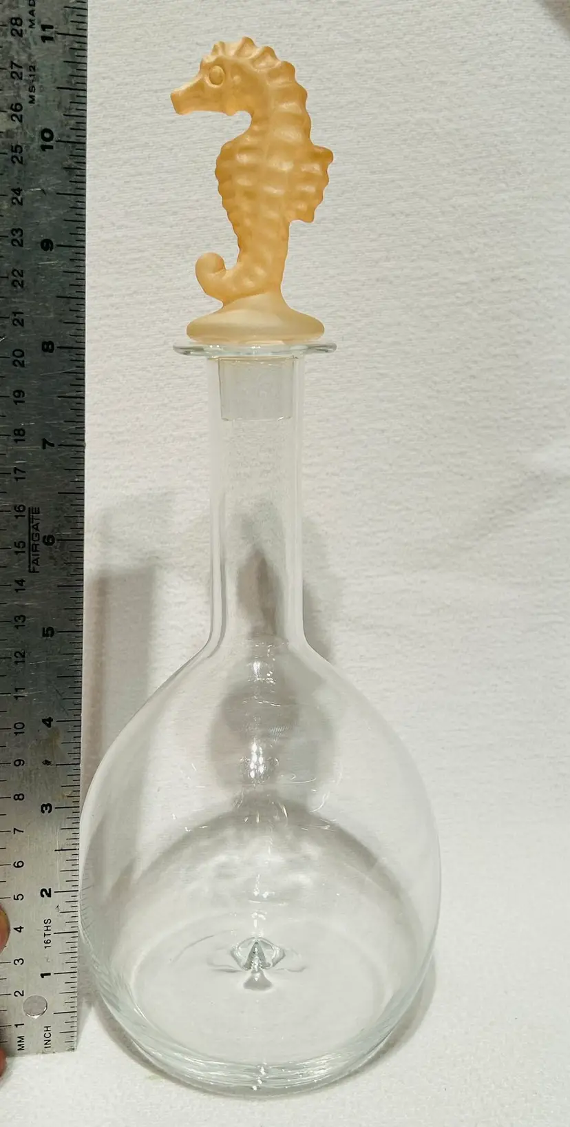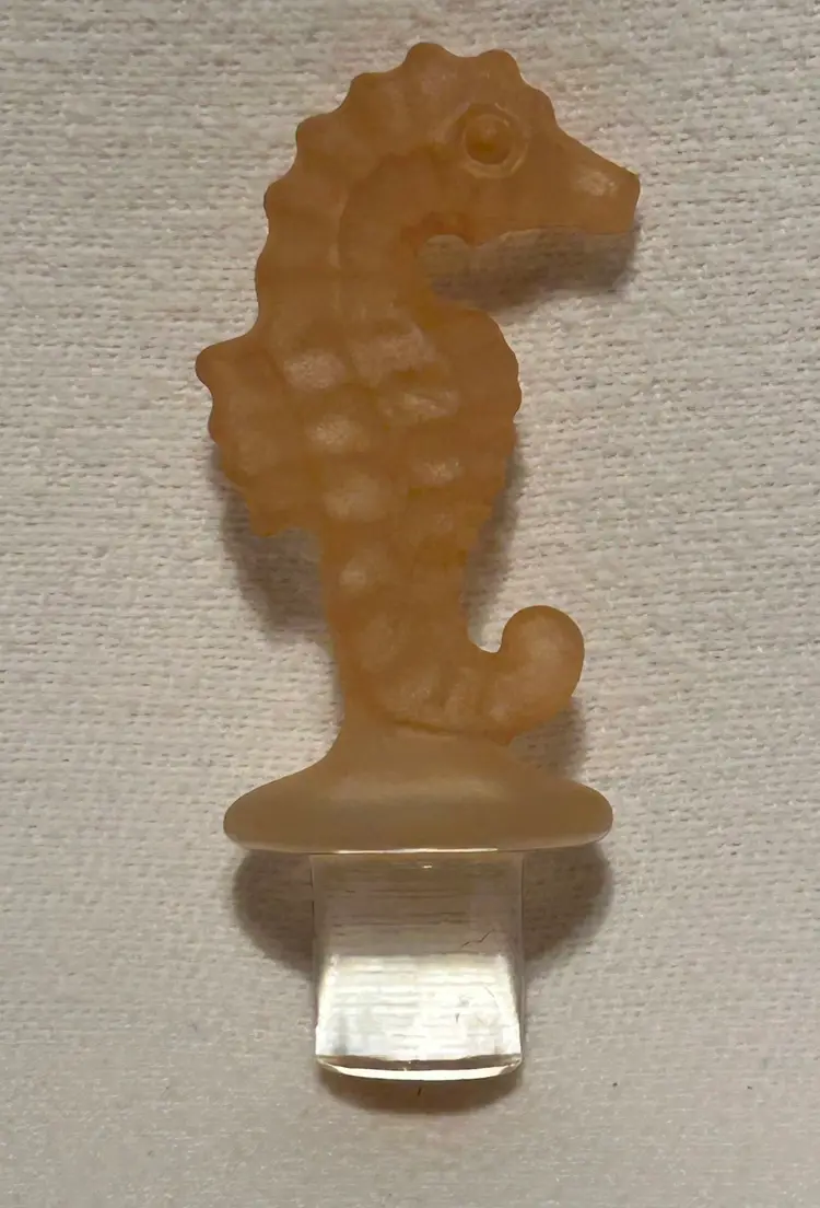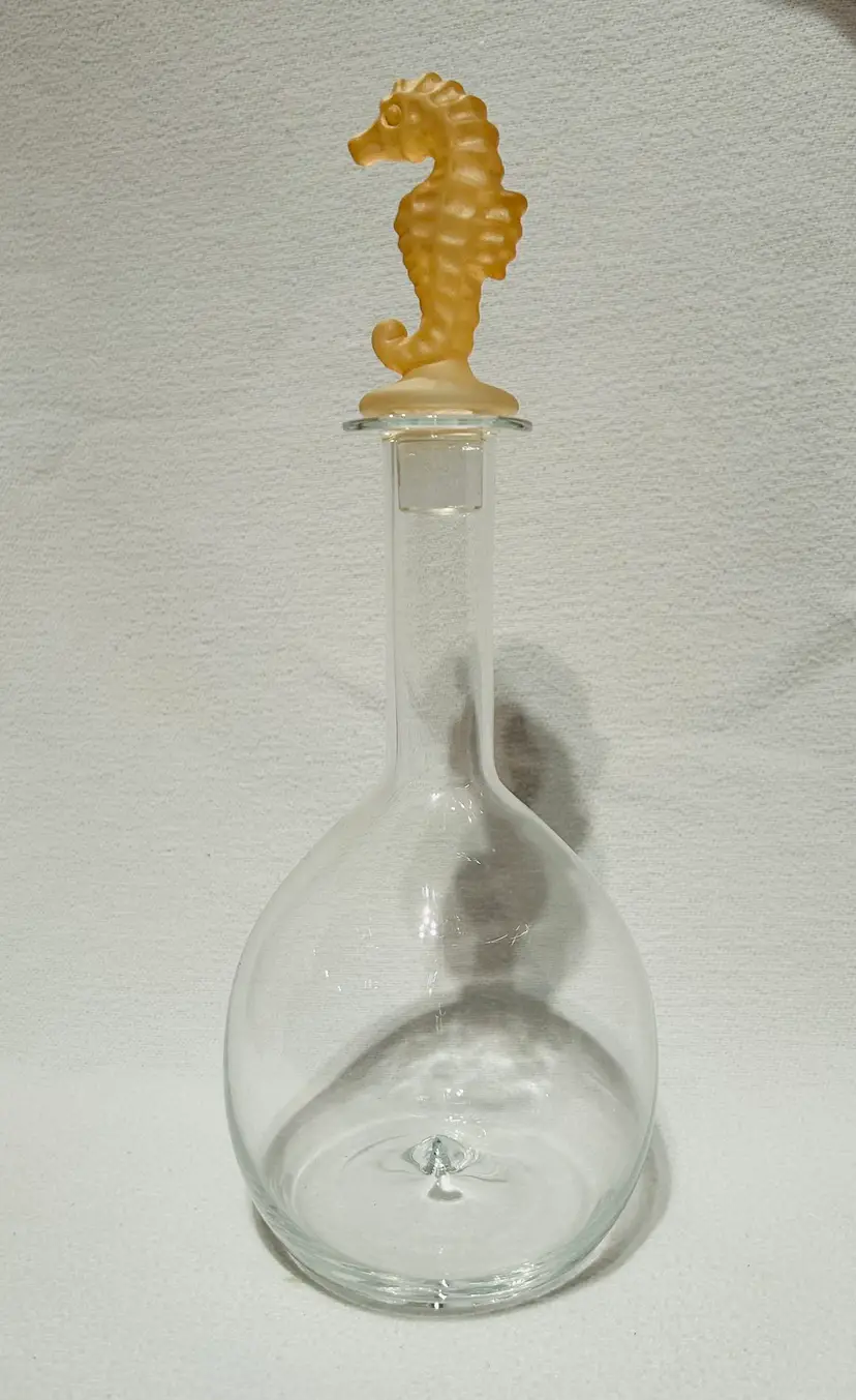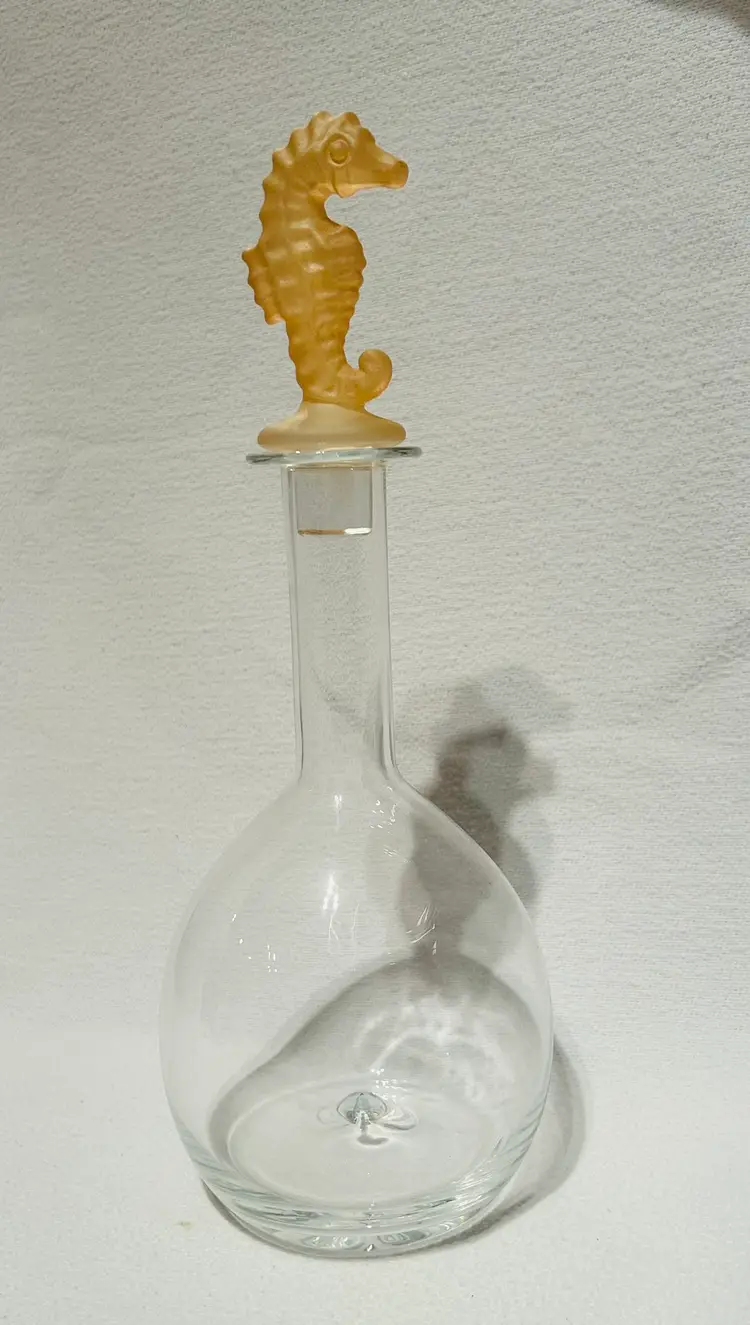 Clear Glass Decanter With A Peach Color Seahorse Crystal Stopper. 8” tall. No chips, no cracks.
