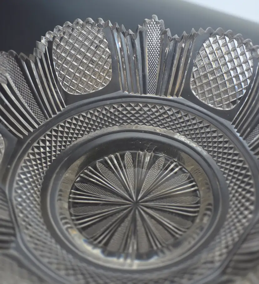10" in diameter 3.25" high. Fits 7" opening. In very good condition no chips cracks or cloudiness