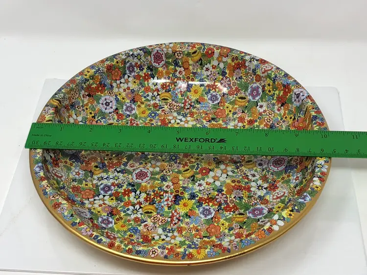 10" metal tray/bowl with floral design and round scalloped shape. Brass tone outside with no markings. Good condition.