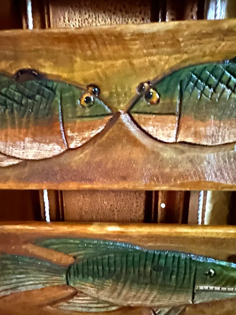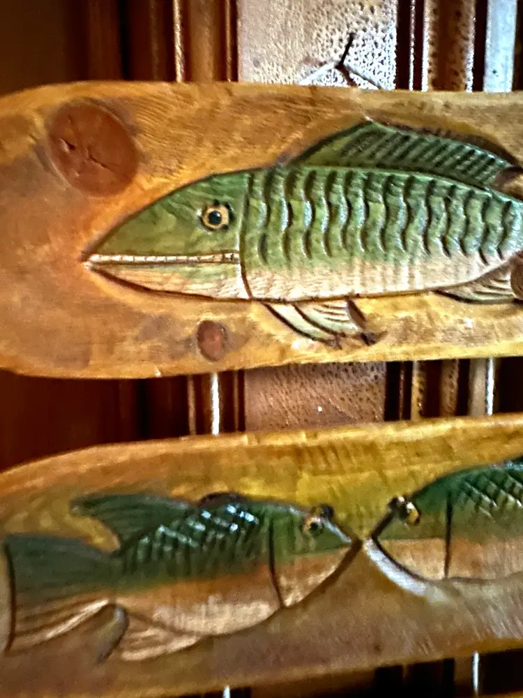 3 carvings of fish on pine all 3 signed Would be nice decor at the cabin 🍃