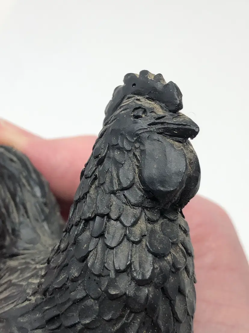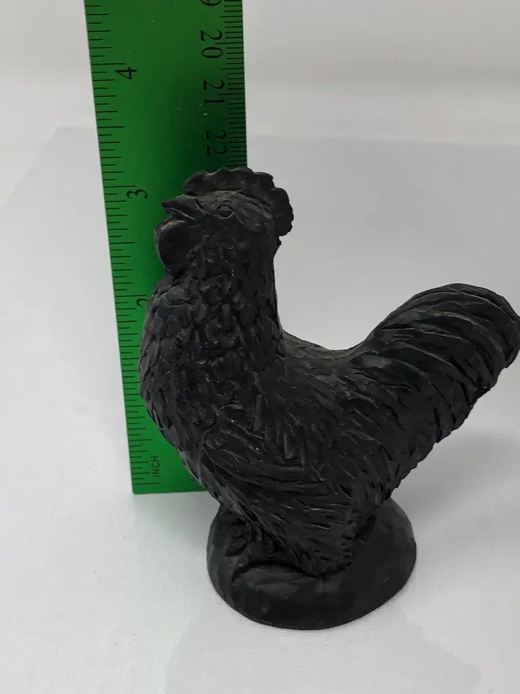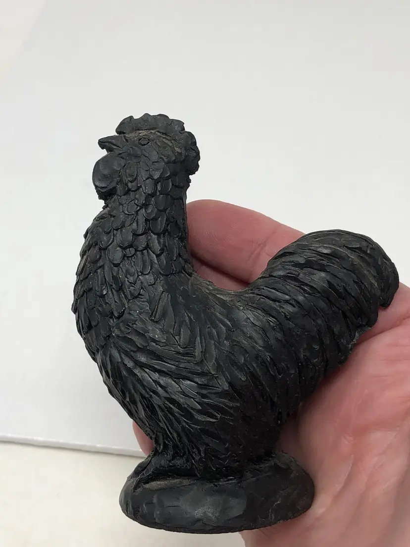 3" tall hand carved coal chicken on round base. Original label E. J. Mining Ltd. Made with British Coal. Excellent condition