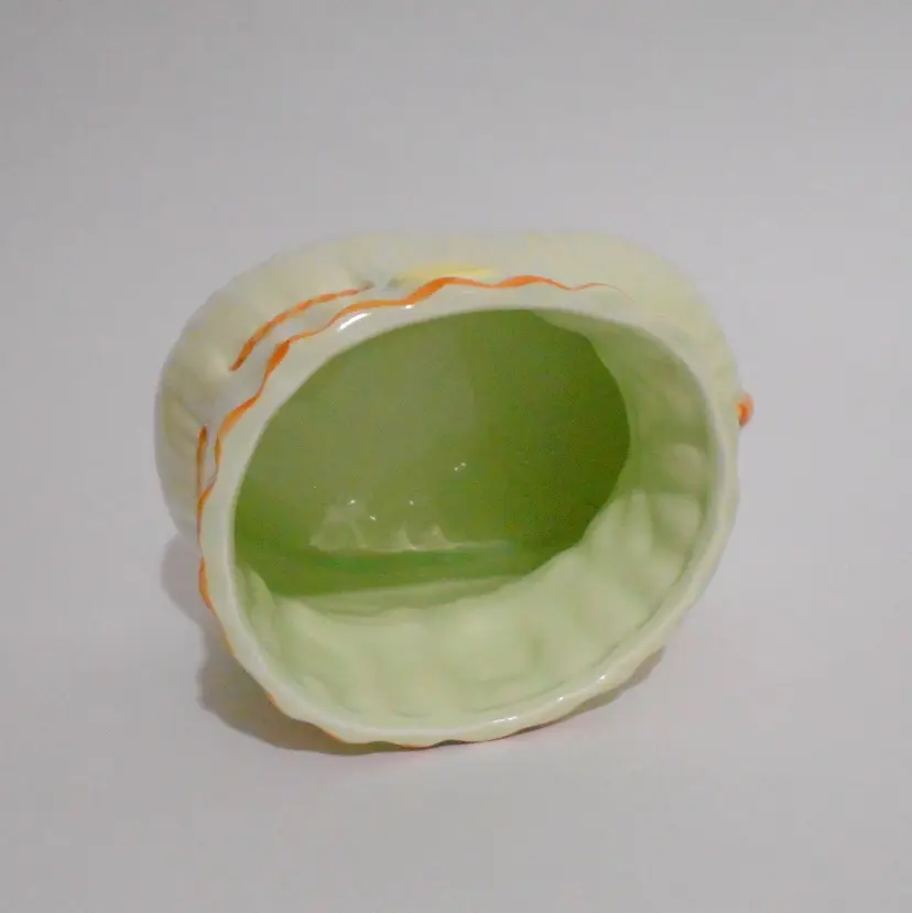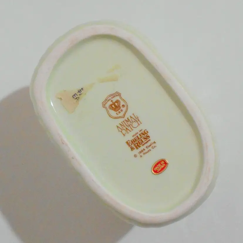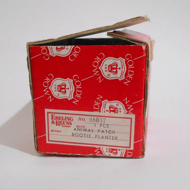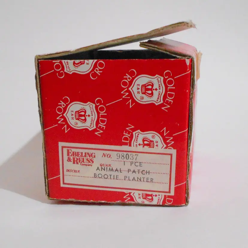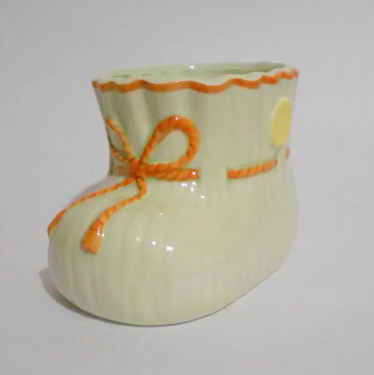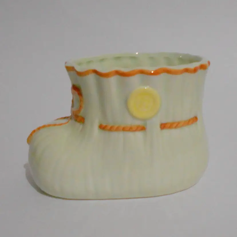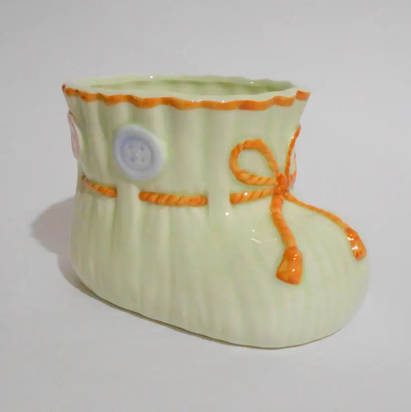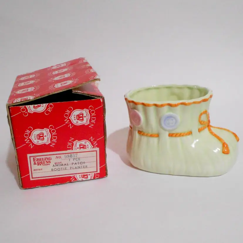 Ebeling & Reuss Golden Crown baby bootie planter. Part of the Animal Patch line from 1984. Green color, gender neutral, for boy or girl. Measures 3" tall x 5" long. Marked made in Japan on bottom. No chips or cracks. With original box.