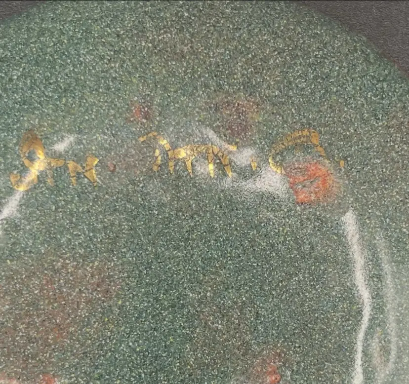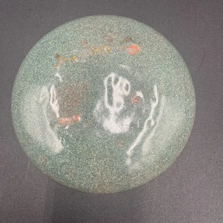 This is a sweet little piece of enamel on copper with artist signature. Price is reflective of where on the bottom. Top portion is in great condition. Artist signed with initials M. R. Artist M Ratcliff produced Art at Stone Mountain pottery in Georgia, which is now permanently closed. Please view all photos as they also service the items description. I believe this piece measures approximately just under 4 inches I can verify upon request.