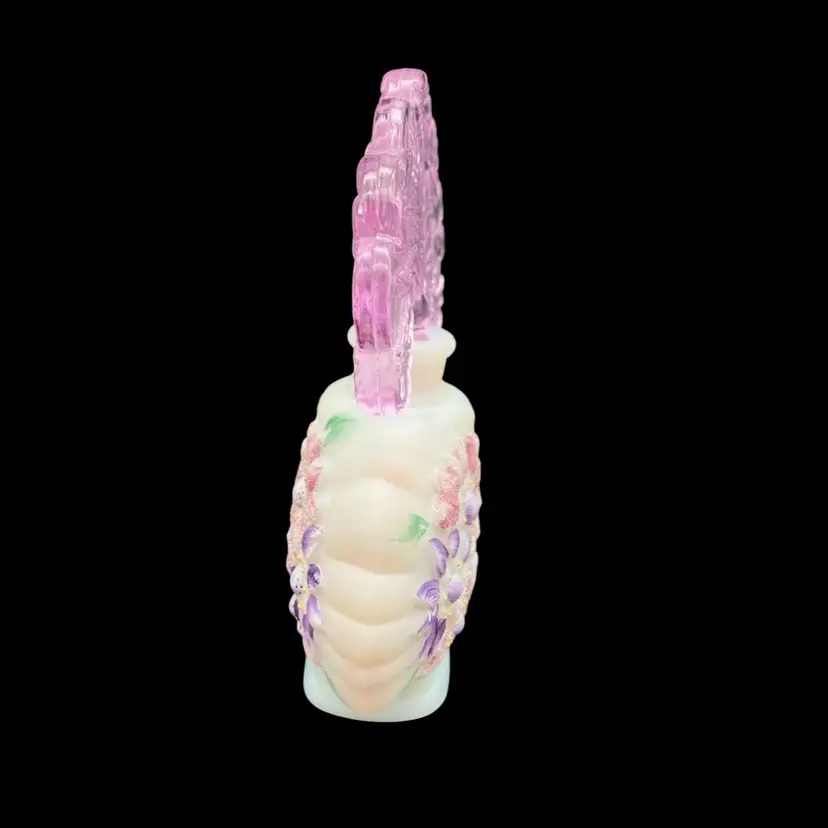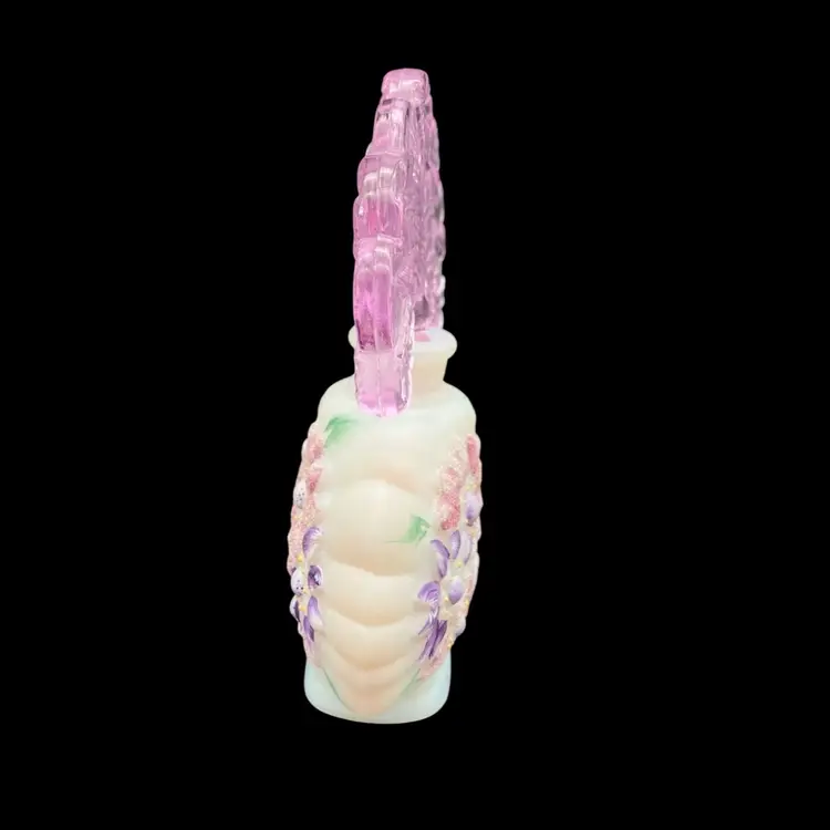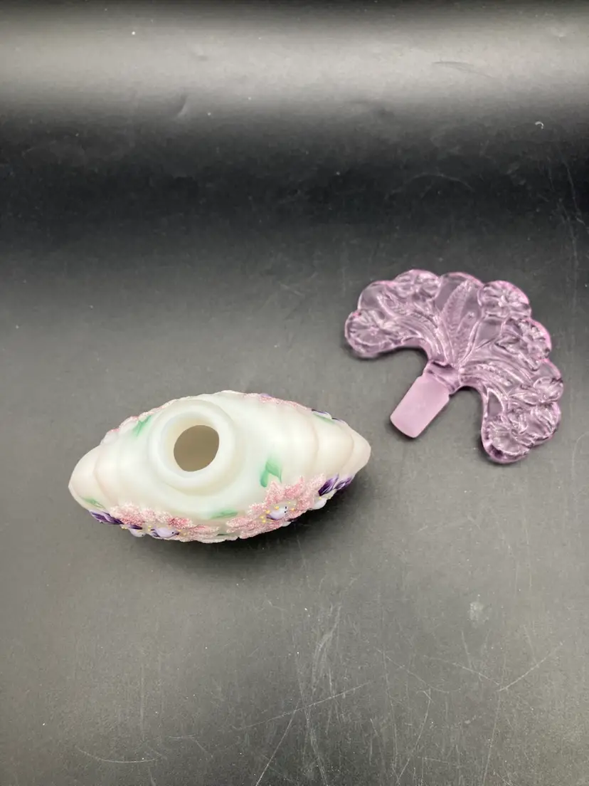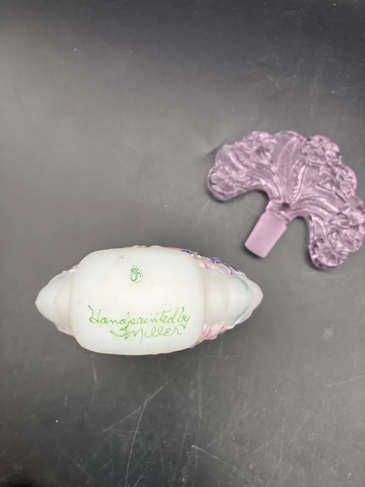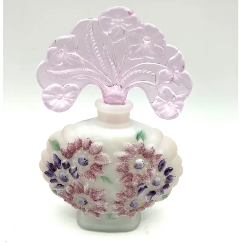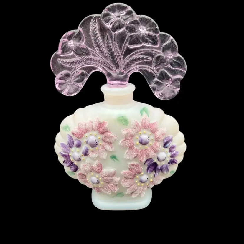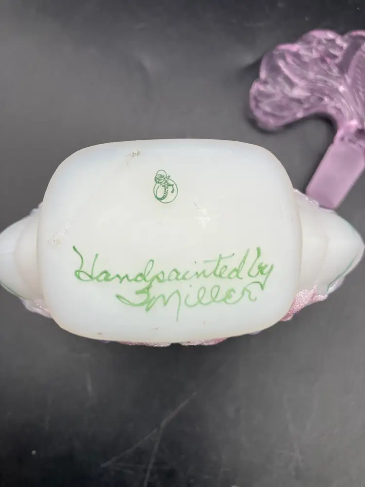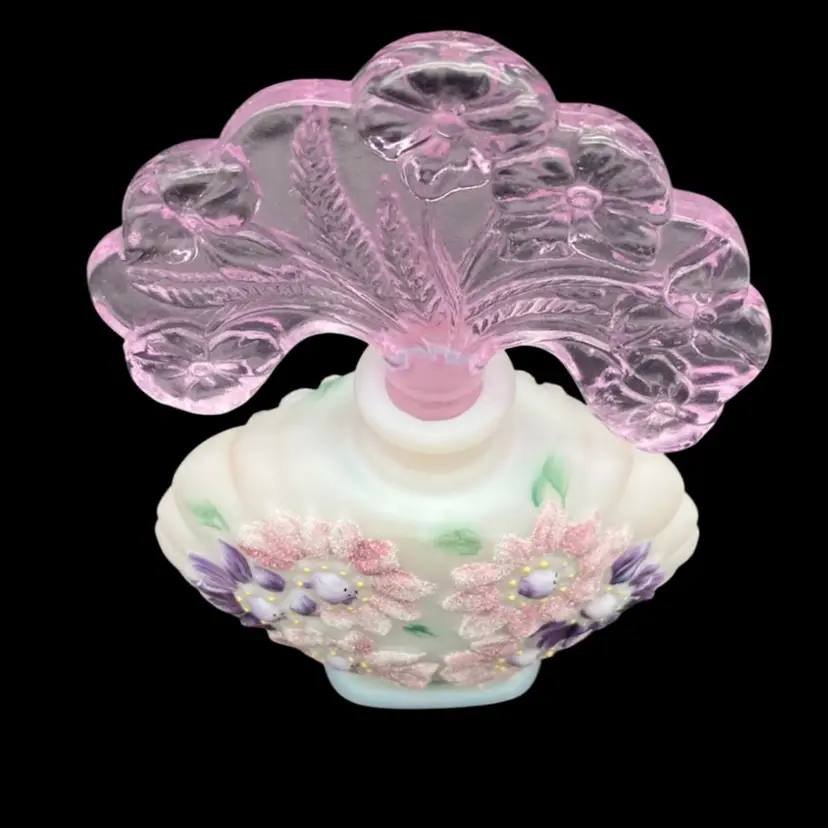 Handpainted by Fenton artist Sheena Miller. Measures 6” tall by 3.75” wide and 1.5” deep. Really beautiful. The stopper color is a purplish pink.