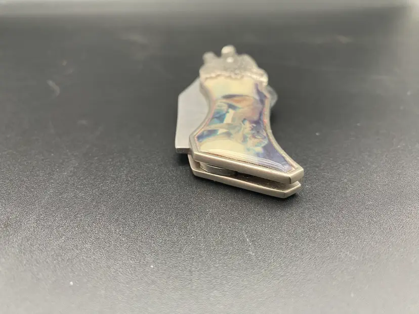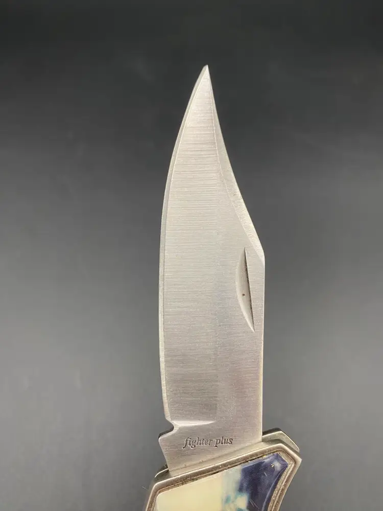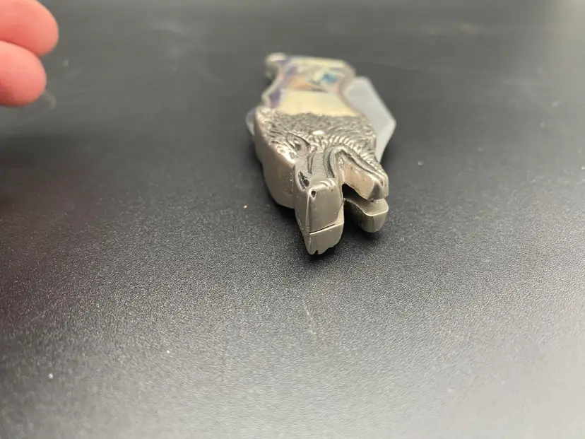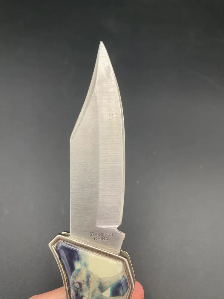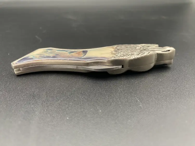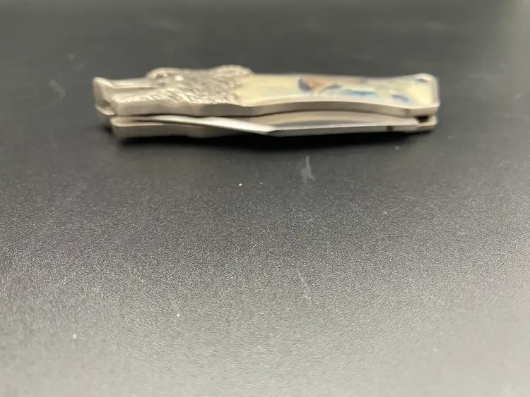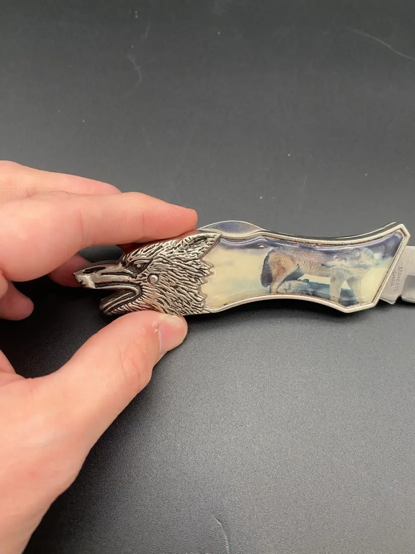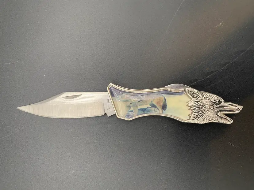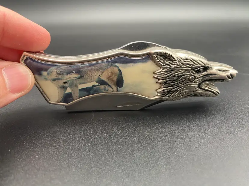 You are purchasing one Wolf Themed/Shaped Fighter Plus Stainless Steel Folding Knife. Blade is around 3.5 inches, Knife is 8 inches long when open. This Knife is in great condition with no cracks, bending or rusting of the material.