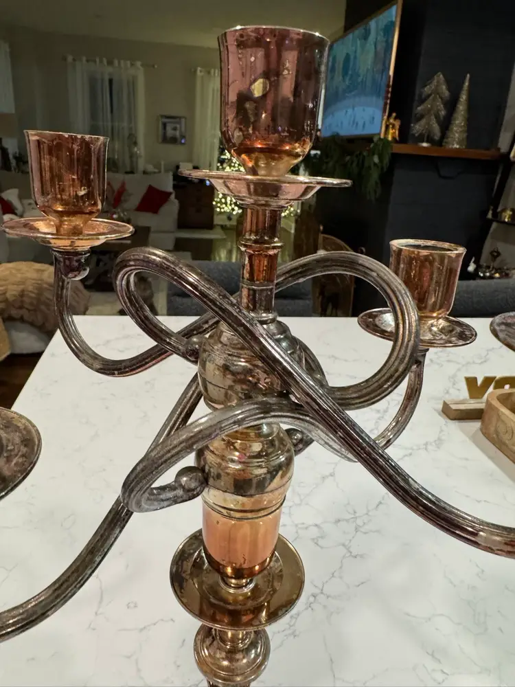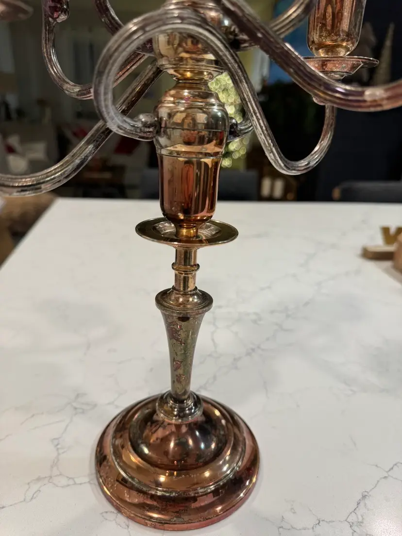 Elegant 5 candle mixed metal candelabra stand, measuring 13 inches in height. This impressive piece makes a striking centerpiece or decorative accent to any room. Its classic design allows it to complement any decor. Perfect for enhancing ambiance during dinners, holidays, or special occasions, creating a warm and inviting glow. .