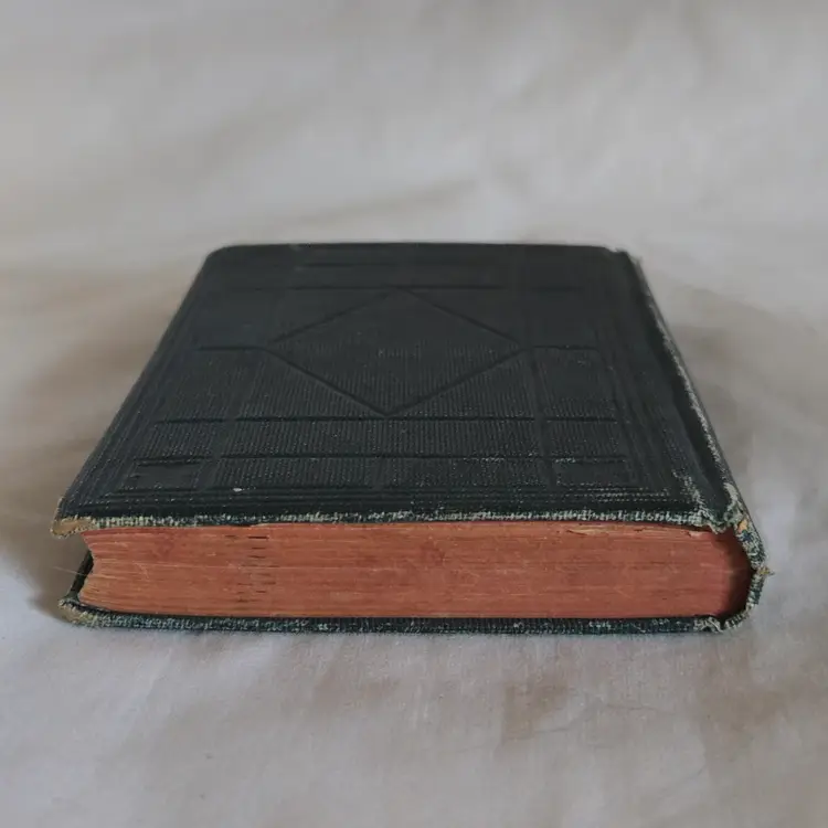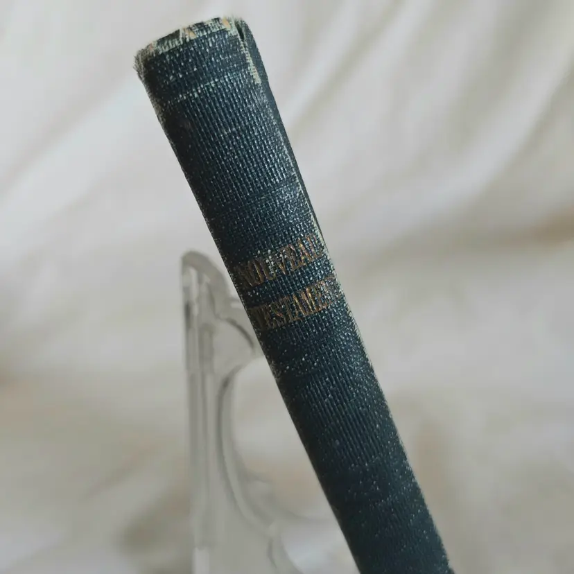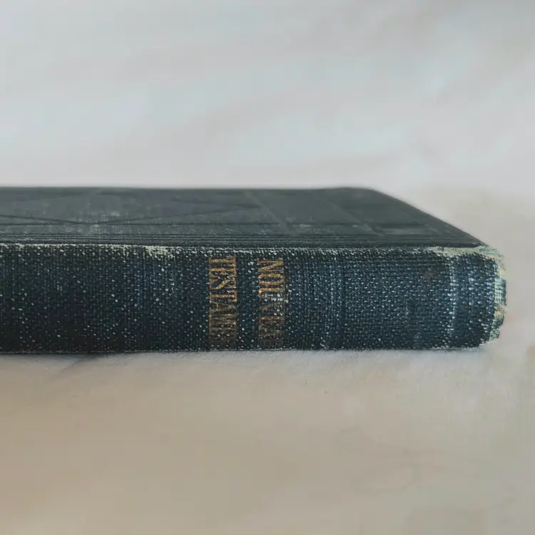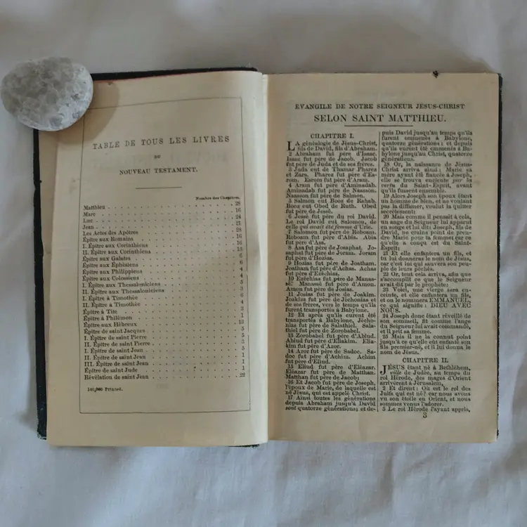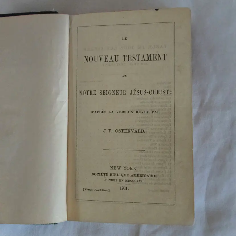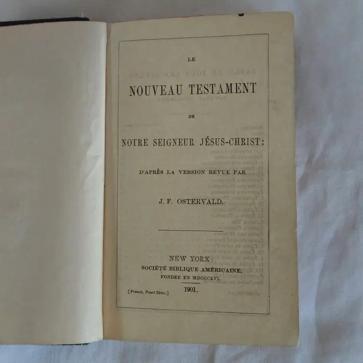 Pocket Size French New Testament 1901 printed New York by American Bible Society with Condition Issues. Used condition with edgewear, discoloration, writing, fading, falling apart, dirt, stains, spotting from extensive use. Photos are part of the description. Please view all the photos and please ask any questions prior to purchase when possible. NOTES: there may be color variations between these photos and actual item received due to lighting conditions. Both the book stand and the rock will NOT BE INCLUDED they are for presentation purposes only.