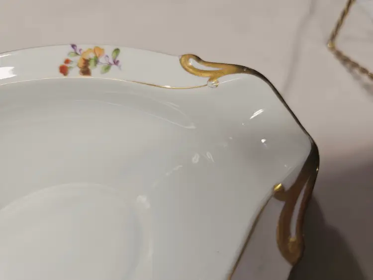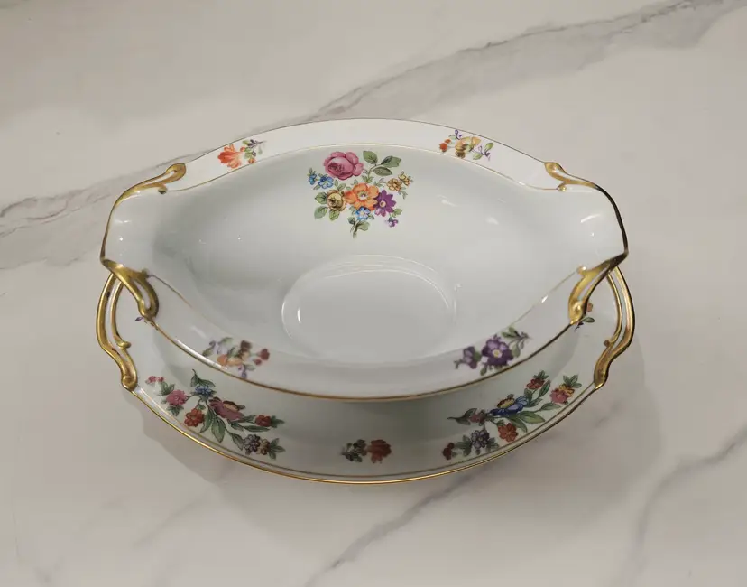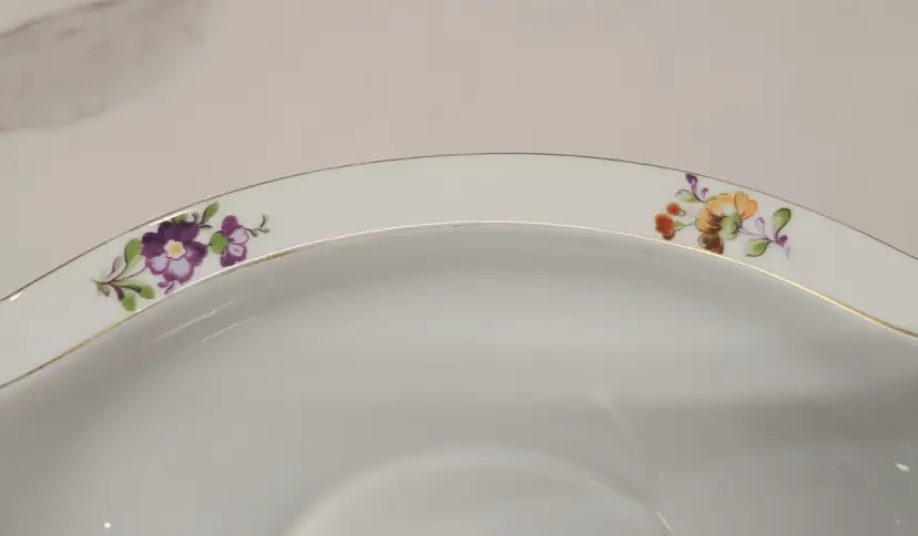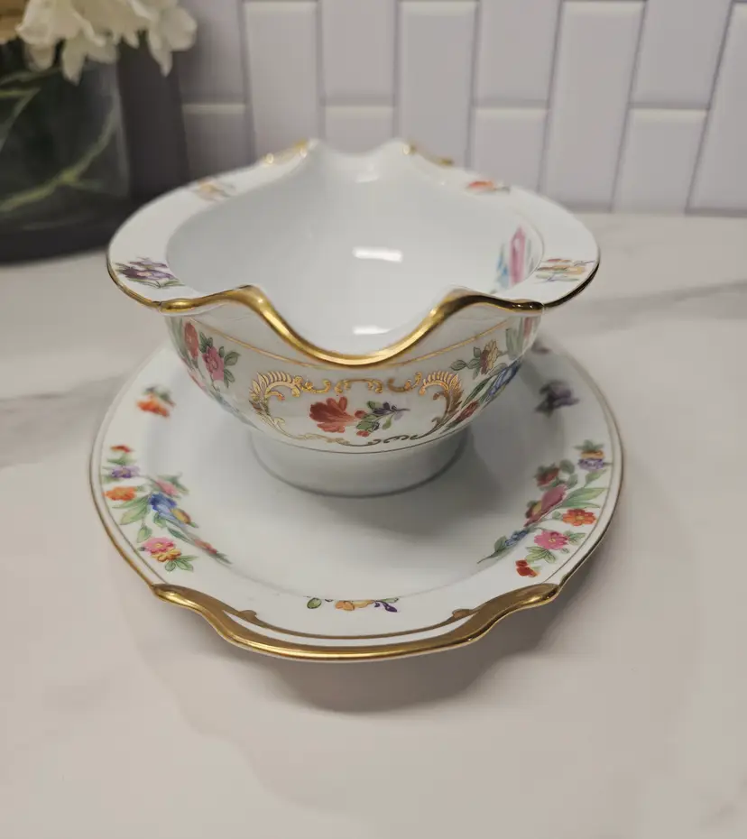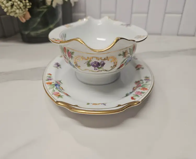 Description: This elegant gravy boat with attached underplate from Noritake’s Dresalda collection features a vibrant floral motif in rich pinks, purples, and greens, accented with delicate gold trim. The ornate design and graceful curves evoke classic formal dining, making it a standout piece for collectors or anyone seeking to add a touch of vintage refinement to their table. Crafted in Occupied Japan, it reflects Noritake’s renowned craftsmanship and attention to detail during a historically significant era. The attached underplate ensures stability and ease of serving, while the intricate pattern and gilded edges elevate everyday meals into special occasions.