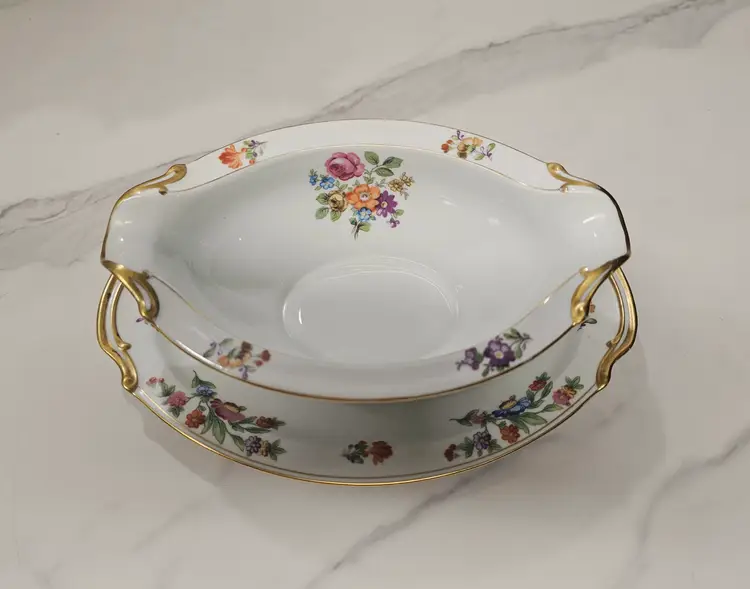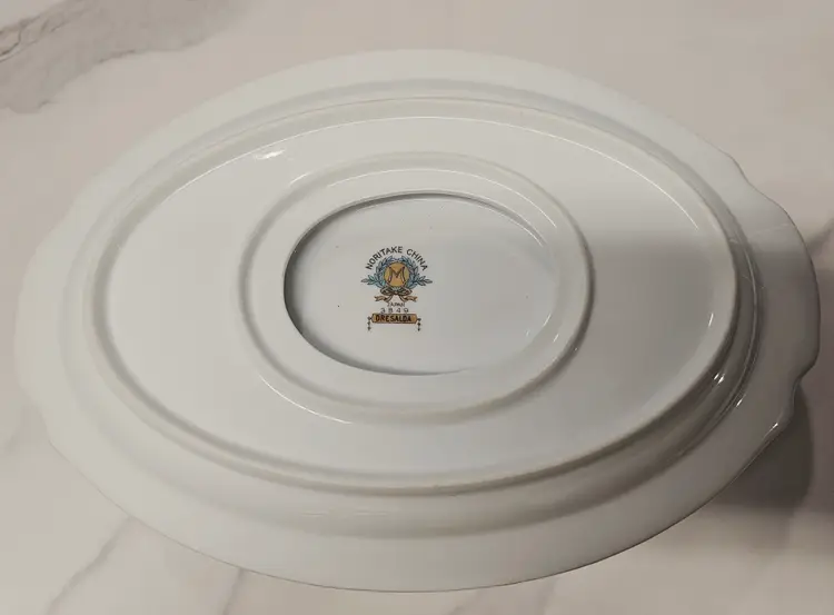 Made by: Noritake Pattern: Dresalda (Discontinued) Place of Origin: Occupied Japan / Japan Type of China: Gravy Boat with Attached Underplate Measurement: Length: 9 in Markings: SEE PIC Condition: Used,slight wear to gold trim see pic