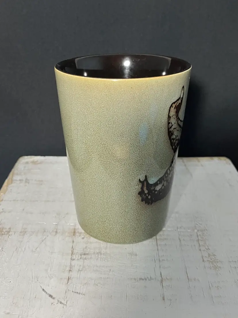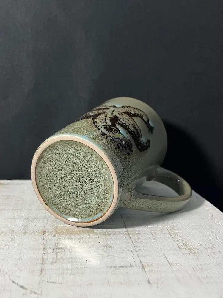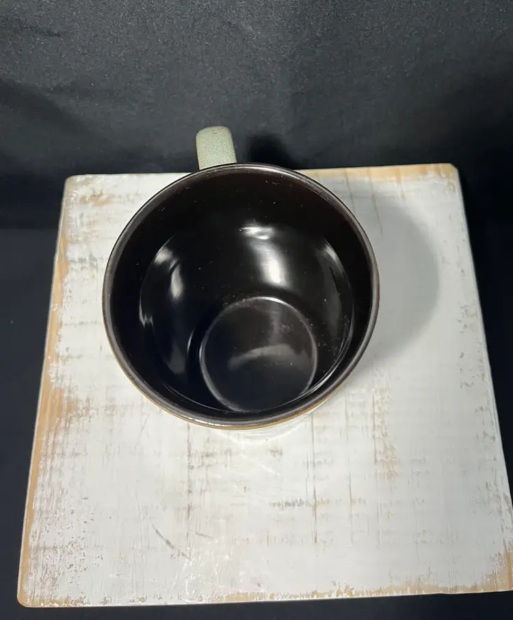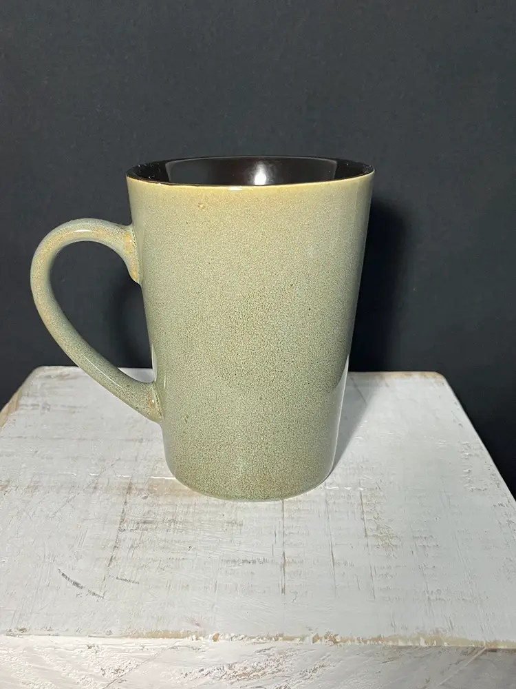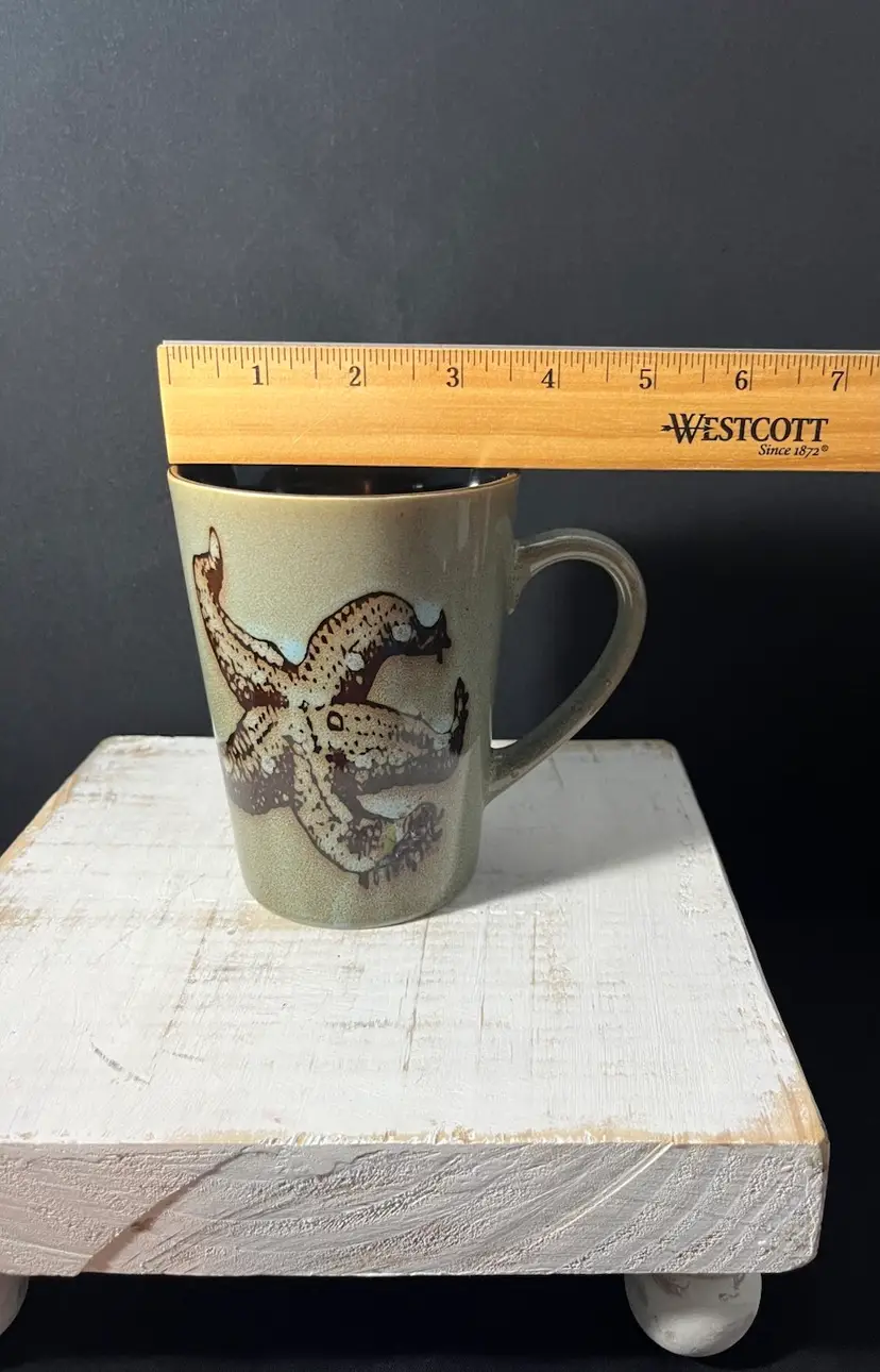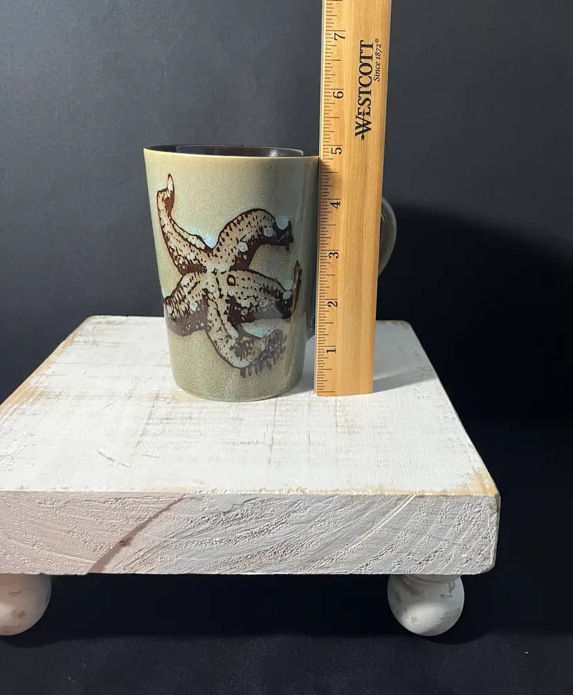 #1052 Green Ceramic Coffee Mug With Starfish on one side, brown inside. Measures 5” x 3.5”. No chips or cracks.