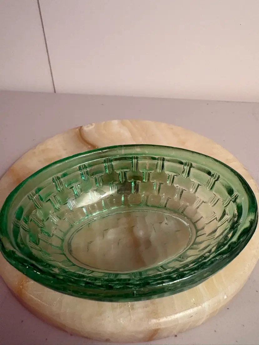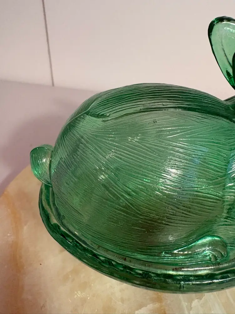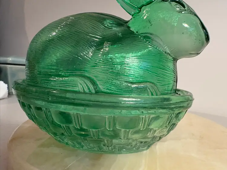 This Green Glass Rabbit Bunny in a basket Trinket Box / Candy Dish by Candy is a beautifully crafted glass piece perfect for storing small trinkets or candies, especially during the Easter season. The lush green color and rabbit design add a whimsical touch to any table décor or collection. Standing at 4 1/4 inches tall and 5 inches long, this boxed item is a charming addition to your holiday and seasonal décor. Made of glass, this piece is both functional and aesthetically pleasing, making it a lovely choice for any home.