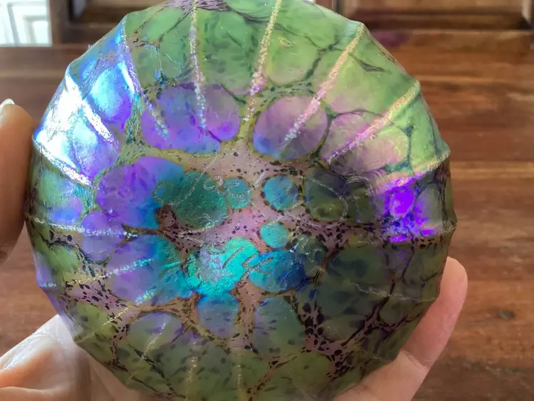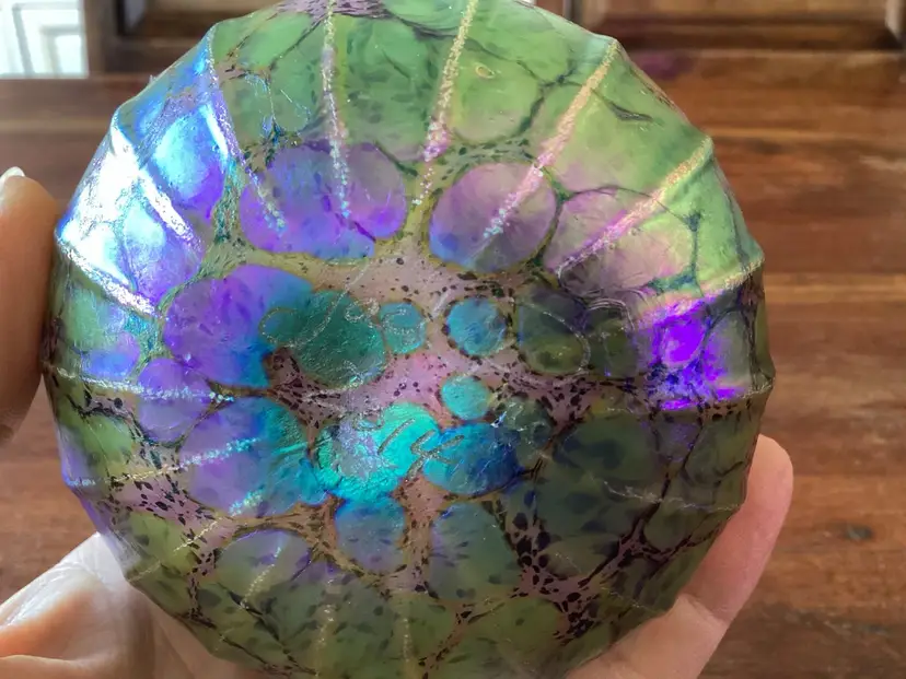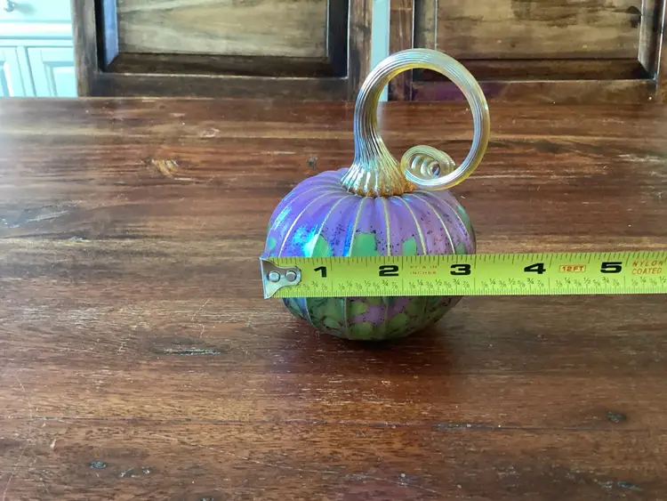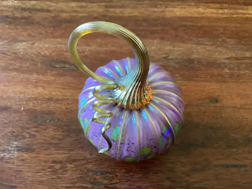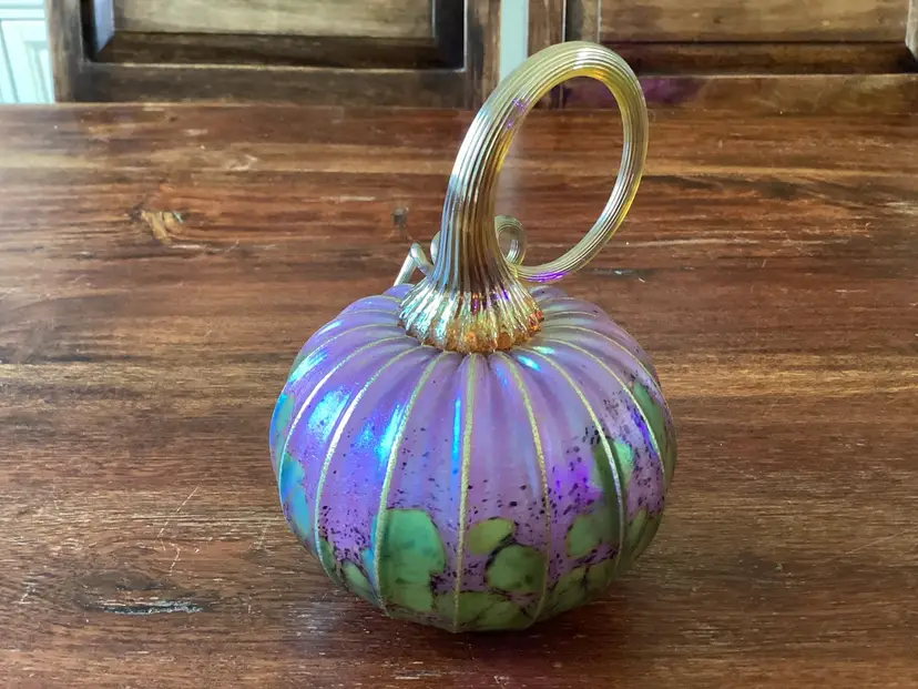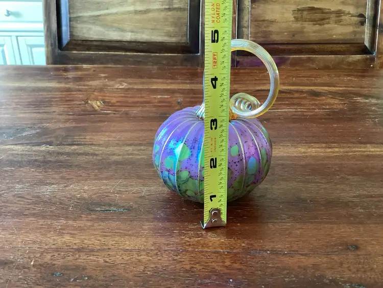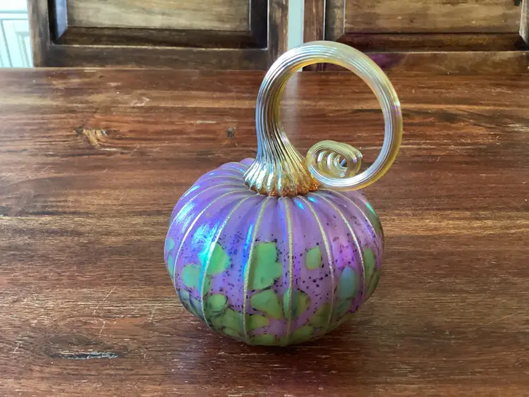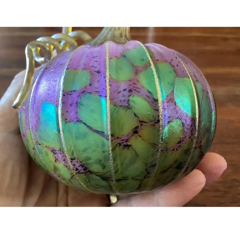 This artwork pumpkin is handblown signed by Jack Pike? and dated 2014. It stands approximately 4 3/4 inches tall and is 3 inches across the widest part of the pumpkin. There are no condition issues noted. It has a beautiful green fluorescent speckled pattern on the purple with a golden amber stem.
