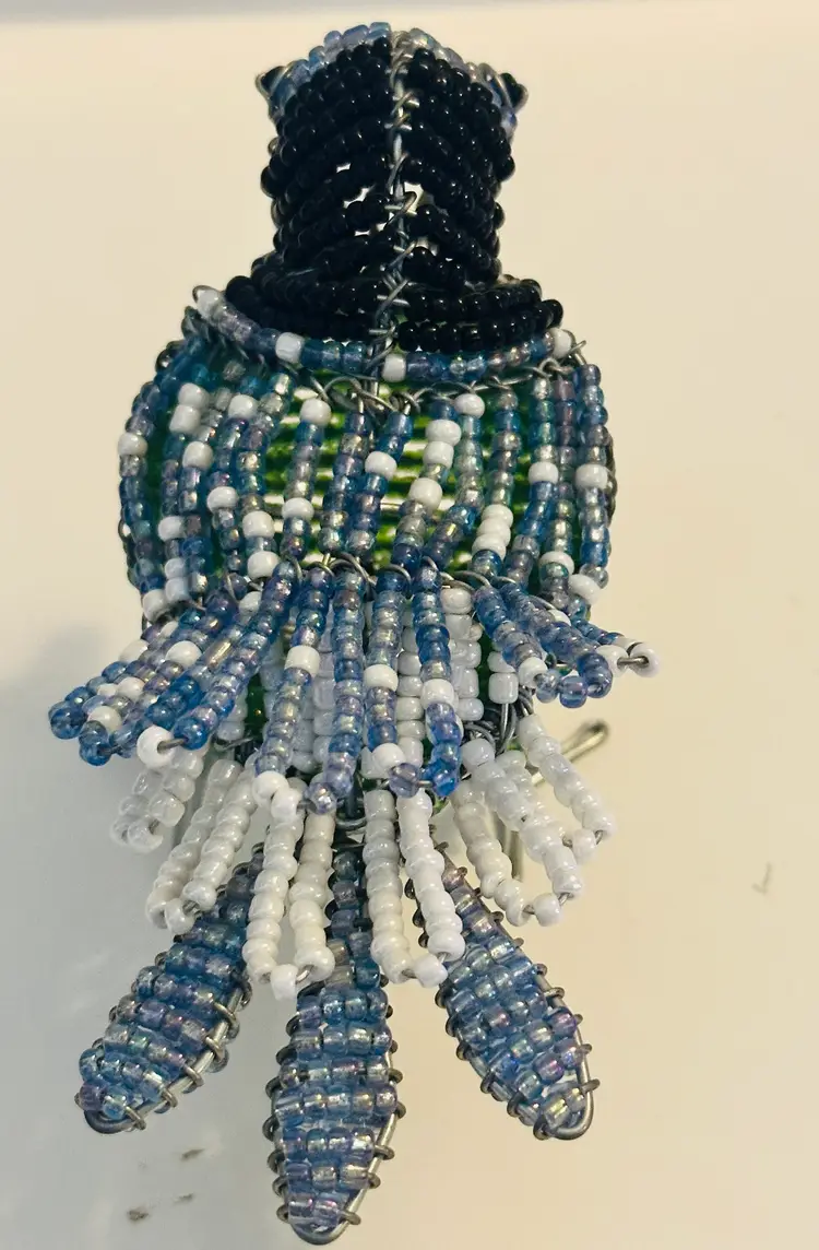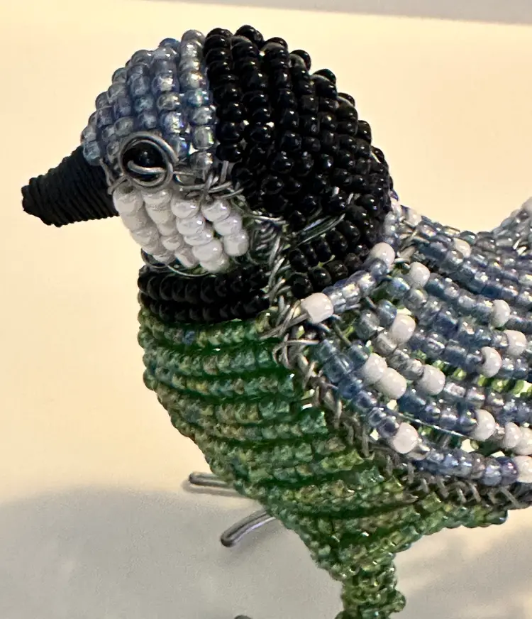 Delve into the charm of handcrafted artistry with this unique bead and wire figurine, featuring a delightful bird. The piece elegantly blends green, black, blue, and white hues to create a visually stunning representation of avian beauty. Measuring at 5 inches by 3 1/2 inches, it's the perfect size to accent any space without overwhelming it. Crafted with meticulous attention to detail, this figurine showcases the skill of an unknown artisan who brought this piece to life with their hands. It stands as a testament to the timeless appeal of handcrafted items and is a lovely addition to any collection or as a standalone display piece.