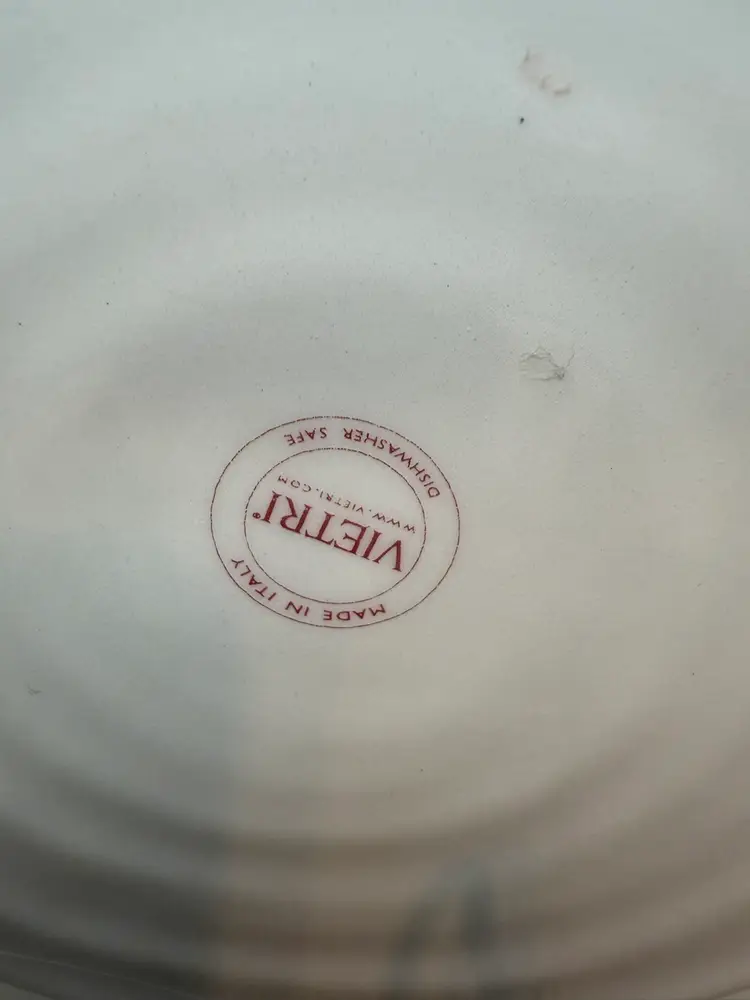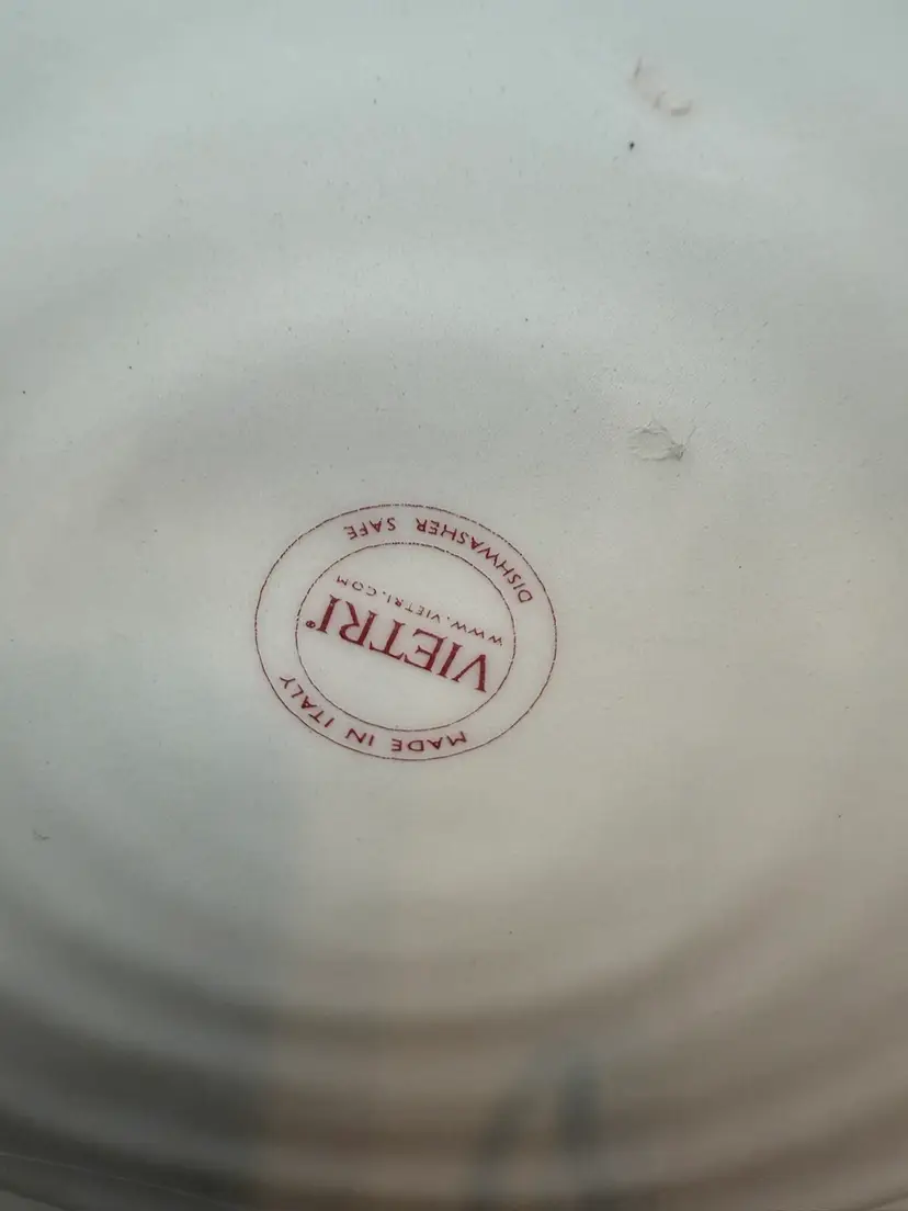 Vietri is a renowned company that imports and distributes Italian-made tableware and home decor. This particular platter, part of the "Old St. Nick Outdoorsman" series, showcases a charming, hand-painted interpretation of Santa Claus. The artistic style, characterized by its free-flowing lines and rustic aesthetic, is typical of artisanal ceramics. The crackled glaze finish adds a vintage feel, making it a desirable piece for collectors and those who appreciate unique holiday decorations. Note some crazing
