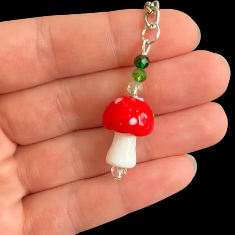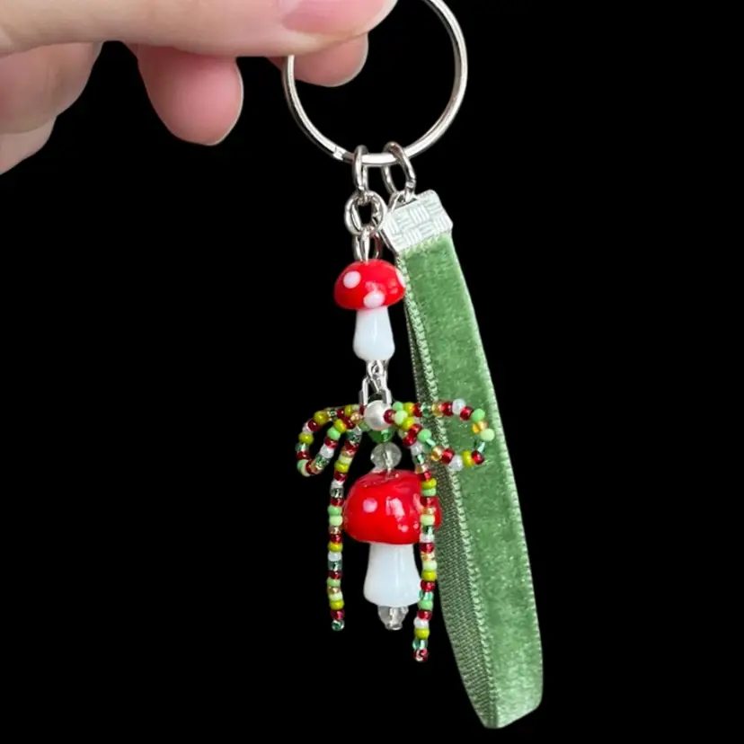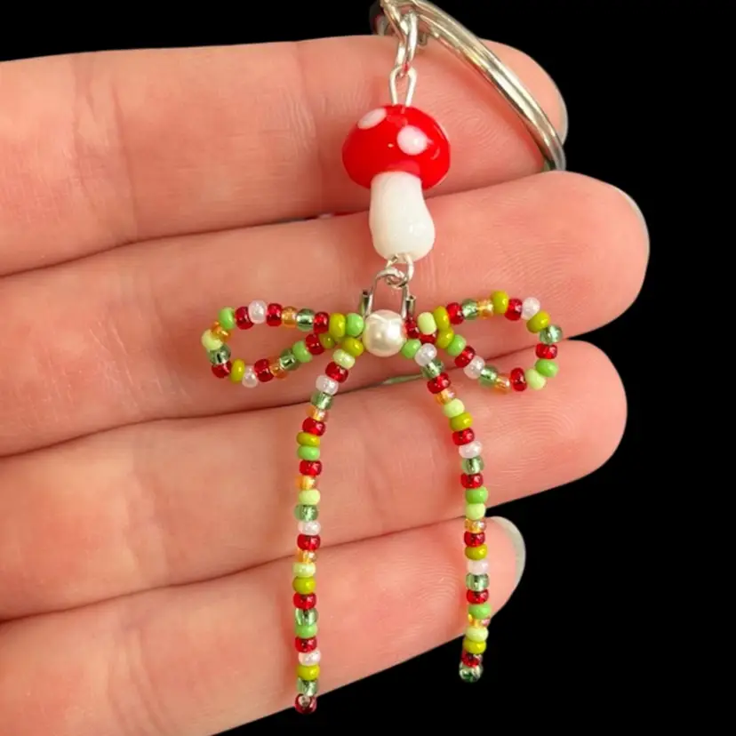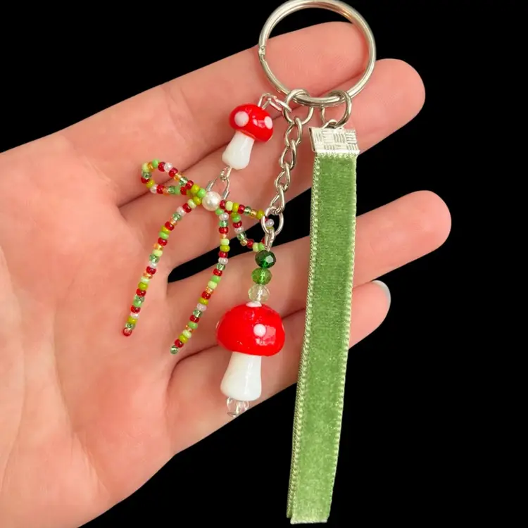 Handmade By Me - Glass Mushroom Charm And Green & Red Seed Bead Bow Keychain With Velvet Ribbon, Handmade Mushroom Keychain, Handmade Mushroom Bag Charm, Glass Mushroom Charm, Seed Bead Bow Charm, NN Artist, Handmade Keychain, Handmade Bag Charm, Glass Mushroom Bag Charm With Velvet Ribbon